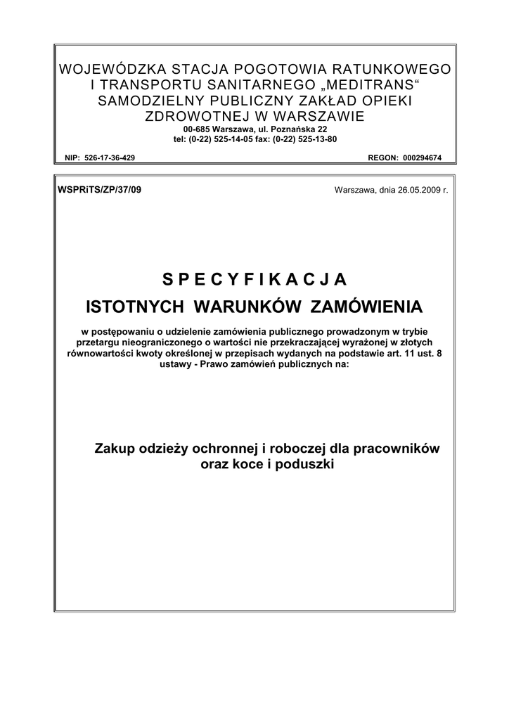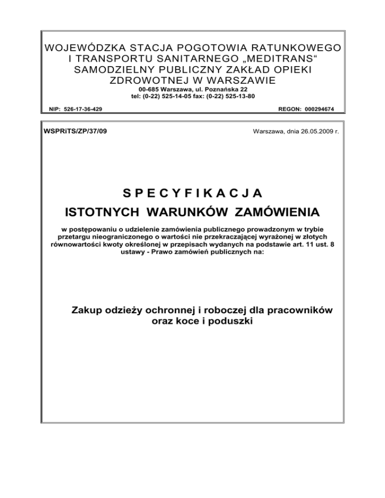 WOJEWÓDZKA STACJA POGOTOWIA RATUNKOWEGO I TRANSPORTU SANITARNEGO „MEDITRANS“ SAMODZIELNY PUBLICZNY ZAKŁAD OPIEKI ZDROWOTNEJ W WARSZAWIE 00-685 Warszawa, ul. Poznańska 22 tel: (0-22) 525-14-05 fax: (0-22) 525-13-80 NIP: 526-17-36-429 WSPRiTS/ZP/37/09 REGON: 000294674 Warszawa, dnia 26.05.2009 r. SPECYFIKACJA ISTOTNYCH WARUNKÓW ZAMÓWIENIA w postępowaniu o udzielenie zamówienia publicznego prowadzonym w trybie przetargu nieograniczonego o wartości nie przekraczającej wyraŜonej w złotych równowartości kwoty określonej w przepisach wydanych na podstawie art. 11 ust. 8 ustawy - Prawo zamówień publicznych na: Zakup odzieŜy ochronnej i roboczej dla pracowników oraz koce i poduszki WOJEWÓDZKA STACJA POGOTOWIA RATUNKOWEGO I TRANSPORTU SANITARNEGO „MEDITRANS” 00-685 Warszawa, ul. Poznańska 22 tel: (0-22) 525-14-05 fax: (0-22) 525-13-80 Rozdział I INFORMACJE OGÓLNE I. INFORMACJA O ZAMAWIAJĄCYM Zamawiającym jest Wojewódzka Stacja Pogotowia Ratunkowego i Transportu Sanitarnego „MEDITRANS” Samodzielny Publiczny Zakład Opieki Zdrowotnej, z siedzibą w Warszawie ul. Poznańska 22, 00-685 Warszawa. Tel: / 0-22/ 525-14-05 Fax: / 0-22/ 525-13-80 II. TRYB UDZIELENIA ZAMÓWIENIA I WARTOŚĆ ZAMÓWIENIA Postępowanie o udzielenie zamówienia publicznego prowadzone jest w trybie przetargu nieograniczonego o wartości nie przekraczającej wyraŜonej w złotych równowartości kwoty określonej w przepisach wydanych na podstawie art. 11 ust. 8 ustawy z dnia 29 stycznia 2004 r. – Prawo zamówień publicznych (Dz. U. z 2007 Nr 223 poz. 1655). III. OFERTY CZĘŚCIOWE, WARIANTOWE, RÓWNOWAśNE, UZUPEŁNIAJĄCE 1. KaŜdy Wykonawca ma prawo złoŜyć tylko jedną ofertę. 2. Zamawiający dopuszcza moŜliwość składania ofert częściowych. 3. Zamawiający nie dopuszcza moŜliwości składania ofert wariantowych w rozumieniu art.2 pkt 7 ustawy – Prawo zamówień publicznych. 4. Zgodnie z art. 67 ust. 1 pkt 7 ustawy – Prawo zamówień publicznych, Zamawiający moŜe udzielić zamówienia z wolnej ręki w przypadku udzielenia, w okresie 3 lat od udzielenia zamówienia podstawowego, dotychczasowemu Wykonawcy dostaw, zamówień uzupełniających, stanowiących nie więcej niŜ 20% wartości zamówienia podstawowego i polegających na rozszerzeniu dostawy, jeŜeli zmiana wykonawcy powodowałaby konieczność nabywania rzeczy o innych parametrach technicznych, co powodowałoby niekompatybilność techniczną lub nieproporcjonalnie duze trudności techniczne w uzytkowaniu i dozorze. IV. FORMA PRZEKAZYWANIA POSTĘPOWANIU INFORMACJI, OŚWIADCZEŃ I DOKUMENTÓW W 1. Oświadczenia, protesty, rozstrzygnięcia protestów, wnioski, zawiadomienia oraz informacje zamawiający i wykonawcy przekazują faksem z zastrzeŜeniem pkt. 2. 2. Forma pisemna zastrzeŜona jest dla złoŜenia oferty wraz z załącznikami, w tym oświadczeń i dokumentów potwierdzających spełnianie warunków udziału w postępowaniu oraz oświadczeń i dokumentów potwierdzających spełnianie przez oferowany przedmiot zamówienia wymagań określonych przez zamawiającego, a takŜe zmiany lub wycofania oferty. 3. Wykonawca potwierdza niezwłocznie fakt otrzymania oświadczenia, wniosku, zawiadomienia lub informacji poprzez podpisanie pierwszej strony dokumentu i jej odesłanie na faks zamawiającego. V. OSOBY UPRAWNIONE DO KONTAKTÓW Z WYKONAWCAMI Osobą uprawnioną do kontaktu z Wykonawcami jest: imię i nazwisko: Halina Królik Godziny pracy Działu Zamówień Publicznych: 8.00 – 15.00 tel.: 0 22 52 – 51 – 243 fax: 0 22 52 – 51 – 279 e-mail: [email protected] VI. PODWYKONAWCY Zamawiający nie dopuszcza powierzenia wykonania zamówienia podwykonawcom. Rozdział II OPIS PRZEDMIOTU ZAMÓWIENIA I TERMIN WYKONANIA I. PRZEDMIOT ZAMÓWIENIA Przedmiotem niniejszego zamówienia jest zakup odzieŜy ochronnej i roboczej dla pracowników oraz koce i poduszki których rodzaj oraz ilości zostały szczegółowo określone w załączniku nr 1 do specyfikacji istotnych warunków zamówienia (SIWZ). 2 WOJEWÓDZKA STACJA POGOTOWIA RATUNKOWEGO I TRANSPORTU SANITARNEGO „MEDITRANS” 00-685 Warszawa, ul. Poznańska 22 tel: (0-22) 525-14-05 fax: (0-22) 525-13-80 Zadanie nr 1. OdzieŜ ochronna – Kod CPV: 35113400-3 Zadanie nr 2. OdzieŜ robocza – Kod CPV: 18100000-0 Zadanie nr 3. Koce, poduszki – Kod CPV: 39143114-8 Dostawca na ryzyko i koszt własny winien dostarczyć przedmiot zamówienia do Zamawiającego. Gwarancja na oferowany przedmiot zamówienia – 12 miesięcy II. TERMIN WYKONANIA ZAMÓWIENIA do 21 dni od daty podpisania umowy Rozdział III WYSOKOŚĆ I ZASADY WNIESIENIA WADIUM I. WADIUM Zamawiający nie wymaga wniesienia wadium. Rozdział IV WARUNKI UDZIAŁU W POSTĘPOWANIU, OFERTA ORAZ DOKUMENTY WYMAGANE OD WYKONAWCY I. WARUNKI UDZIAŁU W POSTĘPOWANIU O udzielenie zamówienia ubiegać się mogą Wykonawcy, którzy: 1. spełniają warunki określone w art. 22 ust.1 ustawy, tj.: 1) posiadają uprawnienia do wykonywania określonej działalności objętej przedmiotem niniejszego zamówienia, 2) posiada niezbędną wiedzę i doświadczenie oraz dysponuje potencjałem technicznym i osobami zdolnymi do wykonania zamówienia lub przedstawi pisemne zobowiązanie innych podmiotów do udostępnienia potencjału technicznego i osób zdolnych do wykonania zamówienia, 3) znajdują się w sytuacji ekonomicznej i finansowej zapewniającej wykonanie zamówienia, 4) nie podlegają wykluczeniu z postępowania, wg obowiązujących przepisów ustawy Prawo Zamówień Publicznych; II. WYMOGI FORMALNE OFERTY 1. Oferta musi spełniać następujące wymogi: a) treść oferty musi odpowiadać treści specyfikacji i zostać sporządzona wg formularza ofertowego stanowiącego załącznik do niniejszej Specyfikacji; b) oferta musi zostać sporządzona w języku polskim w formie pisemnej, na maszynie do pisania, komputerze lub inną trwałą i czytelną techniką; c) oferta i załączone do niej oświadczenia i dokumenty, wymagane prze