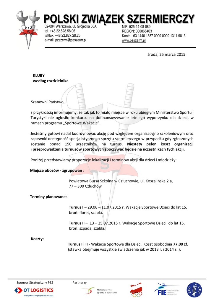 POLSKI ZWIĄZEK SZERMIERCZY 02-094 Warszawa, ul. Grójecka 65A tel. +48.22.828.58.06 tel/fax. +48.22.827.28.25 e-mail: [email protected] NIP: 525-14-08-089 REGON: 000866403 Konto: 63 1440 1387 0000 0000 1311 9813 www.pzszerm.pl środa, 25 marca 2015 KLUBY według rozdzielnika Szanowni Państwo, z przykrością informujemy, że tak jak to miało miejsce w roku ubiegłym Ministerstwo Sportu i Turystyki nie ogłosiło konkursu na dofinansowywanie letniego wypoczynku dla dzieci, w ramach programu „Sportowe Wakacje”. Jesteśmy gotowi nadal koordynować akcję pod względem organizacyjno szkoleniowym oraz zapewnić dostępność specjalistycznego sprzętu szermierczego w przypadku gdy zgłoszonych zostanie ponad 150 uczestników na turnus. Niestety pełen koszt organizacji i przeprowadzenia turnusów sportowych spoczywać będzie na uczestnikach tych akcji. Poniżej przedstawiamy propozycje lokalizacji i terminów akcji dla dzieci i młodzieży: Miejsce obozów - zgrupowań : Powiatowa Bursa Szkolna w Człuchowie, ul. Koszalińska 2 a, 77 – 300 Człuchów Terminy planowane: Turnus I – 29.06 – 11.07.2015 r. Wakacje Sportowe Dzieci do lat 15, broń: floret, szabla. Turnus II – 13 – 25.07.2015 r. Wakacje Sportowe Dzieci do lat 15, broń: szpada, szabla. Koszty: Turnus I i II - Wakacje Sportowe dla Dzieci. Koszt osobodnia 77,00 zł. (stawka obejmuje wszystkie świadczenia jak w 2013 r. i 2014 r..). Sponsor Strategiczny PZS Partnerzy POLSKI ZWIĄZEK SZERMIERCZY 02-094 Warszawa, ul. Grójecka 65A tel. +48.22.828.58.06 tel/fax. +48.22.827.28.25 e-mail: [email protected] NIP: 525-14-08-089 REGON: 000866403 Konto: 63 1440 1387 0000 0000 1311 9813 www.pzszerm.pl Biorąc pod uwagę powyższe prosimy o pilne do 30.04.2015 r. kierowanie swoich zgłoszeń ze wskazaniem terminu akcji i ilości uczestników bezpośrednio do Powiatowej Bursy Szkolnej w Człuchowie - bez pośrednictwa PZS. Po dokonaniu wstępnej rezerwacji Powiatowa Bursa Szkolna prześle do Państwa stosowną umowę. Do Związku prosimy dostarczyć (mailem) jedynie listę uczestników (zawodnicy, trenerzy) z podaniem terminu, tak abyśmy mogli zabezpieczyć wystarczającą ilość potrzebnego sprzętu szermierczego. Prosimy również pamiętać, że Polski Związek Szermierczy nie będzie w tym roku stroną podpisanych umów, i w związku z tym nie będzie mógł pośredniczyć w sprawach między Państwem, a Powiatową Bursą Szkolną. Ponad to Polski Związek Szermierczy nie będzie zgłaszał akcji do Kuratorium Oświaty jak czynił to w latach poprzednich. Ten obowiązek będzie należał do stowarzyszenia, klubu delegującego swoją grupę. O konieczną do wniosku opinię Straży Pożarnej w sprawie spełnianych wymogów przez placówkę miejsca obozu należy zgłosić się do Powiatowej Bursy Szkolnej w Człuchowie. W sprawach szczegółowych (zgłoszeń do Kuratorium Oświaty, organizacyjnych, logistycznych) prosimy kontaktować się z p. Wiesławem Nowickim. Z wyrazami szacunku, Do wiadomości: Powiatowa Bursa Szkolna w Człuchowie Sponsor Strategiczny PZS Partnerzy
