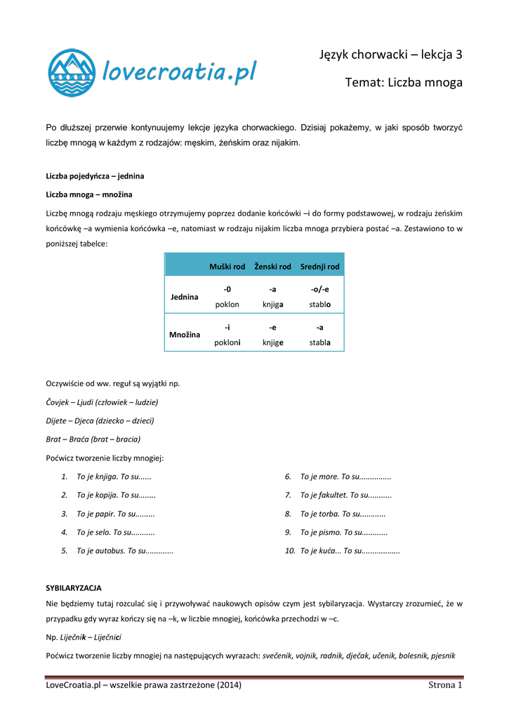 Język chorwacki – lekcja 3 Temat: Liczba mnoga Po dłuższej przerwie kontynuujemy lekcje języka chorwackiego. Dzisiaj pokażemy, w jaki sposób tworzyć liczbę mnogą w każdym z rodzajów: męskim, żeńskim oraz nijakim. Liczba pojedyńcza – jednina Liczba mnoga – množina Liczbę mnogą rodzaju męskiego otrzymujemy poprzez dodanie końcówki –i do formy podstawowej, w rodzaju żeńskim końcówkę –a wymienia końcówka –e, natomiast w rodzaju nijakim liczba mnoga przybiera postać –a. Zestawiono to w poniższej tabelce: Jednina Množina Muški rod Ženski rod Srednji rod -0 -a -o/-e poklon knjiga stablo -i -e -a pokloni knjige stabla Oczywiście od ww. reguł są wyjątki np. Čovjek – Ljudi (człowiek – ludzie) Dijete – Djeca (dziecko – dzieci) Brat – Braća (brat – bracia) Poćwicz tworzenie liczby mnogiej: 1. To je knjiga. To su...... 6. To je more. To su............... 2. To je kopija. To su........ 7. To je fakultet. To su........... 3. To je papir. To su......... 8. To je torba. To su............ 4. To je selo. To su........... 9. To je pismo. To su............ 5. To je autobus. To su............. 10. To je kuća... To su.................. SYBILARYZACJA Nie będziemy tutaj rozculać się i przywoływać naukowych opisów czym jest sybilaryzacja. Wystarczy zrozumieć, że w przypadku gdy wyraz kończy się na –k, w liczbie mnogiej, końcówka przechodzi w –c. Np. Liječnik – Liječnici Poćwicz tworzenie liczby mnogiej na następujących wyrazach: svečenik, vojnik, radnik, dječak, učenik, bolesnik, pjesnik LoveCroatia.pl – wszelkie prawa zastrzeżone (2014) Strona 1 WYRAZY JEDNOSYLABOWE W przypadku wyrazów jednosylabowych oprócz końcówki (zazwyczaj –i) dodaje się również ev lub ov Np. To je park. To su parkovi. To je miš. To su miševi. Kiedy dodawać –ev a kiedy –ov? Końcówkę –ev dodajemy gdy wyraz kończy się na: ć,č, dž, đ, j, lj, nj, š, ž, št, žd (r,c) Poćwicz tworzenie liczby mnogiej wyrazów jednosylabowych w następujących przykładach: To je most. To su…………….. To je nož. To su.............. To je sat. To su.......... To je vlak. To su.......... To je zmaj. To su.......... To je muž. To su.......... To je brod. To su............ To je trg. To su........... To je miš. To su...... To je park. To su............ To je tuš. To su........... To je vrt. To su................ I to już wszystko w lekcji trzeciej. Powodzenia! LoveCroatia.pl – wszelkie prawa zastrzeżone (2014) Strona 2
