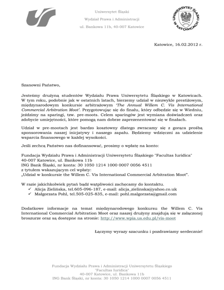 Uniwersytet Śląski Wydział Prawa i Administracji ul. Bankowa 11b, 40-007 Katowice Katowice, 16.02.2012 r. Szanowni Państwo, Jesteśmy drużyną studentów Wydziału Prawa Uniwersytetu Śląskiego w Katowicach. W tym roku, podobnie jak w ostatnich latach, bierzemy udział w niezwykle prestiżowym, międzynarodowym konkursie arbitrażowym ‘The Annual Willem C. Vis International Commercial Arbitration Moot’. Przygotowując się do finału, który odbędzie się w Wiedniu, jeździmy na sparingi, tzw. pre-moots. Celem sparingów jest wymiana doświadczeń oraz zdobycie umiejętności, które pomogą nam dobrze zaprezenentować się w finałach. Udział w pre-mootach jest bardzo kosztowny dlatego zwracamy się z gorąca prośbą sponsorowania naszej inicjatywy i naszego zapału. Będziemy wdzięczni za udzielenie wsparcia finansowego w każdej wysokości. Jeśli zechcą Państwo nas dofinansować, prosimy o wpłatę na konto: Fundacja Wydziału Prawa i Administracji Uniwersytetu Śląskiego "Facultas Iuridica" 40-007 Katowice, ul. Bankowa 11b ING Bank Śląski, nr konta: 30 1050 1214 1000 0007 0056 4511 z tytułem wskazującym cel wpłaty: „Udział w konkursie the Willem C. Vis International Commercial Arbitration Moot”. W razie jakichkolwiek pytań bądź wątpliwości zachęcamy do kontaktu. Alicja Zielińska, tel.605-096-187, e-mail: [email protected] Małgorzata Pohl, tel.505-025-835, e-mail: [email protected] Dodatkowe informacje na temat międzynarodowego konkursu the Willem C. Vis International Commercial Arbitration Moot oraz naszej drużyny znajdują się w załączonej broszurze oraz są dostępne na stronie: http://www.wpia.us.edu.pl/vis-moot Łączymy wyrazy szacunku i pozdrawiamy serdecznie! Fundacja Wydziału Prawa i Administracji Uniwersytetu Śląskiego "Facultas Iuridica" 40-007 Katowice, ul. Bankowa 11b ING Bank Śląski, nr konta: 30 1050 1214 1000 0007 0056 4511
