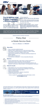 W DSV ISS oferujemy pełną wyzwań pracę w lokalnych i globalnych strukturach IT. DSV Global IT odpowiada za strategię, system, rozwój, operacje, wsparcie globalnej infrastruktury i aplikacji biznesowych. Na każdym stanowisku IT w DSV ISS masz realny wpływ na organizację i szansę na osiąganie widocznych rezultatów. Aktualnie prowadzimy rekrutację na stanowisko: Płatny Staż w Dziale Service Desk Miejsce pracy: Warszawa | nr ref. PSSD/J/2017 Nasza oferta Praca w nowoczesnej, globalnej korporacji. Możliwości rozwoju i współtworzenia firmy w fazie dynamicznego wzrostu. Płatne praktyki z możliwością przedłużenia współpracy po okresie 3 miesięcy. Umowa zlecenia na czas stażu a następnie umowa o pracę. Międzynarodowe środowisko pracy z możliwością codziennego posługiwania się językiem angielskim. Bardzo przyjazna atmosfera pracy. Nowoczesne biuro na Mokotowie – 10 minut od stacji Metra Wilanowska. Wyzwania Wsparcie użytkowników DSV na całym świecie w sprawach związanych z IT. Administrowanie kontami użytkowników w kilkunastu aplikacjach. Monitorowanie sieci DSV na całym świecie oraz rozwiązywanie problemów z tym związanych w porozumieniu z lokalnymi działami IT oraz usługodawcami internetowymi. Dołącz do nas jeśli… jesteś studentem IV lub V roku na kierunku Informatyka lub pokrewnym, wyróżnia Cię bardzo dobra znajomość języka angielskiego w mowie i piśmie, posiadasz umiejętność analitycznego myślenia, dążysz do samodoskonalenia, charakteryzuje Cię pracowitość, dokładność i skrupulatność, posiadasz umiejętność pracy w zespole. Prosimy o przysłanie CV, z zaznaczeniem numeru referencyjnego, na adres: [email protected] W dokumentach aplikacyjnych prosimy o dopisanie następującej klauzuli „Wyrażam zgodę na przetwarzanie moich danych osobowych przez DSV International Shared Services sp. z o.o. z siedzibą w Ołtarzewie dla potrzeb obecnych i przyszłych rekrutacji oraz weryfikacji moich kompetencji, a nadto do przekazania moich danych osobowych innym spółkom z grupy kapitałowej DSV ISS na potrzeby rekrutacji prowadzonych w przyszłości.” DSV – Global Transport and Logistics With offices and facilities in more than 80 countries on six continents, we provide and run supply chain solutions for thousands of companies on a daily basis. Our reach is global yet our presence is local and close to our customers. Read more at www.dsv.com 1. 2. 3. 4. 5. 6. Informujemy, że administratorem danych osobowych zawartych w przesłanych przez Pana\Panią dokumentach aplikacyjnych jest spółka DSV International Shared Services sp. z o.o. z siedzibą w Ołtarzewie przy ul. Południowej 2 (dalej: „DSV ISS”). Powyższe dane osobowe będą przetwarzane w celu przeprowadzenia procesu rekrutacyjnego, w ramach którego przesyła Pan/Pani dokumenty aplikacyjne, weryfikacji Pana/Pani kompetencji, a nadto w celu prowadzenia procesów rekrutacyjnych w przyszłości. Dane osobowe w związku z prowadzonym przez DSV ISS procesem rekrutacyjnym będę przekazane przez DSV ISS – DSV. W ramach prowadzonych w przyszłości rekrutacji dane osobowe mogą być także przekazane innym spółkom z grupy kapitałowej DSV ISS. Przysługuje Panu/Pani prawo wglądu i poprawiania danych osobowych. Podanie danych w zakresie określonym przepisami ustawy z dnia 26 czerwca 1974 r. Kodeks pracy jest obowiązkowe. Podanie dodatkowych danych jest dobrowolne. W przypadkach, o których mowa w art. 32 ust. 1 pkt 7 i 8 ustawy o ochronie danych osobowych z dnia 29.08.1997 r., przysługuje Panu/Pani prawo zgłoszenia sprzeciwu wobec przetwarzania Pana/Pani danych osobowych.