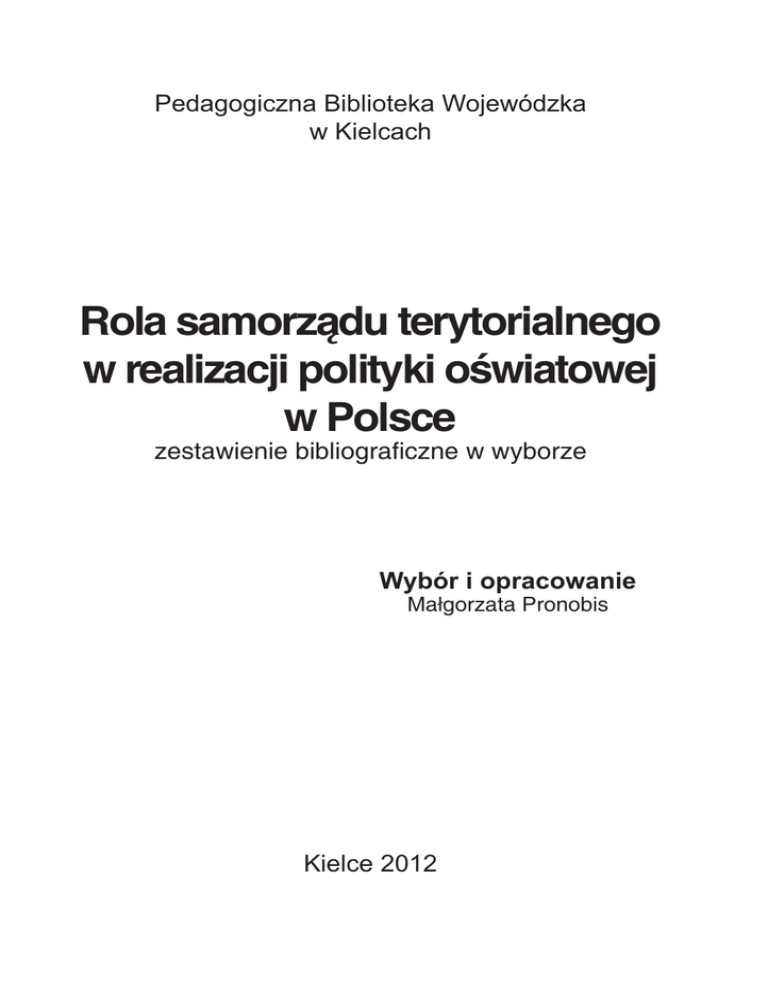 Pedagogiczna Biblioteka Wojewódzka w Kielcach Rola samorządu terytorialnego w realizacji polityki oświatowej w Polsce zestawienie bibliograficzne w wyborze Wybór i opracowanie Małgorzata Pronobis Kielce 2012 Korekta Beata Warmuzek Redakcja techniczna opracowanie graficzne i skład komputerowy Robert Kardas Wydawca: Pedagogiczna Biblioteka Wojewódzka w Kielcach, ul. Jana Pawła II 5, 25-025 Kielce e-mail: [email protected] www.pbw.kielce.pl 3 1. Adamczyk, Ewa : Samorządowy model oświaty : koncepcje i realia / Ewa Adamczyk, Janusz Gęsicki, Ewa Matczak. – Warszawa : Instytut Badań Edukacyjnych, 2001. – 95 s. Sygn. 234016 Czytelnia Pedagogicznej Biblioteki Wojewódzkiej Sygn. 234017, 234018 Wypożyczalnia Pedagogicznej Biblioteki Wojewódzkiej 2. Bal-Domańska, Beata : Zróżnicowanie przestrzenne wydatków budżetów powiatów - wyniki analizy strukturalnej / Beata Bal-Domańska // „Ekonometria”. – 2008, nr 20, s. 139-149 [Dot. oszacowań modeli wydatków na oświatę i wychowanie] 3. Baran, Alina : Edukacja w Polsce wobec zmian systemowych i demograficznych / Alina Baran // „Polityka Społeczna”. – 2004, nr 5/6, s. 5-9 Czytelnia Pedagogicznej Biblioteki Wojewódzkiej 4. Bigos, Adam : Finansowe aspekty realizacji zadań oświatowych przez gminy i powiaty w Polsce / Adam Bigos // „Zeszyt Naukowy Instytutu Ekonomicznego”. – T. 2 (2007), s. 159-173 Biblioteka Narodowa 5. Bogucka, Ilona : Powtórka z samorządności / Ilona Bogucka // „Gazeta Szkolna : aktualności”. – 2006, nr 9/10, s. 8-9 [Od 1989 r. szkoła jest jednostką gminy, powiatu lub województwa. Nadzór pedagogiczny nad nią sprawuje administracja rządowa, a nadzór finansowo-administracyjny organ prowadzący] Czytelnia Pedagogicznej Biblioteki Wojewódzkiej 6. Borowska, Bożena : Oświato, sfinansuj się sama! / Bożena Borowska // „Gazeta Szkolna : aktualności”. – 2007, nr 34/35, s. 19 [Mimo menedżerskich zabiegów dyrektorów szkół i wysiłków samorządów, edukacja nie sfinansuje się bez spójnej, dobrze zaplanowanej polityki państwa] Czytelnia Pedagogicznej Biblioteki Wojewódzkiej 7. Broniarz, Sławomir : Coraz szersze zjawisko / Sławomir Broniarz // „Gazeta Szkolna : aktualności”. – 2004, nr 12, s. 4 4 [Rezygnacja gmin z prowadzenia szkół na rzecz fundacji i stowarzyszeń] Czytelnia Pedagogicznej Biblioteki Wojewódzkiej 8. Buzowska, Barbara : Finansowanie oświaty szczebla powiatowego w latach 2002-2007 : wybrane aspekty na przykładzie powiatu tarnowskiego / Barbara Buzowska // „Samorząd Terytorialny”. – 2008, nr 10, s. 53-58 Uniwersytet Jana Kochanowskiego, Czytelnia Zarządzania i Administracji 9. Ceny obiadów bez obciążeń // „Przegląd Oświatowy”. – 2005, nr 2, s. 2 [Dotowanie przez samorządy stołówek szkolnych] Biblioteka Uniwersytetu Przyrodniczo-Humanistycznego, Siedlce 10. Dobijański, Mariusz : Prawo do nauki : zobowiązania prawne a rzeczywistość / Mariusz Dobijański // „Nowa Szkoła”. – 2009, nr 2, s. 1822 [Analiza przepisów prawnych dotyczących prawa do nauki i realizacji obowiązku szkolnego. Niedociągnięcia po stronie MEN, kuratoriów oświaty i jednostek samorządu terytorialnego w sprawie kontroli realizacji obowiązku szkolnego] Czytelnia Pedagogicznej Biblioteki Wojewódzkiej 11. Drewicz, Marcin : Z duszą na ramieniu / Marcin Drewicz // „Nowe Państwo”. – 2002, nr 9, s. 30-31 [Program polityki edukacyjnej] Biblioteka Publiczna m. st. Warszawy Biblioteka Uniwersytetu Warszawskiego 12. Dyło, Andrzej : Samorząd wobec szkoły, czyli o szansach reformy : (sprawozdanie z badań) / Andrzej Dyło // „Nowa Szkoła”. – 1999, nr 7, s. 9-12 Czytelnia Pedagogicznej Biblioteki Wojewódzkiej 13. Dzierzgowska, Irena : Co w prawie piszczy? : kto się boi wójta / Irena Dzierzgowska // „Dyrektor Szkoły”. – 2008, nr 5, s. 45-46 [Podział kompetencji między samorząd terytorialny a kuratorium oświaty. Samodzielność dyrektora szkoły] Czytelnia Pedagogicznej Biblioteki Wojewódzkiej 5 14. Ecler-Nocoń, Beata : Edukacja bez wychowania / Beata Ecler // „Nauczyciel i Szkoła”. – 2002, nr 1/2, s. 36-39 [Realizacja programu Polityka Oświatowa Samorządu Terytorialnego w szkołach średnich pow. tarnogórskiego] Uniwersytet Jana Kochanowskiego, Czytelnia Pedagogiczna 15. Finansowanie szkół średnich przez powiat - doświadczenia wielkich miast : raport z badań / [Wyższa Szkoła Biznesu w Tarnowie]. – Tarnów : Wyższa Szkoła Biznesu, 1999. – 60 s. Sygn. 235731 Czytelnia Pedagogicznej Biblioteki Wojewódzkiej 16. Gałażewska, Monika : Czy gminie potrzebna jest strategia edukacyjna? / Monika Gałażewska, Renata Kluska // „Dyrektor Szkoły”. – 2007, nr 11, s. 36-37 Czytelnia Pedagogicznej Biblioteki Wojewódzkiej 17. Gałczyńska, Jolanta : Czyja jest szkoła? / Jolanta Gałczyńska [i in.] ; oprac. Monika Sarwińska // „Gazeta Szkolna : aktualności”. – 2004, nr 51, s. [1] 18. [Debata na temat : komercjalizacja usług edukacyjnych. Wprowadzenie ustawowego zakazu przekazywania zadań własnych samorządu terytorialnego w dziedzinie oświaty samorządowym stowarzyszeniom i fundacjom. Dostęp wiejskich dzieci do przedszkoli. Problemy wychowawcze gimnazjów. Sytuacja liceów i szkół podstawowych] Czytelnia Pedagogicznej Biblioteki Wojewódzkiej 19. Gęsicki, Janusz : Meandry polityki edukacyjnej III Rzeczypospolitej / Janusz Gęsicki // „Nowa Szkoła”. – 2003, nr 5, s. 23-24 Czytelnia Pedagogicznej Biblioteki Wojewódzkiej 20. Gońda, Ewa : Wpływ czynników organizacyjnych na kształtowanie wydatków na samorządowe szkolnictwo obowiązkowe / Ewa Gońda // „Zeszyty Naukowe. Ekonomiczne Problemy Usług / Uniwersytet Szczeciński”. – Nr 1, t. 1 (2006), s. 161-170 Biblioteka Uniwersytetu Warszawskiego 21. Górny, Józef : Smutna prawda o subwencji / Józef Górny ; rozm. przepr. Piotr Skura // „Głos Nauczycielski”. – 2008, nr 34, s. 5 [Sytuacja finansowa polskich szkół