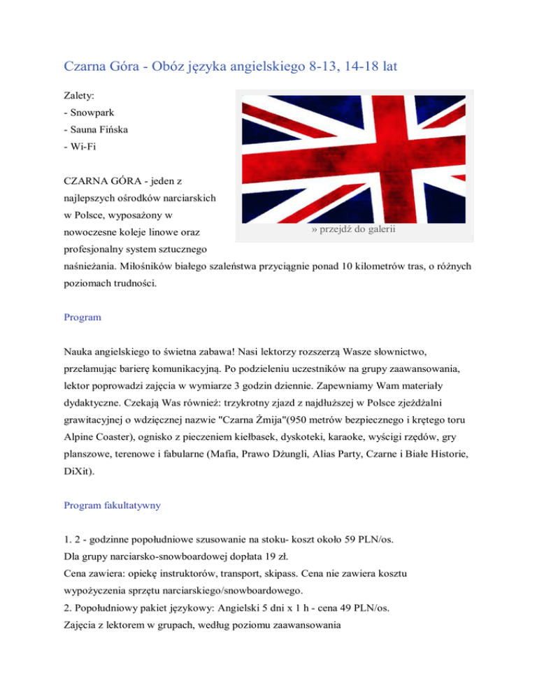 Czarna Góra - Obóz języka angielskiego 8-13, 14-18 lat Zalety: - Snowpark - Sauna Fińska - Wi-Fi CZARNA GÓRA - jeden z najlepszych ośrodków narciarskich w Polsce, wyposażony w nowoczesne koleje linowe oraz » przejdź do galerii profesjonalny system sztucznego naśnieżania. Miłośników białego szaleństwa przyciągnie ponad 10 kilometrów tras, o różnych poziomach trudności. Program Nauka angielskiego to świetna zabawa! Nasi lektorzy rozszerzą Wasze słownictwo, przełamując barierę komunikacyjną. Po podzieleniu uczestników na grupy zaawansowania, lektor poprowadzi zajęcia w wymiarze 3 godzin dziennie. Zapewniamy Wam materiały dydaktyczne. Czekają Was również: trzykrotny zjazd z najdłuższej w Polsce zjeżdżalni grawitacyjnej o wdzięcznej nazwie "Czarna Żmija"(950 metrów bezpiecznego i krętego toru Alpine Coaster), ognisko z pieczeniem kiełbasek, dyskoteki, karaoke, wyścigi rzędów, gry planszowe, terenowe i fabularne (Mafia, Prawo Dżungli, Alias Party, Czarne i Białe Historie, DiXit). Program fakultatywny 1. 2 - godzinne popołudniowe szusowanie na stoku- koszt około 59 PLN/os. Dla grupy narciarsko-snowboardowej dopłata 19 zł. Cena zawiera: opiekę instruktorów, transport, skipass. Cena nie zawiera kosztu wypożyczenia sprzętu narciarskiego/snowboardowego. 2. Popołudniowy pakiet językowy: Angielski 5 dni x 1 h - cena 49 PLN/os. Zajęcia z lektorem w grupach, według poziomu zaawansowania Zakwaterowanie 7 noclegów w Ośrodku Wypoczynkowym "Szekla". Pokoje 3 -, 4 - osobowe z łazienkami i TV LED. Do dyspozycji uczestników:narciarnia, sauna i sala do tenisa stołowego. Uwagi W przypadku złych warunków pogodowych zajęcia programowe oraz uzupełniające mogą ulec modyfikacji. Cena nie zawiera dopłat za transport z miast wyznaczonych w rozkładzie jazdy. Prosimy zabrać ze sobą: sprzęt narciarski/snowboardowy, gogle, krem na mróz z filtrem, wypełnioną kartę kwalifikacyjną z wpisanym nr PESEL, legitymację szkolną, strój kąpielowy. Świadczenia Wyżywienie: 3 posiłki dziennie + podwieczorek w restauracji ośrodka. Pierwszy posiłek: kolacja w dniu przyjazdu, ostatni: śniadanie w dniu wyjazdu + prowiant na drogę powrotną. Transport: Autokar turystyczny.. Ubezpieczenie Signal Iduna S.A. Opieka wychowawcyinstruktora. Realizacja programu. Informacje praktyczne Cena 6 - dniowego karnetu : ok. 369 PLN/os. Wypożyczenie sprzętu (dzień/komplet) - ok. 40 PLN/dzień Terminy i ceny Obóz języka angielskiego 8-13, 14-18 lat Nr grupy Data Cena APCG01 16.01 - 23.01 1199 zł 1099 zł Promocja (skrót: CZARJA) Cena ISIC Rezerwuj Plan podróży 1049 zł 8 dni kalkulator Rezerwuj APCG02 23.01 - 30.01 1199 zł 1099 zł Promocja Plan podróży 1049 zł 8 dni kalkulator Rezerwuj APCG03 30.01 - 06.02 1199 zł 1099 zł Promocja Plan podróży 1049 zł 8 dni kalkulator Rezerwuj APCG04 06.02 - 13.02 1199 zł 1099 zł Promocja Plan podróży 1049 zł 8 dni kalkulator Rezerwuj APCG05 13.02 - 20.02 1199 zł 1099 zł Promocja Plan podróży 1049 zł 8 dni kalkulator Rezerwuj APCG06 20.02 - 27.02 1199 zł 1099 zł Promocja Plan podróży 1049 zł 8 dni kalkulator