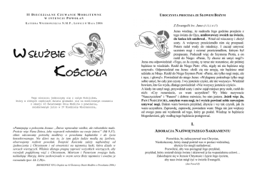 II DIECEZJALNE CZUWANIE MODLITEWNE W INTENCJI POWOŁAŃ KATEDR A WNIEBOWZIĘC IA N.M.P ., ŁOWIC Z 6 M AJ A 20 06 W SłuŜbie Kościoła Tego wieczoru jednoczymy się z całym Kościołem, który w róŜnych częściach świata gromadzi się na modlitewnym czuwaniu z okazji 43 Światowego Dnia Modlitw o powołania, celebrowanym jutro w IV Niedzielę Wielkanocną. UROCZYSTA PROCESJA ZE SŁOWEM BOśYM Z Ewangelii św. Jana (J 13,1.4-17) Jezus wiedząc, Ŝe nadeszła Jego godzina przejścia z tego świata do Ojca, umiłowawszy swoich na świecie, do końca ich umiłował... Wstał od wieczerzy i złoŜył szaty. A wziąwszy prześcieradło nim się przepasał. Potem nalał wody do miednicy. I zaczął umywać uczniom nogi i ocierać prześcieradłem, którym był przepasany. Podszedł więc do Szymona Piotra, a on rzekł do Niego: «Panie, Ty chcesz mi umyć nogi?» Jezus mu odpowiedział: «Tego, co Ja czynię, ty teraz nie rozumiesz, ale później będziesz to wiedział». Rzekł do Niego Piotr: «Nie, nigdy mi nie będziesz nóg umywał». Odpowiedział mu Jezus: «Jeśli cię nie umyję, nie będziesz miał udziału ze Mną». Rzekł do Niego Szymon Piotr: «Panie, nie tylko nogi moje, ale i ręce, i głowę!». Powiedział do niego Jezus: «Wykąpany potrzebuje tylko nogi sobie umyć, bo cały jest czysty. I wy jesteście czyści, ale nie wszyscy». Wiedział bowiem, kto Go wyda, dlatego powiedział: «Nie wszyscy jesteście czyści». A kiedy im umył nogi, przywdział szaty i znów zajął miejsce przy stole, rzekł do nich: «Czy rozumiecie, co wam uczyniłem? Wy Mnie nazywacie "Nauczycielem" i "Panem" i dobrze mówicie, bo nim jestem. JeŜeli więc Ja, PAN i NAUCZYCIEL, umyłem wam nogi, to i wyście powinni sobie nawzajem umywać nogi. Dałem wam bowiem przykład, abyście i wy tak czynili, jak Ja wam uczyniłem. Zaprawdę, zaprawdę, powiadam wam: Sługa nie jest większy od swego pana ani wysłannik od tego, który go posłał. Wiedząc to będziecie błogosławieni, gdy według tego będziecie postępować. I. «Pamiętając o poleceniu Jezusa: „śniwo wprawdzie wielkie, ale robotników mało. Proście więc Pana śniwa, Ŝeby wyprawił robotników na swoje Ŝniwo!” (Mt 9,37), silnie odczuwamy potrzebę modlitwy o powołania kapłańskie i do Ŝycia konsekrowanego. Nie dziwi nas to, Ŝe tam gdzie ludzie modlą się Ŝarliwie, obserwujemy rozkwit powołań. Świętość Kościoła zaleŜy najbardziej od zjednoczenia z Chrystusem i od otwartości na tajemnicę łaski, która działa w sercach wierzących. Właśnie dlatego pragnę zaprosić wszystkich wierzących, aby rozwijali pogłębioną więź z Chrystusem, Mistrzem i Pasterzem swojego ludu, naśladując Maryję, która zachowywała w swym sercu BoŜe tajemnice i uwaŜne je rozwaŜała (por. Łk 2,20)». (BENEDYKT XVI, Orędzie na 43 Światowy Dzień Modlitw o Powołania 2006.) ADORACJA NAJŚWIĘTSZEGO SAKRAMENTU Pozwólcie, by zafascynował was Chrystus, Nieskończony, który stanął pośród was w postaci widzialnej, abyście Go mogli naśladować. Pozwólcie, aby was pociągnął Jego przykład, przykład, który zmienił dzieje świata i skierował je ku wspaniałemu celowi… Zakochajcie się w Jezusie Chrystusie i Ŝyjcie Jego Ŝyciem, aby nasz świat mógł Ŝyć w świetle Ewangelii. (Jan Paweł II) II. III. «Jeszcze przed załoŜeniem świata, zanim zaczęliśmy istnieć, Ojciec Niebieski wybrał nas osobiście i powołał do tego abyśmy weszli w synowską relację z Nim poprzez Jezusa, Słowo Wcielone, pod natchnieniem Ducha Świętego… W ramach tego powszechnego powołania, Chrystus – NajwyŜszy Kapłan – w swojej trosce o Kościół powołuje w kaŜdym pokoleniu osoby, które zatroszczą się o jego lud». «W sposób szczególny wyświęcony kapłan jest sługą Chrystusa obecnego w Kościele jako tajemnicy, komunii i misji. Poprzez uczestnictwo w namaszczeniu oraz w misji Chrystusa, moŜe kontynuować w Kościele Jego modlitwę, Jego słowo, Jego ofiarę, Jego zbawczą działalność… Drugie pośród powołań specjalnych, które zajmuje waŜne miejsce w Kościele, to powołanie do Ŝycia konsekrowanego. Na wzór Marii z Betanii, która „siadła u nóg Pana i przysłuchiwała się Jego mowie” (Łk 10,39), wielu męŜczyzn i kobiet decyduje się na całkowite i wyłączne pójście za Chrystusem…». (BENEDYKT XVI, Orędzie) (BENEDYKT XVI, Orędzie) REFLEKSJA POWOŁANIOWA ŚWIADECTWA OSOBISTA REFLEKSJA Rodzice jednego z Kleryków Postulantka Słowa Ojca Św. Jana Pawła II 1. «Panie, Ty chcesz mi umyć nogi?». Gdyby dziś Jezus podszedł do mnie aby umyć mi nogi, aby mi słuŜyć… Jakbym się zachował? Czy nie zareagowałbym podobnie do Piotra? 2. «Jeśli cię nie umyję, nie będziesz miał udziału ze mną…». Jezus pragnie zatroszczyć się o to, co we mnie najbardziej zmęczone, ubrudzone, zranione przez Ŝycie. Nie tylko patrzy mi w oczy, mówi do mnie, ociera pot z czoła. On pochyla się aŜ do ziemi, do moich stóp, aby je obmyć, opatrzyć i uczynić mnie zdolnym do naśladowania Go. Czy potrafię przyjąć tę Jego pokorną miłość? IV. GEST 3. «Czy rozumiecie co wam uczyniłem?». Czy staram się zrozumieć co WYDARZA SIĘ podczas kaŜdej Eucharystii, kaŜdej Komunii św., kaŜdej spowiedzi, kaŜdej mojej modlitwy? Wtedy Jezus z miłością pochyla się nade mną! Na ile świadomie przeŜywam moje spotkanie z Jezusem? 4. «… i wy powinniście umywać sobie nogi». Czy chcę uczyć się od Jezusa co znaczy kochać? W jaki sposób staram się odkrywać to, do czego Pan mnie zaprasza? Co chcę uczynić z moim Ŝyciem? Czy mam odwagę być jak On człowiekiem słuŜby? 5. «Będziecie błogosławieni gdy według tego będziecie postępować». SłuŜyć Kościołowi to być jedni dla drugich, gdyŜ kaŜdy ma swój dar dla dobra wszystkich. Czy odkrywam moje dary i talenty? Czy potrafię z moich zdolności uczynić dar dla dobra innych? W jaki sposób angaŜuję się w Ŝy