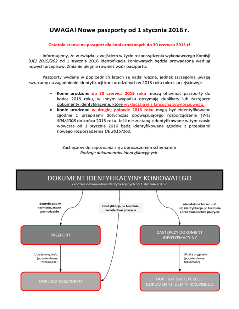 UWAGA! Nowe paszporty od 1 stycznia 2016 r. Ostatnia szansa na paszport dla koni urodzonych do 30 czerwca 2015 r! Informujemy, że w związku z wejściem w życie rozporządzenia wykonawczego Komisji (UE) 2015/262 od 1 stycznia 2016 identyfikacja koniowatych będzie prowadzona według nowych przepisów. Zmianie ulegnie również wzór paszportu. Paszporty wydane w poprzednich latach są nadal ważne, jednak szczególną uwagę zwracamy na zagadnienie identyfikacji koni urodzonych w 2015 roku (okres przejściowy): · · Konie urodzone do 30 czerwca 2015 roku muszą otrzymać paszporty do końca 2015 roku, w innym wypadku otrzymają duplikaty lub zastępcze dokumenty identyfikacyjne, które wykluczają je z łańcucha żywnościowego. Konie urodzone w drugiej połowie 2015 roku mogą być zidentyfikowane zgodnie z przepisami dotychczas obowiązującego rozporządzenia (WE) 504/2008 do końca 2015 roku. Jeśli nie zostaną zidentyfikowane w tym czasie wówczas od 1 stycznia 2016 będą identyfikowane zgodnie z przepisami nowego rozporządzenia UE 2015/262. Zachęcamy do zapoznania się z uproszczonym schematem Rodzaje dokumentów identyfikacyjnych: