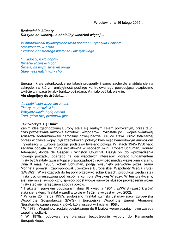 Wrocław, dnia 16 lutego 2015r. Brukselskie klimaty. Dla tych co wiedzą…a chcieliby wiedzieć więcej… W opracowaniu wykorzystano treść poematu Fryderyka Schillera ogłoszonego w 1786r. Przekład Konstantego Ildefonsa Gałczyńskiego. O Radości, iskro bogów, Kwiecie elizejskich cór, Święta, na twym świętym progu Staje nasz natchniony chór. Europa i kraje członkowskie po latach prosperity i samo zachwytu znajdują się na zakręcie, na którym umiejętność poślizgu kontrolowanego powodująca bezpieczne wyjście z impasu byłaby bardzo pożądana. A miało być tak pięknie. Ale sięgnijmy do źródeł…… Jasność twoja wszystko zaćmi, Złączy, co rozdzielił los. Wszyscy ludzie będą braćmi Tam, gdzie twój przemówi głos. Jak tworzyła się Unia? Zanim idea zjednoczonej Europy stała się realnym celem politycznym, przez długi czas pozostawała mrzonką filozofów i wizjonerów. Pozostałe po II wojnie światowej zgliszcza zdeterminowały narodziny nowej nadziei. Ci, co stawili czoło totalitarnej opresji w czasie wojny, byli zdecydowani położyć kres międzynarodowym animozjom i rywalizacji w Europie tworząc podstawy trwałego pokoju. W latach 1945-1950 tego zadania podjęła się grupa inicjatywna w osobach m.in.: Robert Schuman, Konrad Adenauer, Alcide de Gasperi i Winston Churchill. Dążyli oni do wprowadzenia nowego porządku opartego na idei wspólnych interesów, którego fundamentem miały być traktaty gwarantujące praworządność i równość między wszystkimi krajami. Dnia 9 maja 1950r, Robert Schuman, podjął wysunięty pierwotnie przez Jeana Monneta pomysł i zaproponował utworzenie Europejskiej Wspólnoty Węgla i Stali (EWWiS). W walczących do tej pory przeciwko sobie krajach, produkcja węgla i stali miała być umieszczona pod wspólną kontrolą Wysokiej Władzy. W ten praktyczny, ale i nie mniej symboliczny sposób podstawowe surowce służące prowadzeniu wojen miały stać się narzędziem zgody i pokoju. * Traktatem paryskim podpisanym dnia 18 kwietnia 1951r. EWWiS (sześć krajów) stała się faktem. Traktat wszedł w życie w 1952r, a wygasł w roku 2002. * W dniu 25 marca 1957r. podpisano Traktat rzymski ustanawiający Europejską Wspólnotę Gospodarczą (EWG) i Europejską Wspólnotę Energii Atomowej (Euratom-te same sześć krajów), który wszedł w życie w 1958r. * W 1973r. Wspólnoty zostają powiększone do 9 krajów wprowadzając nowe zasady wspólnej polityki. * W 1979r. odbywają się pierwsze bezpośrednie wybory do Parlamentu Europejskiego. * W lutym 1986r. podpisano Jednolity Akt Europejski, który wszedł w życie w 1987r. zmieniając Traktat EWG, torując drogę do pełnego wprowadzenia jednolitego rynku. * Dnia 7 lutego 1992r. w Maastricht został podpisany Traktat o Unii Europejskiej (UE) –jako, tzw. Traktat z Maastricht wszedł w życie w 1993r. Ustanowił on Unię Europejską i przyznał Parlamentowi Europejskiemu większe uprawnienia w procesie decyzyjnym, a zarazem objął współpracą nowe obszary polityki. * Zmiany we wcześniejszych traktatach wprowadzone zostały Traktatem z Amsterdamu podpisanym dnia 2 października 1997r., który wszedł w życie w 1999r. * Ważnym, dostosowującym system instytucjonalny Unii tak, by mógł on nadal skutecznie działać po przystąpieniu do UE grupy nowych państw członkowskich w 2004r. był Traktat z Nicei podpisany dnia 26 lutego 2001r, który wszedł w życie w 2003r. Patrz, patrz, wielkie słońce światem Biegnie, sypiąc złote skry, Jak zwycięzca i bohater Biegnij bracie, tak i ty. Radość tryska z piersi ziemi, Radość pije cały świat, Dziś wchodzimy, wstępujemy Na radości złoty ślad * W 1 stycznia 2002r. w 12 państwach Unii euro zastąpiło stare waluty, a państwa stworzyły tzw. strefę euro. Status euro zbliżony jest do statusu dolara europejskiego. * W dniu 13 grudnia 2007r. został podpisany Traktat z Lizbony, który wszedł w życie w 2009r. Uprościł on metody pracy i zasady głosowania, utworzył stanowisko przewodniczącego Rady Europejskiej i wprowadził nowe struktury w celu wzmocnienia pozycji UE na arenie międzynarodowej. Wprowadzono np. funkcję stałego przewodniczącego Rady Europejskiej i utworzono stanowisko i wysokiego przedstawiciela Unii do spraw zagranicznych i polityki bezpieczeństwa. W 2007r. UE liczy już 27 państw członkowskich (sześć krajów byłego bloku sowieckiego), trzy kraje bałtyckie będące kiedyś częścią Związku Radzieckiego, jeden z republik byłej Jugosławii oraz dwa kraje śródziemnomorskie. Ona w sercu, w zbożu, w śpiewie, Ona w splocie ludzkich rąk, Z niej najlichszy robak czerpie, W niej największy nieba krąg. Od inicjatywy Roberta Schumana dającej początek projektowi integracji europejskiej minęło 65 lat. Jego słowa zawarte w deklaracji z 1950 roku i będące kamieniem węgielnym planu integracji europejskiej nie straciły na znaczeniu. Solidarność między społeczeństwami i narodami europejskimi musi nieustannie dostosowywać się do nowych wyzwań wynikających ze zmian zachodzących w Europie i na świecie. Po latach zmian i wewnętrznych transformacji Unia Europejska jest czymś więcej niż tylko konfederacją krajów. Jasno trzeba jednak powiedzieć, że nie jest to jednak państwo federalne. W istocie jej struktura nie mieści się w żadnej tradycyjnej kategorii prawa. Jak powiedziałby historyk jest tworem unikatowym. Wstańcie, ludzie, wstańcie wszędzie, Ja nowinę niosę wam: Na gwiaździstym firmamencie Miłość, miłość mieszka tam. Przed wstąpieniem do Unii nasze członkostwo wywoływało wiele pytań i kontrowersji. Dzisiaj już nie ma wątpliwości, że korzyści, jakie płyną ze Wspólnoty, przewyższają nasze oczekiwania. Czy dotyczą one wszystkich? Czy, a jeśli nie, to dlaczego nie ze wszystkim się zgadzamy? Kto ma wpływ na nasze zadowolenie i rozgoryczenie? W procesach decyzyjnych na poziomie Unii Europejskiej uczestniczą różne insty