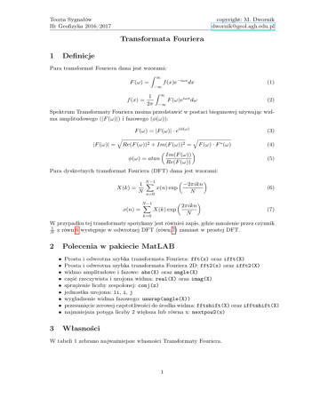 Transformata Fouriera 1 Definicje 2 Polecenia w pakiecie MatLAB 3