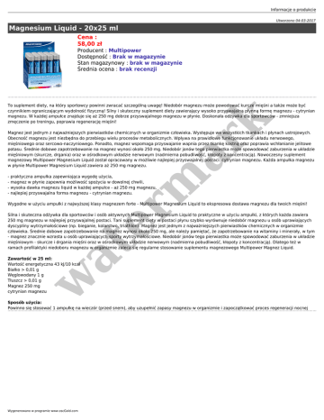 Informacje o produkcie Utworzono 04-03-2017 Magnesium Liquid - 20x25 ml Cena : 58,00 zł Producent : Multipower Dostępność : Brak w magazynie Stan magazynowy : brak w magazynie Średnia ocena : brak recenzji er m ar k To suplement diety, na który sportowcy powinni zwracać szczególną uwagę! Niedobór magnezu może powodować kurcze mięśni a także może być czynnikiem ograniczającym wydolność fizyczną! Silny i skuteczny suplement diety zawierający wysoko przyswajalną płynną formę magnezu - cytrynian magnezu. W każdej ampułce znajduje się aż 250 mg dobrze przyswajalnego magnezu w płynie. Doskonała odżywka dla sportowców - zmniejsza zmęczenie po treningu, poprawia regenerację mięśni! Magnez jest jednym z najważniejszych pierwiastków chemicznych w organizmie człowieka. Występuje we wszystkich tkankach i płynach ustrojowych. Obecność magnezu jest niezbędna do przebiegu wielu procesów metabolicznych. Wpływa na prawidłowe funkcjonowanie układu nerwowego, mięśniowego oraz sercowo-naczyniowego. Ponadto, magnez wspomaga przyswajanie wapnia przez tkankę kostną oraz poprawia wchłanianie jelitowe potasu. Średnie dobowe zapotrzebowanie na magnez wynosi około 250 mg. Niedobór jonów tego pierwiastka może spowodować zaburzenia w układzie mięśniowym (skurcze, drgania) oraz w ośrodkowym układzie nerwowym (nadmierna pobudliwość, kłopoty z koncentracją). Nowoczesny suplement magnezowy Multipower Magnesium Liquid został opracowany w możliwie najlepiej przyswajalnej postaci: cytrynian magnezu. Każda ampułka magnezu w płynie Multipower Magnesium Liquid zawiera aż 250 mg magnezu. - praktyczna ampułka zapewniająca wygodę użycia, - magnez w płynie zapewnia możliwość spożycia w dowolnej chwili, - wysoka dawka magnezu liquid w każdej ampułce - aż 250 mg magnezu, - najlepiej przyswajalna forma magnezu - cytrynian magnezu. Wygodne w użyciu ampułki z najwyższej klasy magnezem forte - Multipower Magnesium Liquid to ekspresowa dostawa magnezu dla twoich mięśni! at Silna i skuteczna odżywka dla sportowców i osób aktywnych Multipower Magnesium Liquid to praktyczne w użyciu ampułki, z których każda zawiera 250 mg magnezu w najlepiej przyswajalnej postaci. Tani suplement diety w postaci płynu szybko wyrównuje niedobór magnezu u osób uprawiających dyscypliny wytrzymałościowe (np. bieganie, kolarstwo, triathlon). Magnez jest jednym z najważniejszych pierwiastków chemicznych w organizmie człowieka. Średnie dobowe zapotrzebowanie na magnez wynosi około 250 mg, ale należy pamiętać, że zapotrzebowanie na witaminy i minerały, w tym - magnez znacznie wzrasta u osób uprawiających sporty wytrzymałościowe. Niedobór jonów tego pierwiastka może spowodować zaburzenia w układzie mięśniowym - skurcze i drgania mięśni oraz w ośrodkowym układzie nerwowym (nadmierna pobudliwość, kłopoty z koncentracją). Dlatego też w ramach profilaktyki niedoboru magnezu w organizmie zaleca się regularne stosowanie suplementu magnezowego Multipower Magnez Liquid. w Zawartość w 25 ml: Wartość energetyczna 43 kJ/10 kcal Białko > 0,01 g Węglowodany 1 g Tłuszcz > 0,01 g Magnez 250 mg cytrynian magnezu Sposób użycia: Powinno się stosować 1 ampułkę na wieczór (przed snem), aby uzupełnić zapasy magnezu w organizmie i zapoczątkować proces regeneracji nocnej Wygenerowano w programie www.oscGold.com