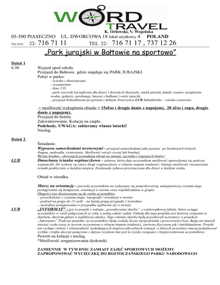 05-500 PIASECZNO TEL/FAX 22- 716 71 K. Orłowski, V. Wojeńska UL. DWORCOWA 18 lokal użytkowy 4 POLAND 11 TEL 22- 716 71 17 , 737 12 26 „Park jurajski w Bałtowie na sportowo” Dzień 1 6.30 Wyjazd spod szkoły. Przejazd do Bałtowa gdzie znajduje się PARK JURAJSKI. Pobyt w parku: - ścieżka z dinozaurami; - oceanarium; - kino 5 D; - park rozrywki (urządzenia dla dzieci i dorosłych (karuzele, statek piracki, family coaster, urządzenia wodne, gokarty, eurobungy, baseny z kulkami i wiele innych). - przejazd Schoolbusem po górnym i dolnym Zwierzyńcu LUB Sabathówka – wioska czarownic. + możliwość wykupienia obiadu + 15zł/os ( drugie danie z napojem), 20 zł/os ( zupa, drugie danie z napojem). Przyjazd do hotelu. Zakwaterowanie. Kolacja na ciepło. Podchody. UWAGA: zabieramy własne latarki! Nocleg. Dzień 2 Śniadanie. Wyprawa samochodami terenowymi - przejazd samochodami jako pasażer po bezdrożach leśnych LUB (bagna, mokradła, wzniesienia. Możliwość wersji czystej lub brudnej. Wersja brudna - obowiązek posiadania ubrań na zmianę, ręcznika i wiązanych butów! Dmuchana ścianka wspinaczkowa - zabawa, która daje uczestnikom możliwość sprawdzenia się podczas wspinaczki. Do wyboru są cztery drogi wspinaczkowe o różnym stopniu trudności. Istnieje możliwość rozstawienia ścianki praktycznie w każdym miejscu. Doskonała zabawa przeznaczona dla dzieci w każdym wieku. Obiad w ośrodku. Marsz na orientację - pozwala uczestnikom na wykazanie się pomysłowością, umiejętnością czytania map, LUB posługiwania się kompasem, orientacji w terenie oraz współdziałania w grupie. Długości tras dostosowane są do wieku uczestników. - przeszkolenie z czytania mapy, topografii i orientacji w terenie - podział na grupy do 15 osób – na każdą grupę przypada 1 instruktor - instruktaż postępowania w przypadku zgubienia się w terenie. „INFORMAT” - jest to projekt z rodzaju „poszukiwania skarbu”, o wielowątkowej fabule, która wciąga uczestników w wiele połączonych ze sobą w jedną całość zadań. Fabułą dla tego projektu jest historia związana ze skarbem, ukrytym gdzieś w najbliższej okolicy. Tego właśnie skarbu będą poszukiwali uczestnicy w projekcie „Informator”.Podczas projektu, na uczestników będą czekały liczne niespodzianki i przeciwności losu. Będą oni musieli stawiać czoła coraz to nowym wyzwaniom o różnym stopniu trudności, zarówno fizycznym jak i intelektualnym. Projekt ten cechuje wielość i różnorodność zaskakujących nieprzewidywalnych sytuacji, w których uczestnicy muszą podejmować szybkie i trafne decyzje połączone z dużym ryzykiem (nie jest to ryzyko związane z bezpieczeństwem uczestników). Powrót na kolacje i nocleg. *Możliwość zorganizowania dyskoteki. ZAMIENNIE W TYM DNIU ZAMIAST ZAJĘĆ SPORTOWYCH MOŻEMY ZAPROPONOWAĆ WYCIECZKĘ DO ROZTOCZAŃSKIEGO PARKU NARODOWEGO Dzień 3 Śniadanie. Zwariowana olimpiada - uczestnicy w grupach 5-osobowych rywalizują w 20 różnych konkurencjach np. : Narty 5-osobowe – członkowie zespołu mają za zadanie przejść określony odcinek drogi na specjalnie przygotowanych nartach. Głównym zadaniem w tej konkurencji jest skoordynowanie ruchów całego zespołu. Spodnie 5-osobowe - wesoła konkurencja, która polega na wyścigu w specjalnych, gigantycznych spodniach. Worki 5-osobowe – konkurencja z dziecięcych lat, która przy dopingu pozostałych uczestników stanowi bardzo dobrą, wesołą zabawę. Wyścig chomików – konkurencja, w której 5-osobowe zespoły mogą wczuć się w „los biednego chomika”, pokonującego wyznaczoną trasę. Wyścig rydwanów – konkurencja, w której oprócz siły, sprawności, zaufania, współpracy, wymagana jest odwaga osoby znajdującej się na rydwanie. Bolkowe narty - konkurencja, w której 5-osobowe zespoły pokonują trasę na bolkowych nartach. Jest to zabawa wymagająca zgrania, współpracy całego zespołu. Przeciąganie liny - najbardziej popularna konkurencja na wszystkich imprezach integracyjnych, przeznaczona dla dzieci i dorosłych. Siatka Tekli - wesoła konkurencja polegająca na pokonaniu sieci przez dwa 6 osobowe zespoły. Walka kogutów – konkurencja polega na przeciąganiu się dwóch osób. Rura - zadanie zespołowe polegające na napełnieniu specjalnie przygotowanej rury wodą. Cyrkiel – integrująca zespół zabawa polegająca na wyścigu dwóch specjalnie przygotowanych cyrkli. Gąsienica - wesoła konkurencja dla trzech 5 osobowych zespołów, polegająca na wyścigu gąsienic. Mega supeł - konkurencja zmuszająca wszystkich uczestników do kreatywnego działania w zespole. Jazda na rowerze przeciwskrętnym – konkurencja polegająca na pokonaniu slalomu na rowerze. Jedynym utrudnieniem jest fakt, iż w rowerze wszystko działa odwrotnie. W tej zabawie można się przekonać, jak trudno jest wyeliminować wyuczone nawyki. Obręcz – konkurencja logiczna, w której zespół ma do wykonania zadanie wydające się w pierwszej chwili niemożliwe do zrealizowania! 18.30-19.30 Obiad w hotelu. Wyjazd z ośrodka. Powrót pod szkołę. KOLEJNOŚĆ MOŻE ULEC ZMIANIE Świadczenia: - transport lux autokarem marki, np. Mercedes, Volvo, Scania, MAN, Neoplan z WC, DVD, barkiem, uchylnymi siedzeniami - zakwaterowanie w hotelu, pensjonacie, ośrodku wypoczynkowym, pokoje z łazienkami lub studio - wyżywienie zgodnie z programem - realizacja programu turystycznego - opieka pilota - ubezpieczenie NW 5000 zł - VAT - grupy 30 os. - 2 miejsca gratis dla nauczycieli, od 30 do 45 os. – 3 miejsca gratis dla nauczycieli Cena: 330 zł/min. 40 os. - max. 45 os. płacących Cena: 360 zł/min. 35 os. - max. 39 os. płacących Cena: 390 zł/min. 30 os. - max. 34 os. płacących +dodatkowo bilety wstępu/zajęcia survivalu od 90 do 110 zł/os. (uzależnione od wyboru opcji z programu) + Możliwość wykupienia obiadu w pierwszym dniu + 15zł/os ( drugie danie z napojem), 20 zł/os ( zupa, dr
