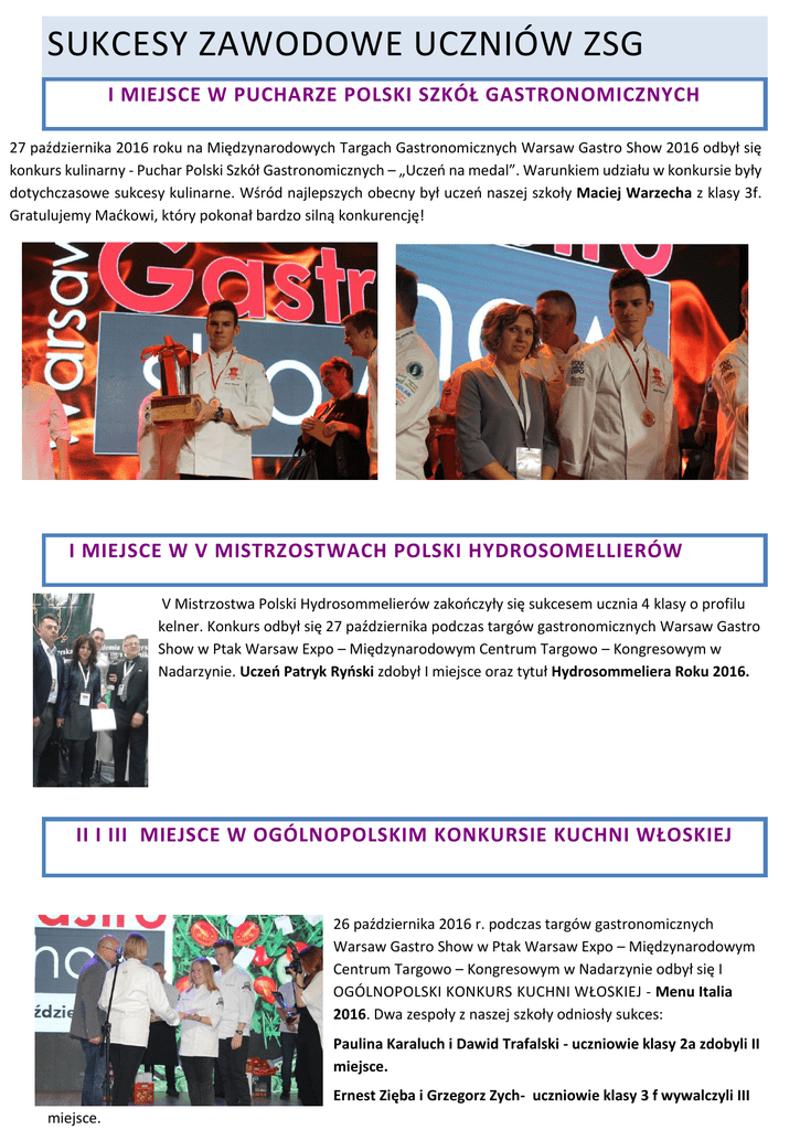 SUKCESY ZAWODOWE UCZNIÓW ZSG I MIEJSCE W PUCHARZE POLSKI SZKÓŁ GASTRONOMICZNYCH 27 października 2016 roku na Międzynarodowych Targach Gastronomicznych Warsaw Gastro Show 2016 odbył się konkurs kulinarny - Puchar Polski Szkół Gastronomicznych – „Uczeń na medal”. Warunkiem udziału w konkursie były dotychczasowe sukcesy kulinarne. Wśród najlepszych obecny był uczeń naszej szkoły Maciej Warzecha z klasy 3f. Gratulujemy Maćkowi, który pokonał bardzo silną konkurencję! I MIEJSCE W V MISTRZOSTWACH POLSKI HYDROSOMELLIERÓW POLSKI HYDROSOMELLEV MISTRZOSTWA POLSKI HYDROSOMMELIERÓW V Mistrzostwa Polski Hydrosommelierów zakończyły się sukcesem ucznia 4 klasy o profilu kelner. Konkurs odbył się 27 października podczas targów gastronomicznych Warsaw Gastro Show w Ptak Warsaw Expo – Międzynarodowym Centrum Targowo – Kongresowym w Nadarzynie. Uczeń Patryk Ryński zdobył I miejsce oraz tytuł Hydrosommeliera Roku 2016. II I III MIEJSCE W OGÓLNOPOLSKIM KONKURSIE KUCHNI WŁOSKIEJ SO MELLEV MISTRZOSTWA POLSKI HYDROSOMMELIERÓW 26 października 2016 r. podczas targów gastronomicznych Warsaw Gastro Show w Ptak Warsaw Expo – Międzynarodowym Centrum Targowo – Kongresowym w Nadarzynie odbył się I OGÓLNOPOLSKI KONKURS KUCHNI WŁOSKIEJ - Menu Italia 2016. Dwa zespoły z naszej szkoły odniosły sukces: Paulina Karaluch i Dawid Trafalski - uczniowie klasy 2a zdobyli II miejsce. Ernest Zięba i Grzegorz Zych- uczniowie klasy 3 f wywalczyli III miejsce.
