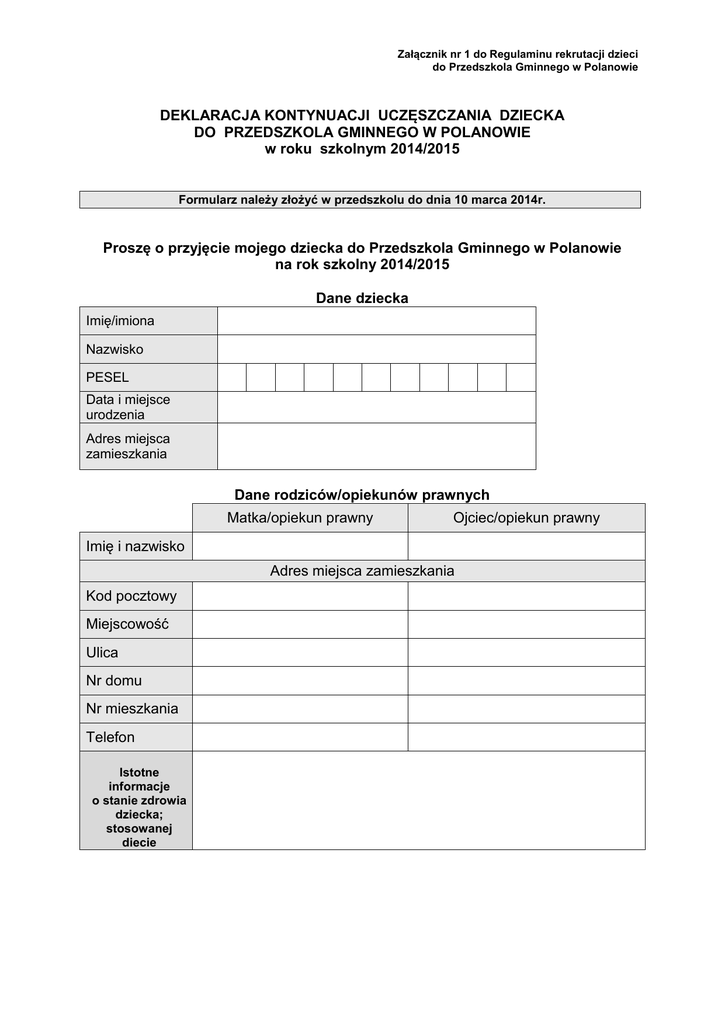 Załącznik nr 1 do Regulaminu rekrutacji dzieci do Przedszkola Gminnego w Polanowie DEKLARACJA KONTYNUACJI UCZĘSZCZANIA DZIECKA DO PRZEDSZKOLA GMINNEGO W POLANOWIE w roku szkolnym 2014/2015 Formularz należy złożyć w przedszkolu do dnia 10 marca 2014r. Proszę o przyjęcie mojego dziecka do Przedszkola Gminnego w Polanowie na rok szkolny 2014/2015 Dane dziecka Imię/imiona Nazwisko PESEL Data i miejsce urodzenia Adres miejsca zamieszkania Dane rodziców/opiekunów prawnych Matka/opiekun prawny Ojciec/opiekun prawny Imię i nazwisko Adres miejsca zamieszkania Kod pocztowy Miejscowość Ulica Nr domu Nr mieszkania Telefon Istotne informacje o stanie zdrowia dziecka; stosowanej diecie Czas pobytu w przedszkolu i wybór posiłków Drogi Rodzicu! Wypełnij odpowiednią tabelę i wskaż wybrane dla dziecka posiłki Pobyt bez wyżywienia do 5 godz. dziennie od 8.00 do 13.00 z wyżywieniem Pobyt powyżej 5 godz. dziennie z wyżywieniem śniadanie obiad podwieczorek od godz………... do godz………….. śniadanie obiad podwieczorek Deklaracje, zobowiązania rodziców 1............................................................... Upoważniam do odbioru z przedszkola mojego dziecka, wymienione obok osoby (poza rodzicami /opiekunami prawnymi). 2 .............................................................. Bierzemy na siebie pełną odpowiedzialność prawną za bezpieczeństwo odebranego dziecka, od momentu jego odbioru przez wskazaną, upoważnioną przez nas osobę. 4 .............................................................. 3 .............................................................. 5…………………………………………….. Wyrażam zgodę na udział mojego dziecka w wycieczkach organizowanych w przedszkolu. Tak * Nie * Wyrażam zgodę na umieszczenie na stronie internetowej przedszkola (gminy) i w prasie wizerunku mojego dziecka. Tak * Nie * Zgodnie z przepisami ustawy z dnia 29 sierpnia 1997r. o ochronie danych osobowych ( Dz. U. Nr 133,poz.883) wyrażam zgodę na wykorzystanie moich danych osobowych w zakresie niezbędnym do pracy przedszkola i zachowania bezpieczeństwa mojego dziecka. Tak * Nie * Zobowiązuję się do: Przestrzegania postanowień statutu przedszkola Regularnego uiszczania wymaganych opłat w wyznaczonym terminie Uczestniczenia w zebraniach rodziców Przyprowadzania i odbierania dziecka z przedszkola osobiście lub przez osobę, zgłoszoną powyżej, zapewniającą dziecku bezpieczeństwo Zobowiązuje się do niezwłocznego informowania przedszkola na piśmie o zmianach danych osobowych, danych adresowych Zobowiązuje się również do pisemnego poinformowania przedszkola, z miesięcznym wyprzedzeniem o rezygnacji z miejsca w przedszkolu Oświadczam, że informacje przedstawione w niniejszej karcie zgłoszenia są zgodne ze stanem faktycznym. (Za podanie nieprawdziwych danych mogą być wyciągnięte odpowiednie konsekwencje włącznie ze skreśleniem dziecka z listy przedszkolaków) Polanów, dnia............................ ……………………………………… Czytelny podpis rodziców/opiekunów * niepotrzebne skreślić