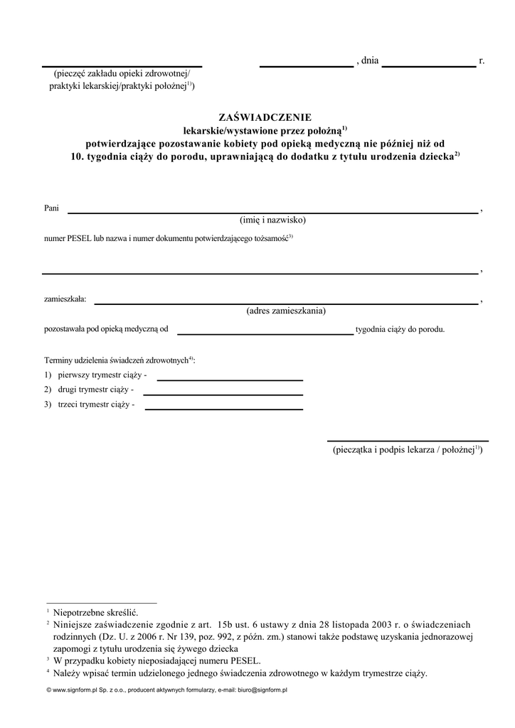 , dnia r. (pieczęć zakładu opieki zdrowotnej/ praktyki lekarskiej/praktyki położnej1)) ZAŚWIADCZENIE lekarskie/wystawione przez położną1) potwierdzające pozostawanie kobiety pod opieką medyczną nie później niż od 10. tygodnia ciąży do porodu, uprawniającą do dodatku z tytułu urodzenia dziecka 2) , Pani (imię i nazwisko) numer PESEL lub nazwa i numer dokumentu potwierdzającego tożsamość3) , , zamieszkała: (adres zamieszkania) pozostawała pod opieką medyczną od signform tygodnia ciąży do porodu. Terminy udzielenia świadczeń zdrowotnych4): 1) pierwszy trymestr ciąży 2) drugi trymestr ciąży 3) trzeci trymestr ciąży - (pieczątka i podpis lekarza / położnej1)) 1 2 3 4 Niepotrzebne skreślić. Niniejsze zaświadczenie zgodnie z art. 15b ust. 6 ustawy z dnia 28 listopada 2003 r. o świadczeniach rodzinnych (Dz. U. z 2006 r. Nr 139, poz. 992, z późn. zm.) stanowi także podstawę uzyskania jednorazowej zapomogi z tytułu urodzenia się żywego dziecka W przypadku kobiety nieposiadającej numeru PESEL. Należy wpisać termin udzielonego jednego świadczenia zdrowotnego w każdym trymestrze ciąży. © www.signform.pl Sp. z o.o., producent aktywnych formularzy, e-mail: [email protected]