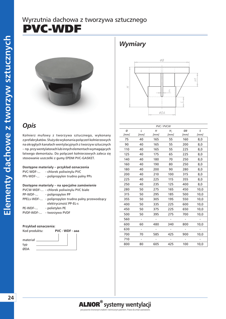 Elementy dachowe z tworzyw sztucznych Wyrzutnia dachowa z tworzywa sztucznego PVC-WDF Wymiary Opis PVC / PVCW Kołnierz mufowy z tworzywa sztucznego, wykonany z prefabrykatów. Służy do wykonania połączeń kołnierzowych na okrągłych kanałach wentylacyjnych z tworzyw sztucznych – np. przy wentylatorach lub innych elementach wymagających łatwego demontażu. Do połączeń kołnierzowych zaleca się stosowanie uszczelki z gumy EPDM PVC-GASKET. Dostępne materiały – przykład oznaczenia PVC-WDF-... - chlorek poliwinylu PVC PPs-WDF-... - polipropylen trudno palny PPs Dostępne materiały – na specjalne zamówienie PVCW-WDF-... - chlorek poliwinylu PVC białe PP-WDF-... - polipropylen PP PPELs-WDF-... - polipropylen trudno palny przewodzący elektryczność PP-EL-s PE-WDF-... - polietylen PE PVDF-WDF-... - tworzywo PVDF Przykład oznaczenia: Kod produktu: PVC - WDF - aaa materiał typ ØDA 24 Ø [mm] L [mm] H [mm] H1 [mm] ØB [mm] S [mm] 75 40 165 55 160 8,0 90 40 165 55 200 8,0 110 40 165 55 225 8,0 125 40 175 65 225 8,0 140 40 180 70 250 8,0 160 40 190 80 250 8,0 180 40 200 90 280 8,0 200 40 210 100 315 8,0 225 40 225 115 355 8,0 250 40 235 125 400 8,0 280 50 275 165 450 10,0 315 50 295 185 500 10,0 355 50 305 195 550 10,0 400 50 335 225 600 10,0 450 50 375 225 650 10,0 500 50 395 275 700 10,0 560 - - - - - 600 60 480 340 800 10,0 630 - - - - - 700 70 585 425 900 10,0 710 - - - - - 800 80 605 425 100 10,0 ALNOR® systemy wentylacji jest prawnie chronionym znakiem i technicznym patentem. Prawo do zmian zastrzeżone. Wyrzutnia dachowa z tworzywa sztucznego Wymiary PP / PPs / PE / PP-EL-s Ø [mm] L [mm] H [mm] H1 [mm] ØB [mm] S [mm] 75 40 165 55 160 8,0 90 40 165 55 200 8,0 110 40 165 55 225 8,0 125 40 175 65 225 8,0 140 40 180 70 250 8,0 160 40 190 80 250 8,0 180 40 200 90 280 8,0 200 40 210 100 315 8,0 225 40 225 115 355 8,0 250 40 235 125 400 8,0 280 50 275 165 450 10,0 315 50 295 185 500 10,0 355 50 305 195 550 10,0 400 50 335 225 600 10,0 10,0 450 50 375 225 650 500 50 395 275 700 10,0 560 60 425 305 750 10,0 600 60 480 340 800 10,0 630 70 540 425 850 10,0 700 70 585 425 900 10,0 710 70 605 425 900 10,0 800 80 605 425 100 10,0 ALNOR® systemy wentylacji jest prawnie chronionym znakiem i technicznym patentem. Prawo do zmian zastrzeżone. Elementy dachowe z tworzyw sztucznych PVC-WDF 25
