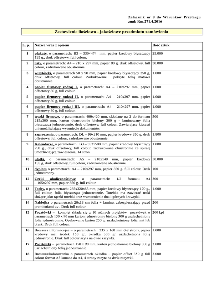 Załącznik nr 8 do Warunków Przetargu znak Rm.271.4.2016 Zestawienie ilościowo - jakościowe przedmiotu zamówienia L. p. Nazwa wraz z opisem Ilość sztuk 1 plakaty, o parametrach: B3 – 330×474 mm, papier kredowy błyszczący 25.000 135 g., druk offsetowy, full colour. 2 listy, o parametrach: A4 – 210 x 297 mm, papier 80 g. druk offsetowy, full 30.000 colour, zadrukowane obustronnie. 3 wizytówki, o parametrach 50 x 90 mm, papier kredowy błyszczący 350 g, 1.000 druk offsetowy, full colour. Zadrukowane pokryte folią matowa obustronnie. 4 papier firmowy rodzaj I, o parametrach: A4 – 210x297 mm, papier 1.000 offsetowy 80 g, full colour. 5 papier firmowy rodzaj II, o parametrach: A4 – 210x297 mm, papier 1.000 offsetowy 80 g, full colour. 6 papier firmowy rodzaj III, o parametrach: A4 – 210x297 mm, papier 1.000 offsetowy 80 g, full colour. 7 teczki firmowe, o parametrach: 499x420 mm, składane na 2 do formatu 500 215x300 mm, karton dwustronnie bielony 300 g - laminowany folią błyszczącą jednostronnie, druk offsetowy, full colour. Zawierające kieszeń uniemożliwiającą wysunięcie dokumentów. 8 zaproszenia, o parametrach: DL – 99x210 mm, papier kredowy 350 g, druk 1.800 offsetowy, full colour, zadrukowane obustronnie. 9 Kalendarze, o parametrach: B3 – 353x500 mm, papier kredowy błyszczący 1.000 250 g., druk offsetowy, full colour, zadrukowane obustronnie ze spiralą umożliwiającą zawieszenie, 14 stron. 10 ulotki, o parametrach: A5 – 210x148 mm, papier 135 g, druk offsetowy, full colour, zadrukowane obustronnie. 11 dyplom o parametrach: A4 – 210x297 mm, papier 350 g. full colour. Druk 100 jednostronny. 12 Czeki okolicznościowe o parametrach: – 105x297 mm, papier 350 g. full colour. 13 Torby, o parametrach: 235x320x85 mm, papier kredowy błyszczący 170 g., 1.000 full colour, folia błyszcząca jednostronnie. Torebka ma zawierać troki służące jako rączki torebki oraz wzmocnienie dna i górnych krawędzi. 14 Naklejka o parametrach 26x18 cm folia + laminat zabezpieczający przed 200 promieniami uv . Druk full colour 15 Pocztówki – komplet składa się z 10 różnych projektów pocztówek o 200 kpl parametrach 150 x 90 mm karton jednostronny bielony 300 g uszlachetniony folią jednostronnie. Opakowanie karton 250 gr uszlachetniony folią mat lub błysk. Druk full colour. 16 Broszura informacyjna – o parametrach 235 x 160 mm (48 stron), papier 1.000 kredowy mat środek 150 gr, okładka 300 gr uszlachetnona folią jednostronie. Druk full colour szyta na dwie zszywki. 17 Pocztówki – parametrach 150 x 90 mm, karton jednostronnie bielony 300 g 3.000 uszlachetniony folią jednostronnie. 18 Broszura/kolorowanka o parametrach okładka – papier offset 350 g full 3.000 colour format A3 łamane do A4, 4 strony zszyte na dwie zszywki. 1/2 kredowy 50.000 formatu A4 300
