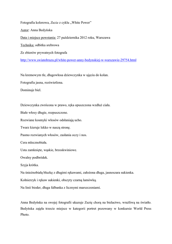 Fotografia kolorowa, Zuzia z cyklu „White Power” Autor: Anna Bedyńska Data i miejsce powstania: 27 października 2012 roku, Warszawa Technika: odbitka srebrowa Ze zbiorów prywatnych fotografa http://www.swiatobrazu.pl/white-power-anny-bedynskiej-w-warszawie-29754.html Na kremowym tle, długowłosa dziewczynka w ujęciu do kolan. Fotografia jasna, rozświetlona. Dominuje biel. Dziewczynka zwrócona w prawo, ręka opuszczona wzdłuż ciała. Białe włosy długie, rozpuszczone. Rozwiane kosmyki włosów odsłaniają ucho. Twarz kieruje lekko w naszą stronę. Pasmo rozwianych włosów, zasłania oczy i nos. Cera mlecznobiała. Usta zamknięte, wąskie, brzoskwiniowe. Owalny podbródek. Szyja krótka. Na śnieżnobiałą bluzkę z długimi rękawami, założona długa, jasnoszara sukienka. Kołnierzyk i rękaw sukienki, obszyty czarną lamówką. Na linii bioder, długa falbanka z licznymi marszczeniami. Anna Bedyńska na swojej fotografii ukazuje Zuzię chorą na bielactwo, wrażliwą na światło. Bedyńska zajęła trzecie miejsce w kategorii portret pozowany w konkursie World Press Photo.