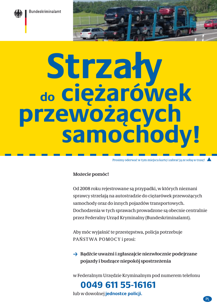 Strzały ciężarówek przewożących samochody! do Prosimy oderwać w tym miejscu kartę i zabrać ją ze sobą w trasę! Możecie pomóc! Od 2008 roku rejestrowane są przypadki, w których nieznani sprawcy strzelają na autostradzie do ciężarówek przewożących samochody oraz do innych pojazdów transportowych. Dochodzenia w tych sprawach prowadzone są obecnie centralnie przez Federalny Urząd Kryminalny (Bundeskriminalamt). Aby móc wyjaśnić te przestępstwa, policja potrzebuje PA ŃS T WA P O M O C Y i prosi: ƒ Bądźcie uważni i zgłaszajcie niezwłocznie podejrzane pojazdy i budzące niepokój spostrzeżenia w Federalnym Urzędzie Kryminalnym pod numerem telefonu 0049 611 55-16161 lub w dowolnej jednostce policji. PL Prosimy o pomoc – chodzi o państwa bezpieczeństwo! Im szybciej zgłosicie stwierdzone szkody i podejrzane sytuacje, tym większe są szanse na ujęcie sprawcy bądź sprawców. Dlatego: ƒ sprawdzajcie ładunek swoich ciężarówek przed dokonaniem rozładunku. Zwracajcie szczególną uwagę na to, czy istnieją ślady postrzałowe. Jeżeli stwierdzicie ślady po strzałach, nie rozładowujcie pojazdu, lecz poinformujcie natychmiast najbliższą jednostkę policji lub zadzwońcie do Federalnego Urzędu Kryminalnego pod numer 0049 611 55-16161 ƒ Sprawdzajcie ładunek podczas każdego postoju! ƒ Obserwujcie pojazdy, które Was wyprzedzają. Zwracajcie szczególną uwagę na podejrzanie powoli wykonywane manewry wyprzedzania. ƒ Zgłaszajcie natychmiast każde podejrzenie! Jeżeli stwierdzicie Państwo szkodę lub chcecie powiadomić o podejrzeniu, prosimy o podanie następujących, istotnych dla nas danych: ƒ Swoją dokładną trasę przejazdu ƒ Dokładny czas i miejsce dokonania spostrzeżeń ƒ Dane dotyczące czasu jazdy i postojów ƒ Czas i miejsce dokonania ostatniej kontroli ładunku ƒ Jeżeli uszkodzony został ładunek – dokładną pozycję uszkodzonego pojazdu na powierzchni ładunkowej i kierunek załadunku. PL
