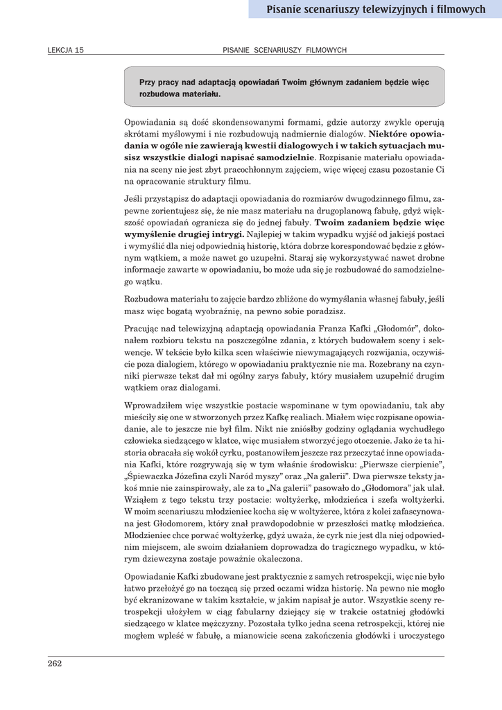 Pisanie scenariuszy telewizyjnych i filmowych LEKCJA 15 PISANIE SCENARIUSZY FILMOWYCH Przy pracy nad adaptacj¹ opowiadañ Twoim g³ównym zadaniem bêdzie wiêc rozbudowa materia³u. Opowiadania s¹ doœæ skondensowanymi formami, gdzie autorzy zwykle operuj¹ skrótami myœlowymi i nie rozbudowuj¹ nadmiernie dialogów. Niektóre opowiadania w ogóle nie zawieraj¹ kwestii dialogowych i w takich sytuacjach musisz wszystkie dialogi napisaæ samodzielnie. Rozpisanie materia³u opowiadania na sceny nie jest zbyt pracoch³onnym zajêciem, wiêc wiêcej czasu pozostanie Ci na opracowanie struktury filmu. Jeœli przyst¹pisz do adaptacji opowiadania do rozmiarów dwugodzinnego filmu, zapewne zorientujesz siê, ¿e nie masz materia³u na drugoplanow¹ fabu³ê, gdy¿ wiêkszoœæ opowiadañ ogranicza siê do jednej fabu³y. Twoim zadaniem bêdzie wiêc wymyœlenie drugiej intrygi. Najlepiej w takim wypadku wyjœæ od jakiejœ postaci i wymyœliæ dla niej odpowiedni¹ historiê, która dobrze korespondowaæ bêdzie z g³ównym w¹tkiem, a mo¿e nawet go uzupe³ni. Staraj siê wykorzystywaæ nawet drobne informacje zawarte w opowiadaniu, bo mo¿e uda siê je rozbudowaæ do samodzielnego w¹tku. Rozbudowa materia³u to zajêcie bardzo zbli¿one do wymyœlania w³asnej fabu³y, jeœli masz wiêc bogat¹ wyobraŸniê, na pewno sobie poradzisz. Pracuj¹c nad telewizyjn¹ adaptacj¹ opowiadania Franza Kafki „G³odomór”, dokona³em rozbioru tekstu na poszczególne zdania, z których budowa³em sceny i sekwencje. W tekœcie by³o kilka scen w³aœciwie niewymagaj¹cych rozwijania, oczywiœcie poza dialogiem, którego w opowiadaniu praktycznie nie ma. Rozebrany na czynniki pierwsze tekst da³ mi ogólny zarys fabu³y, który musia³em uzupe³niæ drugim w¹tkiem oraz dialogami. Wprowadzi³em wiêc wszystkie postacie wspominane w tym opowiadaniu, tak aby mieœci³y siê one w stworzonych przez Kafkê realiach. Mia³em wiêc rozpisane opowiadanie, ale to jeszcze nie by³ film. Nikt nie zniós³by godziny ogl¹dania wychud³ego cz³owieka siedz¹cego w klatce, wiêc musia³em stworzyæ jego otoczenie. Jako ¿e ta historia obraca³a siê wokó³ cyrku, postanowi³em jeszcze raz przeczytaæ inne opowiadania Kafki, które rozgrywaj¹ siê w tym w³aœnie œrodowisku: „Pierwsze cierpienie”, „Œpiewaczka Józefina czyli Naród myszy” oraz „Na galerii”. Dwa pierwsze teksty jakoœ mnie nie zainspirowa³y, ale za to „Na galerii” pasowa³o do „G³odomora” jak ula³. Wzi¹³em z tego tekstu trzy postacie: wolty¿erkê, m³odzieñca i szefa wolty¿erki. W moim scenariuszu m³odzieniec kocha siê w wolty¿erce, która z kolei zafascynowana jest G³odomorem, który zna³ prawdopodobnie w przesz³oœci matkê m³odzieñca. M³odzieniec chce porwaæ wolty¿erkê, gdy¿ uwa¿a, ¿e cyrk nie jest dla niej odpowiednim miejscem, ale swoim dzia³aniem doprowadza do tragicznego wypadku, w którym dziewczyna zostaje powa¿nie okaleczona. Opowiadanie Kafki zbudowane jest praktycznie z samych retrospekcji, wiêc nie by³o ³atwo prze³o¿yæ go na tocz¹c¹ siê przed oczami widza historiê. Na pewno nie mog³o byæ ekranizowane w takim kszta³cie, w jakim napisa³ je autor. Wszystkie sceny retrospekcji u³o¿y³em w ci¹g fabularny dziej¹cy siê w trakcie ostatniej g³odówki siedz¹cego w klatce mê¿czyzny. Pozosta³a tylko jedna scena retrospekcji, której nie mog³em wpleœæ w fabu³ê, a mianowicie scena zakoñczenia g³odówki i uroczystego 262 PISANIE SCENARIUSZY FILMOWYCH LEKCJA 15 opuszczenia klatki przez G³odomora. Ca³y proces adaptacji i pisania tekstu pierwszej wersji scenariusza zaj¹³ mi cztery dni, wiêc niezbyt wiele. Powsta³ scenariusz 50-minutowego filmu. Potem poprawia³em tekst razem z re¿yserem jeszcze kilka razy, ale zasadniczy szkielet pozosta³ bez zmian. Dla przyk³adu weŸmy jedno zdanie z omawianego opowiadania Kafki: „I kiedy raz na pewien czas jakiœ pró¿niak przystan¹³ i mówi³ o oszustwie, to by³o to w tym sensie najg³upsze k³amstwo, jakie tylko obojêtnoœæ i wrodzona z³oœliwoœæ mog³y wymyœliæ, albowiem to nie G³odomór oszukiwa³, on pracowa³ uczciwie, to œwiat oszukiwa³ go o jego zap³atê.” W mojej adaptacji zosta³o ono rozbudowane do takiej sceny: 24. PLENER. TEREN CYRKU. DZIEÑ. Klatki ze zwierzêtami, stajnie. Obok klatki z G³odomorem przechodz¹ ludzie. Nie zwracaj¹ na niego uwagi, interesuj¹ ich tylko zwierzêta. Oko³o czterdziestoletni Mê¿czyzna, z papierosem w ustach i rêkami w kieszeniach, zatrzymuje siê przy klatce G³odomora, który le¿y na s³omie i wpatruje siê w niebo poprzez prêty klatki. MʯCZYZNA Jak leci? G³odomór ignoruje jego zaczepkê. MʯCZYZNA D³ugo tu siedzisz? Gdzie ta tabliczka z liczb¹ dni? Chyba jej nie zjad³eœ? Mê¿czyzna siê œmieje. G³odomór podnosi g³owê. G£ODOMÓR Nie ma tabliczki? MʯCZYZNA Ano nie ma. le siê spisujesz. Ludzie przechodz¹, patrz¹ i nie widz¹, jak d³ugo trwa ju¿ ta zabawa. Za co w takim razie ci p³ac¹? G£ODOMÓR To nie moja wina, ja tylko g³odujê. MʯCZYZNA Robimy ma³e oszustwa, co? 263 LEKCJA 15 PISANIE SCENARIUSZY FILMOWYCH Grozi G³odomorowi palcem i odchodzi, œmiej¹c siê na g³os. G£ODOMÓR Pan nic nie rozumie! Wszyscy mnie nie rozumiecie, ale kiedyœ przyjdzie czas g³odowania i wtedy sobie o mnie przypomnicie. Wtedy bêdzie ju¿ za póŸno! Wyczerpany G³odomór pada na s³omê. W przejœciu miêdzy klatkami nie ma nikogo. W tej scenie zrobi³em tylko jedno odstêpstwo od tekstu orygina³u – usun¹³em w ogóle tabliczkê z liczb¹ dni g³odowania. Uwa¿a³em, ¿e daje to lepszy efekt ni¿ tabliczka ze z³¹ liczb¹ dni, któr¹ trudno pokazaæ bez zbyt wielu kwestii dialogowych. Opowiadania takie jak „G³odomór” Franza Kafki, bêd¹ce swoistymi przypowieœciami, pe³nymi filozoficznych i poetyckich podtekstów, s¹ wyj¹tkowo trudne do adaptacji. Najlepiej wybieraæ takie opowiadania, które posiadaj¹ przynajmniej jedn¹ wyraŸn¹ lini
