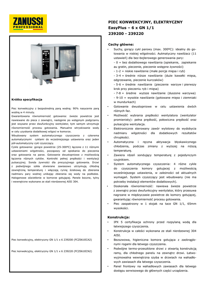 PIEC KONWEKCYJNY, ELEKTRYCZNY EasyPlus – 6 x GN 1/1 239200 - 239220 Cechy główne: • Suchy, gorący cykl parowy (max. 300ºC): idealny do gotowania w niskiej wilgotności. Autmatyczny nawilżacz (11 ustawień) dla bez-bojlerowego generowania pary: - 0 = bez dodatkowego nawilżania (opiekanie, zapiekanie au gratin, pieczenie, pieczenie wstępne żywności) - 1-2 = niskie nawilżenie (małe porcje mięsa i ryb) - 3-4 = średnie niższe nawilżanie (duże kawałki mięsa, odgrzewanie, pieczenie kurczaków) - 5-6 = średnie nawilżanie (pieczenie warzyw i pierwszy krok przy pieczeniu ryb i mięsa) - 7-8 = średnie Krótka specyfikacja w mundurkach) Piec konwekcyjny z bezpośrednią parą wodną: 90% nasycenie parą • równomierność gotowania: świeże powietrze jest • Wbudowany system automatycznymi automatycznego czyszczenia z • cyklami do wcześniejszego ustawienia oraz jeden wilgotności, począwszy od opiekania do • z podwójnego szkła otwierane zawiasowo utrzymują chłodną wilgotności dla dodatkowych rezultatów Automatyczna i ręczna podczas aktywacja zmiany z błyskawicznego wyższej na niższą temperaturę. • łączenia różnych cyklów. Kontrolki pełnej prędkości i wentylacji pulsacyjnej. Sonda żywności dla precyzyjnego gotowania. Drzwi dwóch Elektronicznie sterowany zawór wylotowy do wydobycia chłodzenia, pieczenia oraz gotowania na parze. Gotowanie dwustopniowe z możliwością ustawienia chrupkości. Cykle gotowania: gorące powietrze (25-300ºC) łączone z 11 różnymi ustawieniami celu Możliwość wybrania prędkości wentylatora (wentylator nadmiaru czterema pół-automatyczny cykl czyszczący. w pulsacyjna wentylacja. jest wsysane przez dwufunkcyjny wentylator, tym samym utrzymuje w celu uzyskania dodatkowej wilgoci w komorze. dwustopniowe promienisty): pełna prędkość, połowiczna prędkość oraz nawiewane do pieca z zewnątrz, następnie po wstępnym podgrzaniu równomierność procesu gotowania. Manualne wtryskiwanie wody Gotowanie różnych faz. wodną w 4 minuty. Gwarantowana wyższe nawilżanie (duszone warzywa) - 9-10 = wysokie nawilżanie (gotowane mięso i ziemniaki Zawiera rdzeń sondujący temperaturę z pojedynczym czujnikiem. • System do zewnętrzną temperaturę i włączają rynnę ściekową do zbierania automatycznego czyszczenia komory czyszczenia: gotujacej 4 z różne cykle możliwością nadmiaru pary wodnej unikając zbierania się wody na podłodze. wcześniejszego ustawienia, w zależności od aktualnych Halogenowe oświetlenie w komorze gotującej. Panele boczne, tylny wymagań. System czyszczący jest wbudowany (nie ma potrzeby instalacji elementów dodatkowych). i wewnętrzne wykonane ze stali nierdzewnej AISI 304. • Doskonała równomierność: nawiewa świeże powietrze z zewnątrz przez dwufunkcyjny wentylator, który przesuwa nagrzane w międzyczasie powietrze do komory gotującej, gwarantując równomierność procesu gotowania. • Piec zaopatrzony w 1 stojak na tace GN 1/1, 65mm wysokości. Konstrukcja: • IPX 5 certyfikacja ochrony przed rozpylaną wodą dla łatwiejszego czyszczenia. • Konstrukcja w całości wykonana ze stali nierdzewnej 304 AISI. Piec konwekcyjny, elektryczny GN 1/1 x 6 239200 (FCZ061ECA2) • Bezszwowa, higieniczna komora gotująca z zaokrąglonymi rogami dla łatwego czyszczenia. Piec konwekcyjny, elektryczny GN 1/1 x 6 239220 (FCZ061ECN2) • Podwójne termo-przeszklone drzwi z otwartą konstrukcją ramy, dla chłodnego panelu na zewnątrz drzwi. Łatwowyjmowalna wewnętrzna szyba w drzwiach na wahadłowych zawiasach dla łatwego czyszczenia. • Panel frontowy na wahadłowych zawiasach dla łatwego dostępu serwisowego do głównych części urządzenia. Opcjonalne akcesoria: • • Wylotowy kaptur bez wentylatora dla pieców GN 1/1 x 6 i 10. Obowiązkowym przewodu kominowego jest użycie (640413) kondensatora podczas • Wylotowy kaptur z wentylatorem dla pieców GN 1/1 x 6 i 10. Obowiązkowym przewodu kominowego jest użycie (640413) kondensatora podczas instalacji z piecami gazowymi – PNC 640792 • Kaptur elektyczny pochłaniający nieprzyjemne zapachy dla pieców GN 1/1 x 6 i 10 – PNC 640796 • Zmiękczacz wody z nabojem C500 dla pieców GN 1/1 x 6 i 10 (niskie-średnie zużycie pary wodnej – mniej niż 2 godziny na dzień pełnej pary) – PNC 920002 • Zmiękczacz wodyz nabojem STEAM 1200 – PNC 920003 • Automatyczny zmiękczacz wody – PNC 921305 • Dezinfekator żywiczny dla zmiękczacza wody – PNC 921306 • Zestaw kółek do podstawy dla pieców GN 1/1 x 6 i 10 – PNC 922003 • Wózek dla pieców GN 1/1 x 6 i 10 i bcf – PNC 922004 • Wózek na tace z kółkami dla pieców GN 1/1 x 6 o głębokości 65mm i bcf – PNC 922005 • Wózek na tace z kółkami dla pieców GN 1/1 x 5 o głębokości 80mm i bcf – PNC 922008 • Zestaw 4 regulowanych nóg dla pieców GN 1/1 x 6 i 10 – PNC 922012 • Para rusztów GN 1/1 wykonanych z AISI 304 – PNC 922017 • Wspornik tac dla otwartej podstawy do GN 1/1 x 6 i 10 – PNC 922021 • x 6 i 10 – PNC 922226 • Para rusztów GN 1/1 na całe kurczaki (8 na jeden ruszt) cukierniczych o wymiarach 400x600mm – PNC 922232 • 2 kosze do frytownicy dla pieców – PNC 922239 • Powłoka cieplna do piętrowania dla pieców GN 1/1x6 na GN 1/1x6 – PNC922244 • Stojak na blachy do pieczenia z kółkami dla pieców GN 1/1 x 6 o 80mm głębokości. Pozwala na użycie blach o wymiarach 400x600mm – PNC 922065 • Wsuwany stojak i rączka dla pieców GN 1/1 x 6 i 10 – PNC 922074 • Ruszt GN 1/1 na 4 całe kurczaki (1,2kg każdy) – PNC 922086 • • • • 922246 • Powłoka cieplna dla pieców GN 1/1 x 6 – PNC 922250 • Zamykanie na podwójne zaczepydo drzwi pieca – PNC 922265 • 922266 • Zintegrowany zestaw HACCP dla pieców – PNC 922275 • Zestaw stojaków cukierniczych do pieców GN 1/1 x 6 – PNC 922282 • Zestaw do drenażu dla pieców GN 1/1 x 6 i 10, GN 2/1 x 10 o średnicy 50mm 