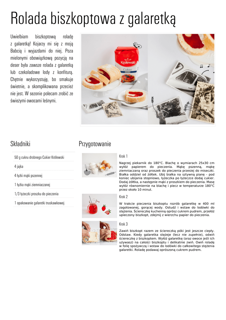 Powered by TCPDF (www.tcpdf.org) Rolada biszkoptowa z galaretką Uwielbiam biszkoptową roladę z galaretką! Kojarzy mi się z moją Babcią i wyjazdami do niej. Poza mielonymi obowiązkową pozycją na deser była zawsze rolada z galaretką lub czekoladowe lody z konfiturą. Chętnie wykorzystuję, bo smakuje świetnie, a skomplikowana przecież nie jest. W sezonie polecam zrobić ze świeżymi owocami leśnymi. Składniki 50 g cukru drobnego Cukier Królewski 4 jajka 4 łyżki mąki pszennej 1 łyżka mąki ziemniaczanej 1/3 łyżeczki proszku do pieczenia 1 opakowanie galaretki truskawkowej Przygotowanie Krok 1 Nagrzej piekarnik do 180°C. Blachę o wymiarach 25x30 cm wyłóż papierem do pieczenia. Mąkę pszenną, mąkę ziemniaczaną oraz proszek do pieczenia przesiej do miseczki. Białka oddziel od żółtek. Ubij białka na sztywną pianę - pod koniec ubijania stopniowo, łyżeczka po łyżeczce dodaj cukier. Dodaj żółtka, a następnie mąki z proszkiem do pieczenia. Masę wyłóż równomiernie na blachę i piecz w temperaturze 180°C przez około 10 minut. Krok 2 W trakcie pieczenia biszkoptu rozrób galaretkę w 400 ml zagotowanej, gorącej wody. Ostudź i wstaw do lodówki do stężenia. Ściereczkę kuchenną oprósz cukrem pudrem, przełóż upieczony biszkopt, zdejmij z wierzchu papier do pieczenia. Krok 3 Zawiń biszkopt razem ze ściereczką póki jest jeszcze ciepły. Odstaw. Kiedy galaretka stężeje (lecz nie zupełnie), odwiń ściereczkę z biszkoptem. Wyłóż galaretkę (oraz owoce jeśli ich używasz) na całości biszkoptu i delikatnie zwiń. Owiń roladę w folię spożywczą i wstaw do lodówki do całkowitego stężenia galaretki. Roladę podawaj oprószoną cukrem pudrem.