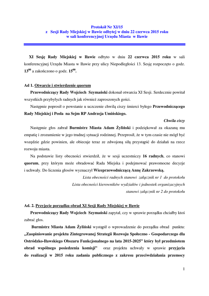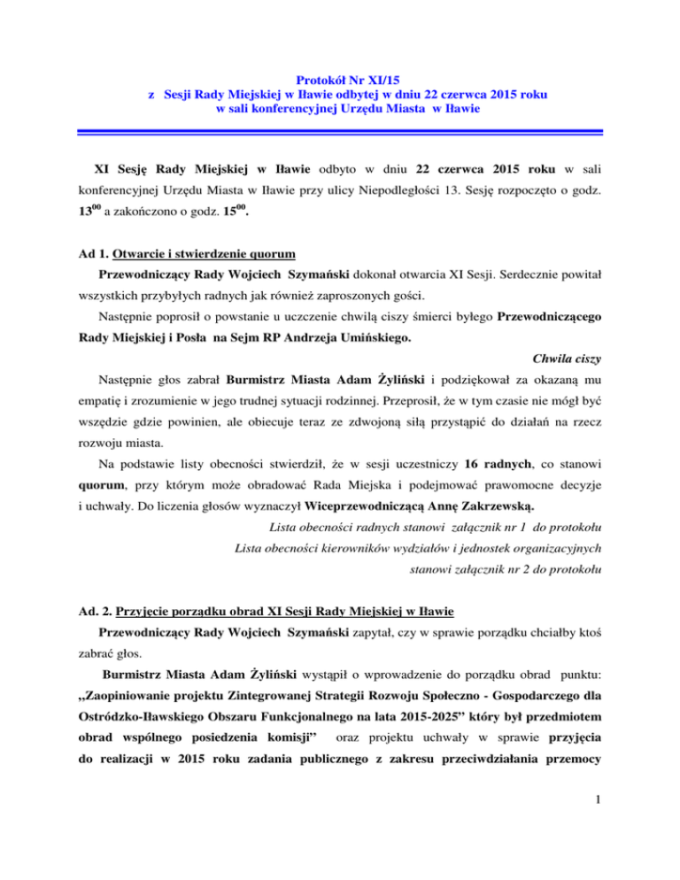 Protokół Nr XI/15 z Sesji Rady Miejskiej w Iławie odbytej w dniu 22 czerwca 2015 roku w sali konferencyjnej Urzędu Miasta w Iławie XI Sesję Rady Miejskiej w Iławie odbyto w dniu 22 czerwca 2015 roku w sali konferencyjnej Urzędu Miasta w Iławie przy ulicy Niepodległości 13. Sesję rozpoczęto o godz. 1300 a zakończono o godz. 1500. Ad 1. Otwarcie i stwierdzenie quorum Przewodniczący Rady Wojciech Szymański dokonał otwarcia XI Sesji. Serdecznie powitał wszystkich przybyłych radnych jak również zaproszonych gości. Następnie poprosił o powstanie u uczczenie chwilą ciszy śmierci byłego Przewodniczącego Rady Miejskiej i Posła na Sejm RP Andrzeja Umińskiego. Chwila ciszy Następnie głos zabrał Burmistrz Miasta Adam Żyliński i podziękował za okazaną mu empatię i zrozumienie w jego trudnej sytuacji rodzinnej. Przeprosił, że w tym czasie nie mógł być wszędzie gdzie powinien, ale obiecuje teraz ze zdwojoną siłą przystąpić do działań na rzecz rozwoju miasta. Na podstawie listy obecności stwierdził, że w sesji uczestniczy 16 radnych, co stanowi quorum, przy którym może obradować Rada Miejska i podejmować prawomocne decyzje i uchwały. Do liczenia głosów wyznaczył Wiceprzewodniczącą Annę Zakrzewską. Lista obecności radnych stanowi załącznik nr 1 do protokołu Lista obecności kierowników wydziałów i jednostek organizacyjnych stanowi załącznik nr 2 do protokołu Ad. 2. Przyjęcie porządku obrad XI Sesji Rady Miejskiej w Iławie Przewodniczący Rady Wojciech Szymański zapytał, czy w sprawie porządku chciałby ktoś zabrać głos. Burmistrz Miasta Adam Żyliński wystąpił o wprowadzenie do porządku obrad punktu: „Zaopiniowanie projektu Zintegrowanej Strategii Rozwoju Społeczno - Gospodarczego dla Ostródzko-Iławskiego Obszaru Funkcjonalnego na lata 2015-2025” który był przedmiotem obrad wspólnego posiedzenia komisji” oraz projektu uchwały w sprawie przyjęcia do realizacji w 2015 roku zadania publicznego z zakresu przeciwdziałania przemocy 1 Protokół Nr XI/15 z Sesji Rady Miejskiej w Iławie odbytej w dniu 22 czerwca 2015 roku w sali konferencyjnej Urzędu Miasta w Iławie w rodzinie realizowanego w ramach Programu Osłonowego „Wspieranie jednostek samorządu terytorialnego w tworzeniu systemu przeciwdziałania przemocy w rodzinie” PN. „Rodzina – nasz start” oraz zdjęcie z porządku projektu uchwały w sprawie nabycia nieruchomości położonej przy Alei Jana Pawła II Przewodniczący Rady Wojciech Szymański wystąpił z wnioskiem o wprowadzenie do porządku dwóch projektów uchwał: - w sprawie rozpatrzenia zarzutów zawartych w skardze na Burmistrza Miasta Iławy (wniesiona przez Stowarzyszenie na Rzecz Rozwoju Iławy) - w sprawie rozpatrzenia zarzutów zawartych w skardze na Burmistrza Miasta Iławy (wniesiona przez radną Anną Zakrzewską) Poddany pod głosowanie jawne wniosek o zdjęcie z porządku projektu uchwały w sprawie nabycia nieruchomości położonej przy Alei Jana Pawła II został przyjęty pozytywnie jednogłośnie Poddany pod głosowanie jawne wniosek o wprowadzenie do porządku projektu uchwały w sprawie przyjęcia do realizacji w 2015 roku zadania publicznego z zakresu przeciwdziałania przemocy w rodzinie realizowanego w ramach Programu Osłonowego „Wspieranie jednostek samorządu terytorialnego w tworzeniu systemu przeciwdziałania przemocy w rodzinie” PN. „Rodzina – nasz start” został przyjęty pozytywnie przy jednogłośnie Poddany pod głosowanie jawne wniosek o wprowadzenie do porządku projektu uchwały w sprawie rozpatrzenia zarzutów zawartych w skardze na Burmistrza Miasta Iławy (wniesiona przez Stowarzyszenie na Rzecz Rozwoju Iławy) został przyjęty pozytywnie przy 1 głosie przeciwnym Poddany pod głosowanie jawne wniosek o wprowadzenie do porządku projektu uchwały w sprawie w sprawie rozpatrzenia zarzutów zawartych w skardze na Burmistrza Miasta Iławy (wniesiona przez radną Anną Zakrzewską) został przyjęty pozytywnie przy 1 głosie przeciwnym 2 Protokół Nr XI/15 z Sesji Rady Miejskiej w Iławie odbytej w dniu 22 czerwca 2015 roku w sali konferencyjnej Urzędu Miasta w Iławie Poddany pod głosowanie jawne wniosek o wprowadzenie do porządku punktu „Zaopiniowanie projektu Zintegrowanej Strategii Rozwoju Społeczno - Gospodarczego dla Ostródzko-Iławskiego Obszaru Funkcjonalnego na lata 2015-2025” został przyjęty pozytywnie jednogłośnie Przewodniczący Rady Wojciech Szymański poddał pod głosowanie porządek obrad XI sesji uwzględniający przegłosowane zmiany; porządek został przyjęty pozytywnie jednogłośnie w następującym brzmieniu: 1. Otwarcie i stwierdzenie quorum 2. Ustalenie porządku obrad 3. Przyjęcie protokołu z X Sesji 4. Zaopiniowanie projektu Zintegrowanej Strategii Rozwoju Społeczno - Gospodarczego dla Ostródzko-Iławskiego Obszaru Funkcjonalnego na lata 2015-2025 5. Podjęcie uchwał w sprawie: a) zmian w wieloletniej prognozie finansowej miasta na lata 2015-29 b) zmian w budżecie miasta na 2015 rok c) udzielenia dotacji celowej Gminie Miejskiej Ostróda na dofinansowanie projektu pn. "Plan gospodarki niskoemisyjnej dla Ostródzko-Iławskiego Obszaru Funkcjonalnego" d) powołania Zespołu do spraw przeprowadzenia wyborów na ławników do sądów powszechnych na kadencję 2016-2019. e) nadania tytułu Zasłużony dla Miasta Iławy f) wysokości i zasad ustalania oraz rozliczania dotacji celowej dla podmiotów prowadzących żłobki, kluby dziecięce lub zatrudniających dziennych opiekunów na terenie gminy Miejskiej Iława g) określenia trybu i szczegółowych kryteriów oceny wniosków o realizację zadania publicznego w ramach inicjatywy lokalnej. h) przeprowadzenia na terenie Gminy Miejskiej Iława konsultacji społecznych dotyczących budżetu obywatelskiego na rok 2017 i) uchwalenia regulaminu korzystania z obiektu bazy wioślarskiej przy ul. J. Dąbrowskiego 3 Protokół Nr XI/15 z Sesji Rady Miej