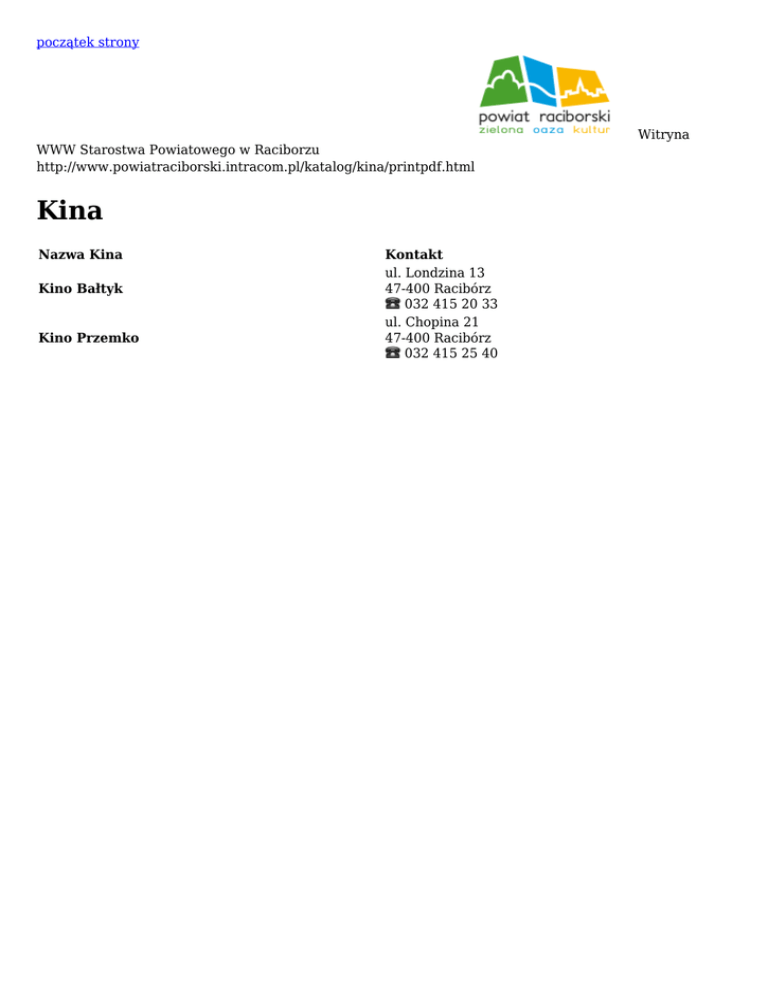 początek strony Witryna WWW Starostwa Powiatowego w Raciborzu http://www.powiatraciborski.intracom.pl/katalog/kina/printpdf.html Kina Nazwa Kina Kino Bałtyk Kino Przemko Kontakt ul. Londzina 13 47-400 Racibórz 032 415 20 33 ul. Chopina 21 47-400 Racibórz 032 415 25 40