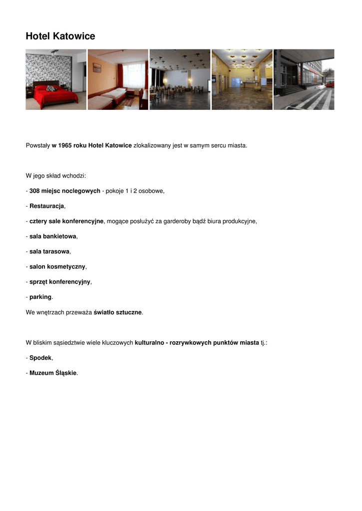 Hotel Katowice Powstały w 1965 roku Hotel Katowice zlokalizowany jest w samym sercu miasta. W jego skład wchodzi: - 308 miejsc noclegowych - pokoje 1 i 2 osobowe, - Restauracja, - cztery sale konferencyjne, mogące posłużyć za garderoby bądź biura produkcyjne, - sala bankietowa, - sala tarasowa, - salon kosmetyczny, - sprzęt konferencyjny, - parking. We wnętrzach przeważa światło sztuczne. W bliskim sąsiedztwie wiele kluczowych kulturalno - rozrywkowych punktów miasta tj.: - Spodek, - Muzeum Śląskie. Informacje dodatkowe Wymagane zezwolenie: Tak Natężenie światła: Średnie Natężenie hałasu: Średnie Media Odległość od bazy produkcyjnej: Na miejscu Możliwość dojazdu: Tak Powered by TCPDF (www.tcpdf.org)