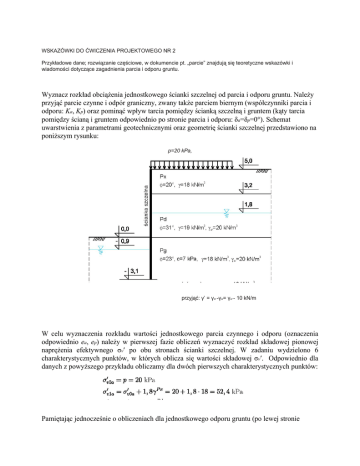 WSKAZÓWKI DO ĆWICZENIA PROJEKTOWEGO NR 2 Przykładowe dane; rozwiązanie częściowe, w dokumencie pt. „parcie” znajdują się teoretyczne wskazówki i wiadomości dotyczące zagadnienia parcia i odporu gruntu. Wyznacz rozkład obciążenia jednostkowego ścianki szczelnej od parcia i odporu gruntu. Należy przyjąć parcie czynne i odpór graniczny, zwany także parciem biernym (współczynniki parcia i odporu: Ka, Kp) oraz pominąć wpływ tarcia pomiędzy ścianką szczelną i gruntem (kąty tarcia pomiędzy ścianą i gruntem odpowiednio po stronie parcia i odporu: δa=δp=0°). Schemat uwarstwienia z parametrami geotechnicznymi oraz geometrię ścianki szczelnej przedstawiono na poniższym rysunku: p=20 kPa, przyjąć: γ’ = γsr -γw= γsr - 10 kN/m W celu wyznaczenia rozkładu wartości jednostkowego parcia czynnego i odporu (oznaczenia odpowiednio ea, ep) należy w pierwszej fazie obliczeń wyznaczyć rozkład składowej pionowej naprężenia efektywnego σv′ po obu stronach ścianki szczelnej. W zadaniu wydzielono 6 charakterystycznych punktów, w których oblicza się wartości składowej σv′. Odpowiednio dla danych z powyższego przykładu obliczamy dla dwóch pierwszych charakterystycznych punktów: Pamiętając jednocześnie o obliczeniach dla jednostkowego odporu gruntu (po lewej stronie ścianki) dla dwóch pierwszych: Itd. W ten sposób uzyskujemy wykres rozkładu rozkładu σv′ przedstawiony na rysunku poniżej. Przyjęto oznaczenia σvia′ oraz σvip′ odpowiednio w przypadku składowych po stronie parcia czynnego oraz odporu. Numer i odpowiada numerowi punktu charakterystycznego (0-5). Wykres parcie-odpór powinien być wyznaczony na podstawie rozkładu składowej pionowej naprężenia efektywnego w gruncie. Ważnym oddziaływaniem dodatkowym, którego nie uwzględniono jest więc parcie wody wynikające z różnic poziomów zwierciadła wody gruntowej z lewej i prawej strony ścianki szczelnej (ΔH=1,8+0,9=2,7m). Należy przyjąć uproszczony schemat parcia wody, w którym parcie hydrostatyczne u rośnie od wyższego do niższego poziomu zwierciadła wody, natomiast głębiej oddziaływanie to pozostaje stałe do poziomu ostrza ścianki szczelnej (u=ΔH·γw=2,7·10=27 kPa). Schemat taki jest sztuczny ponieważ parcie wody maleje w nim skokowo do zera w poziomie ostrza ścianki oraz woda nie przepływa. W rzeczywistości parcie zmienia się monotonicznie oraz działa ciśnienie spływowe w wyniku filtracji wody. W przyjętym schemacie zakłada się, że efekty popełnienia błędów w tych dwóch założeniach znoszą się, a przyjęty schemat jest bardziej niekorzystny. Wykres parcia wody przedstawiono poniżej. Sumaryczny wykres obciążenia jednostkowego będzie sumą wykresów parcia i odporu gruntu oraz parcia wody (ei=eai-epi+ui). Wykres ten przedstawiono poniżej: