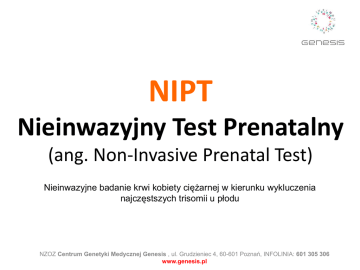 NIPT Nieinwazyjny Test Prenatalny (ang. Non-Invasive Prenatal Test) Nieinwazyjne badanie krwi kobiety ciężarnej w kierunku wykluczenia najczęstszych trisomii u płodu NZOZ Centrum Genetyki Medycznej Genesis , ul. Grudzieniec 4, 60-601 Poznań, INFOLINIA: 601 305 306 www.genesis.pl Cel testu NIPT • Celem testu NIPT jest uspokojenie pary oczekującej dziecka, że nie występują u niego najczęstsze trisomie. • Test polega na badaniu krwi kobiety ciężarnej, która zawiera DNA płodu. • Wykrywa on ponad 99% przypadków trisomii chromosomów pary 21 oraz wysoki odsetek przypadków trisomii 13 oraz 18. Pozwala także na określenie płci płodu. NZOZ Centrum Genetyki Medycznej Genesis , ul. Grudzieniec 4, 60-601 Poznań, INFOLINIA: 601 305 306 www.genesis.pl Metodyka testu NIPT • Test polega na badaniu krwi kobiety ciężarnej, która zawiera DNA płodu. • Materiał do badań stanowi 20ml krwi pobranej z żyły obwodowej kobiety ciężarnej, między 10 a 20 tygodniem ciąży . • Okres oczekiwania na wynik testu wynosi 3 tygodnie. NZOZ Centrum Genetyki Medycznej Genesis , ul. Grudzieniec 4, 60-601 Poznań, INFOLINIA: 601 305 306 www.genesis.pl Wskazania do testu NIPT • • • • wiek ciężarnej powyżej 35 lat, sonograficzne markery trisomii nieprawidłowy wynik testu podwójnego wystąpienie trisomii u dziecka z poprzedniej ciąży • niepokój rodziców NZOZ Centrum Genetyki Medycznej Genesis , ul. Grudzieniec 4, 60-601 Poznań, INFOLINIA: 601 305 306 www.genesis.pl Historia NIPT • 1997- odkrycie pozakomórkowego DNA płodowego (cell-free fetal DNA) w osoczu matki (Lo et al.) • 2001- badanie genotypu płodu Rh(D) • 2006 - określenie płci płodu w sytuacji zwiększonego ryzyka zespołów sprzężonych z chromosomem X • 2011- wykrywanie trisomii 21/18/13 • 2012 - ponad 100 000 pacjentek przebadanych w USA i Chinach 2013 - dziennie ponad 2 000 pacjentek zostaje poddanych badaniu NIPT na całym świecie NZOZ Centrum Genetyki Medycznej Genesis , ul. Grudzieniec 4, 60-601 Poznań, INFOLINIA: 601 305 306 www.genesis.pl Pozakomórkowe DNA płodowe (cell-free fetal DNA) DNA płodu DNA matki Zmodyfikowano za http://www.ariosadx.com/about-the-science/what-is-cfDNA-testing/ 5-15 % pozakomórkowego DNA w układzie krążenia matki stanowi DNA płodu (cff DNA) NZOZ Centrum Genetyki Medycznej Genesis , ul. Grudzieniec 4, 60-601 Poznań, INFOLINIA: 601 305 306 www.genesis.pl NIPT w publikacjach NZOZ Centrum Genetyki Medycznej Genesis , ul. Grudzieniec 4, 60-601 Poznań, INFOLINIA: 601 305 306 www.genesis.pl Zalety testu NIPT • wysoka czułość (niewielka liczba fałszywie ujemnych wyników) • wysoka specyficzność (niewielka liczba fałszywie dodatnich wyników) • badanie 4 chromosomów (21, 13, 18, Y) metoda nieinwazyjna, bez ryzyka dla płodu i kobiety ciężarnej NZOZ Centrum Genetyki Medycznej Genesis , ul. Grudzieniec 4, 60-601 Poznań, INFOLINIA: 601 305 306 www.genesis.pl Parametry techniczne testu ABERRACJA CZUŁOŚĆ SPECYFICZNOŚĆ Trisomia 21 > 99.5% 0.1% Trisomia 18 98 % 0.1% Trisomia 13 80 % 0.1% NZOZ Centrum Genetyki Medycznej Genesis , ul. Grudzieniec 4, 60-601 Poznań, INFOLINIA: 601 305 306 www.genesis.pl Wynik NIPT… i co dalej? • W przypadku prawidłowego wyniku testu NIPT nie ma wskazań do dalszych badań prenatalnych inwazyjnych (np. amniopunkcji), o ile nie występują u płodu nieprawidłowości anatomiczne. • W przypadku nieprawidłowego wyniku testu NIPT (stwierdzenie trisomii u płodu), pacjenci mogą podjąć decyzję o poddaniu się diagnostyce prenatalnej inwazyjnej (amniopunkcji), celem potwierdzenia wyniku NIPT. NZOZ Centrum Genetyki Medycznej Genesis , ul. Grudzieniec 4, 60-601 Poznań, INFOLINIA: 601 305 306 www.genesis.pl NIPT nie wykrywa • trisomii/monosomii innych chromosomów • trisomii chromosomów 21, 13 oraz 18 w postaci mozaikowej, tj. kiedy dodatkowy chromosom występuje u dziecka tylko w części komórek • nieprawidłowości pojedynczych genów • wad strukturalnych (np. wad cewy nerwowej) NZOZ Centrum Genetyki Medycznej Genesis , ul. Grudzieniec 4, 60-601 Poznań, INFOLINIA: 601 305 306 www.genesis.pl NIPT nie rekomenduje się w przypadkach: • wad anatomicznych płodu wykrytych badaniem USG • wyraźnie poszerzonej przezierności karkowej u płodu (ang. nuchal translucency, NT) • zwiększonego ryzyka nieprawidłowości genetycznych, które nie mogą zostać wykryte przez NIPT (np. nosicielstwo choroby jednogenowej, nosicielstwo translokacji zrównoważonej przez rodzica/rodziców) NZOZ Centrum Genetyki Medycznej Genesis , ul. Grudzieniec 4, 60-601 Poznań, INFOLINIA: 601 305 306 www.genesis.pl Wynik NIPT nie jest wiarygodny w przypadku: • ciąży bliźniaczej • ciąży u surogatki NZOZ Centrum Genetyki Medycznej Genesis , ul. Grudzieniec 4, 60-601 Poznań, INFOLINIA: 601 305 306 www.genesis.pl NIPT Czy może się nie udać? W przypadku <5% ciąż nie udaje się wyizolować DNA płodowego w wystarczającej ilości, aby wykonać test NIPT, nie ma to związku z występowaniem lub nie występowaniem trisomii u płodu, badanie należy powtórzyć. NZOZ Centrum Genetyki Medycznej Genesis , ul. Grudzieniec 4, 60-601 Poznań, INFOLINIA: 601 305 306 www.genesis.pl