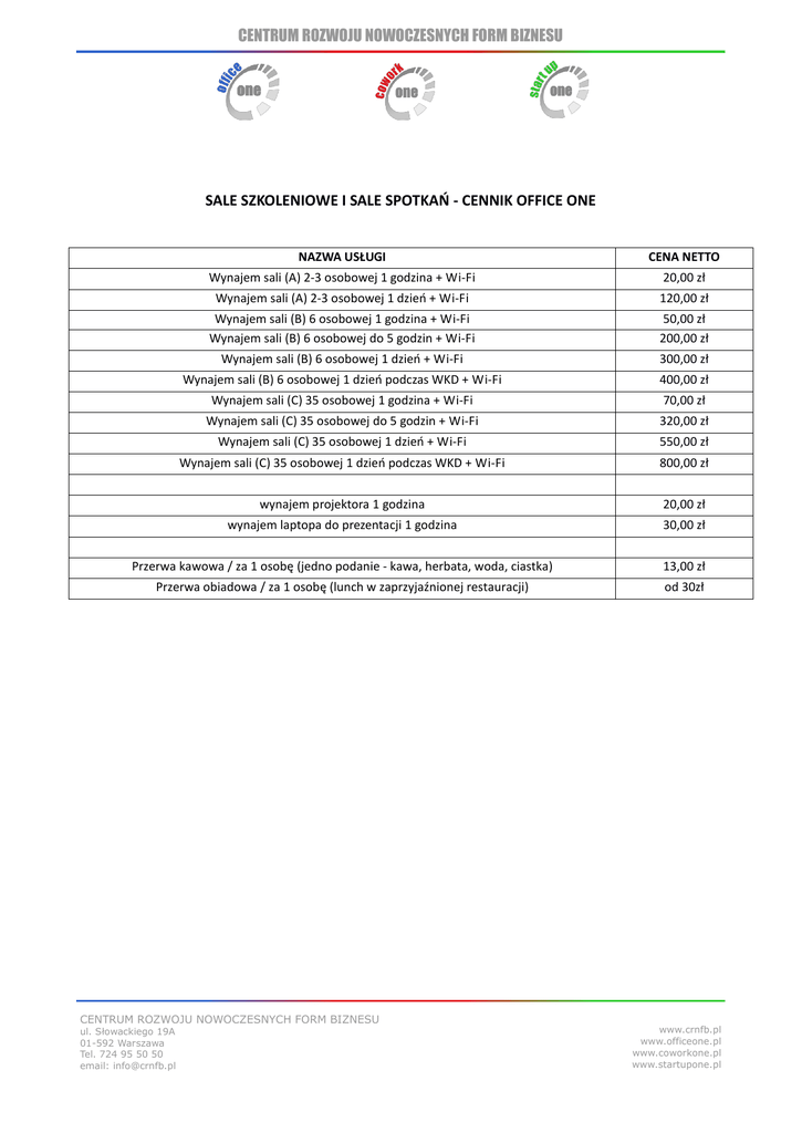CENTRUM ROZWOJU NOWOCZESNYCH FORM BIZNESU SALE SZKOLENIOWE I SALE SPOTKAŃ - CENNIK OFFICE ONE NAZWA USŁUGI CENA NETTO Wynajem sali (A) 2-3 osobowej 1 godzina + Wi-Fi 20,00 zł Wynajem sali (A) 2-3 osobowej 1 dzień + Wi-Fi 120,00 zł Wynajem sali (B) 6 osobowej 1 godzina + Wi-Fi Wynajem sali (B) 6 osobowej do 5 godzin + Wi-Fi 50,00 zł 200,00 zł Wynajem sali (B) 6 osobowej 1 dzień + Wi-Fi 300,00 zł Wynajem sali (B) 6 osobowej 1 dzień podczas WKD + Wi-Fi 400,00 zł Wynajem sali (C) 35 osobowej 1 godzina + Wi-Fi 70,00 zł Wynajem sali (C) 35 osobowej do 5 godzin + Wi-Fi 320,00 zł Wynajem sali (C) 35 osobowej 1 dzień + Wi-Fi 550,00 zł Wynajem sali (C) 35 osobowej 1 dzień podczas WKD + Wi-Fi 800,00 zł wynajem projektora 1 godzina 20,00 zł wynajem laptopa do prezentacji 1 godzina 30,00 zł Przerwa kawowa / za 1 osobę (jedno podanie - kawa, herbata, woda, ciastka) 13,00 zł Przerwa obiadowa / za 1 osobę (lunch w zaprzyjaźnionej restauracji) od 30zł CENTRUM ROZWOJU NOWOCZESNYCH FORM BIZNESU ul. Słowackiego 19A 01-592 Warszawa Tel. 724 95 50 50 email: [email protected] www.crnfb.pl www.officeone.pl www.coworkone.pl www.startupone.pl