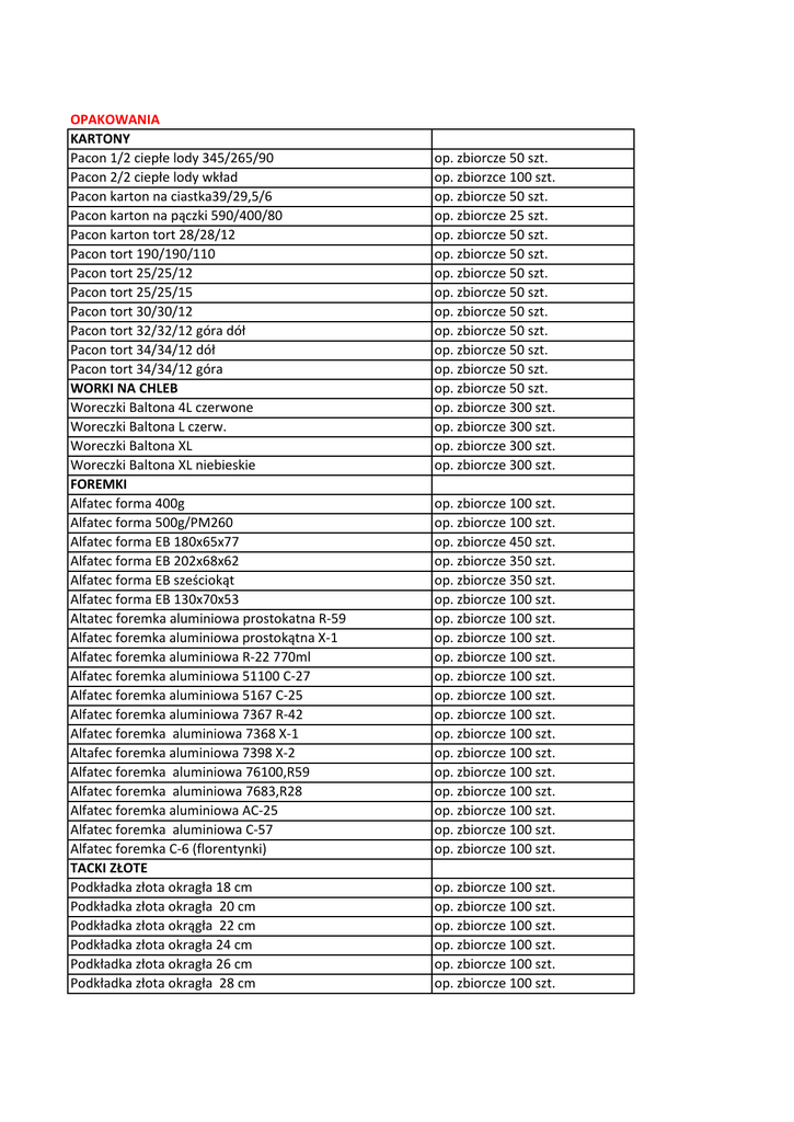 OPAKOWANIA KARTONY Pacon 1/2 ciepłe lody 345/265/90 Pacon 2/2 ciepłe lody wkład Pacon karton na ciastka39/29,5/6 Pacon karton na pączki 590/400/80 Pacon karton tort 28/28/12 Pacon tort 190/190/110 Pacon tort 25/25/12 Pacon tort 25/25/15 Pacon tort 30/30/12 Pacon tort 32/32/12 góra dół Pacon tort 34/34/12 dół Pacon tort 34/34/12 góra WORKI NA CHLEB Woreczki Baltona 4L czerwone Woreczki Baltona L czerw. Woreczki Baltona XL Woreczki Baltona XL niebieskie FOREMKI Alfatec forma 400g Alfatec forma 500g/PM260 Alfatec forma EB 180x65x77 Alfatec forma EB 202x68x62 Alfatec forma EB sześciokąt Alfatec forma EB 130x70x53 Altatec foremka aluminiowa prostokatna R-59 Alfatec foremka aluminiowa prostokątna X-1 Alfatec foremka aluminiowa R-22 770ml Alfatec foremka aluminiowa 51100 C-27 Alfatec foremka aluminiowa 5167 C-25 Alfatec foremka aluminiowa 7367 R-42 Alfatec foremka aluminiowa 7368 X-1 Altafec foremka aluminiowa 7398 X-2 Alfatec foremka aluminiowa 76100,R59 Alfatec foremka aluminiowa 7683,R28 Alfatec foremka aluminiowa AC-25 Alfatec foremka aluminiowa C-57 Alfatec foremka C-6 (florentynki) TACKI ZŁOTE Podkładka złota okragła 18 cm Podkładka złota okragła 20 cm Podkładka złota okrągła 22 cm Podkładka złota okragła 24 cm Podkładka złota okragła 26 cm Podkładka złota okragła 28 cm op. zbiorcze 50 szt. op. zbiorzce 100 szt. op. zbiorcze 50 szt. op. zbiorcze 25 szt. op. zbiorcze 50 szt. op. zbiorcze 50 szt. op. zbiorcze 50 szt. op. zbiorcze 50 szt. op. zbiorcze 50 szt. op. zbiorcze 50 szt. op. zbiorcze 50 szt. op. zbiorcze 50 szt. op. zbiorcze 50 szt. op. zbiorcze 300 szt. op. zbiorcze 300 szt. op. zbiorcze 300 szt. op. zbiorcze 300 szt. op. zbiorcze 100 szt. op. zbiorcze 100 szt. op. zbiorcze 450 szt. op. zbiorcze 350 szt. op. zbiorcze 350 szt. op. zbiorcze 100 szt. op. zbiorcze 100 szt. op. zbiorcze 100 szt. op. zbiorcze 100 szt. op. zbiorcze 100 szt. op. zbiorcze 100 szt. op. zbiorcze 100 szt. op. zbiorcze 100 szt. op. zbiorcze 100 szt. op. zbiorcze 100 szt. op. zbiorcze 100 szt. op. zbiorcze 100 szt. op. zbiorcze 100 szt. op. zbiorcze 100 szt. op. zbiorcze 100 szt. op. zbiorcze 100 szt. op. zbiorcze 100 szt. op. zbiorcze 100 szt. op. zbiorcze 100 szt. op. zbiorcze 100 szt. Podkładka złota okrągła 30cm Podkładka złota okragła 32cm Podkładka złota okragła 36cm Podkładka złota okragła 38 cm Podkładka złota prostokątna 40x30 Podkładka złota prostokątna 40X60 PAPIER DO PIECZENIA op. zbiorcze 100 szt. op. zbiorcze 100 szt. op. zbiorcze 100 szt. op. zbiorcze 100 szt. op. zbiorcze 10 kg oo. zbiorcze 10 kg Papier do pieczenia Thermohauser 40x60 Papier do pieczenia Silidor Papier pakowy biały 40x30 Papier pakowy biały 40x60 op. 500 szt. op. 500 szt. op. 10 kg op. 10 kg PAPILOTKI NA MUFINY Papilotka owalna Nr 6 złota Papilotki 2,5 Papilotki 3 Papilotki 3.5 nr 4 Papilotki 40 nr 5 Papilotki 45 nr 6 Papilotki 45 nr 6 Papilotki 50 nr 7 Papilotki 60 nr 8 Papilotki 70 nr 9 Papilotki 80 nr 10 Papilotki 90 nr 12 Papilotki nr 10 złota Papilotki nr 3 brąz Papilotki nr 8 brąz Papiloty mufiny brąz stelaż op. 1000 szt. op. 2000 szt. op. 2000 szt. op. 2000 szt. op. 2000 szt. op. 1000 szt. op. 2000 szt. op. 2000 szt. op. 2000 szt. op. 1000 szt. op. 1000 szt. op. 1000 szt. op. 1000 szt. op. 2000 szt. op. 2000 szt. op. 125 szt. KRĄŻKI POD TORT Krążek pod tort 18 cm Krążek pod tort 23 cm Krążek pod tort 24 cm Krążek pod tort 25 cm Krążek pod tort 29.5cm Krążek pod tort 30 cm SERWETKI Serwetki 17 cm Serwetki 17 cm x 17 cm Serwetki 19 cm Serwetki 21 cm Serwetki 23 cm Serwetki 25 cm x 11 cm Serwetki 25 cm x 32 cm Serwetki 26 cm Serwetki 28 cm Serwetki 30 cm op. zbiorcze 100 szt. op. zbiorcze 300 szt. op. zbiorcze 100 szt. op. zbiorcze 300 szt. op. zbiorcze 100 szt. op. zbiorcze 300 cm op. zbiorcze 250 szt. op. zbiorcze 250 szt. op. zbiorcze 250 szt. op. zbiorcze 250 szt. op. zbiorcze 250 szt. op. zbiorcze 250 szt. op. zbiorcze 250 szt. op. zbiorcze 250 szt. op. zbiorcze 250 szt. op. zbiorcze 250 szt. Serwetki 32 cm Serwetki 32 cm x 25 cm Serwetki 34 cm Serwetki 36 cm Serwetki 37 cm Serwetki 38 cm Serwetki 38 cm x 28 cm Serwetki 38 cm x 38 cm Serwetki 40 cm Serwetki 50 cm op. zbiorcze 250 szt. op. zbiorcze 250 szt. op. zbiorcze 250 szt. op. zbiorcze 250 szt. op. zbiorcze 250 szt. op. zbiorcze 250 szt. op. zbiorcze 250 szt. op. zbiorcze 250 szt. op. zbiorcze 250 szt. op. zbiorcze 250 szt. TACKI TEKTUROWE Pacon tacka 10cm x 30 cm Pacon tacka 13cm x 16 cm Pacon tacka 13cm x 20 cm Pacon tacka 14 cm x 20 cm Pacon tacka 15 cm x 20 cm Pacon tacka 17 cm x 24 cm Pacon tacka 20 cm x 30 cm Pacon tacka 54 cm x 34 cm op. zbiorcze 500 szt. op. zbiorcze 100 szt. op. zbiorcze 250 szt. op. zbiorcze 100 szt. op. zbiorcze 100 szt. op. zbiorcze 250 szt. op. zbiorcze 100 szt. op. zbiorcze 25 szt.