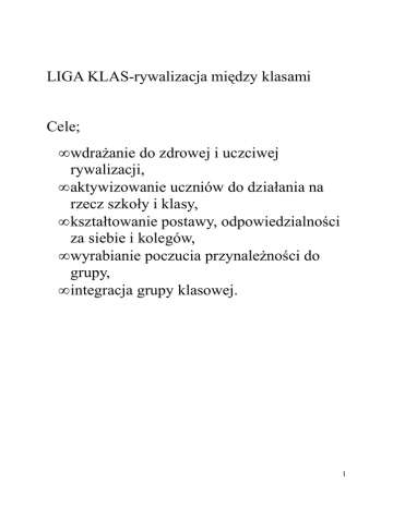 LIGA KLAS-rywalizacja między klasami Cele; • wdraŜanie do zdrowej i uczciwej rywalizacji, • aktywizowanie uczniów do działania na rzecz szkoły i klasy, • kształtowanie postawy, odpowiedzialności za siebie i kolegów, • wyrabianie poczucia przynaleŜności do grupy, • integracja grupy klasowej. 1 Zasady współpracy z Ligą Klas 1. Zapoznanie uczniów z regulaminem LK; 2. Wyznaczenie uczniów (najwyŜej dwóch), którzy będą reprezentować klasę raz w miesiącu na spotkaniach LK; 3. Sprawozdanie pisze cała klasa razem z wychowawcą (podpis wych. na sprawozdaniu); 4. Sprawozdania składają odpowiedzialni za LK w poszczególnych oddziałach u koordynatora LK na spotkaniu; 5. Terminy spotkań; - będą podawane na bieŜąco; 6. Nie będą przyjmowane sprawozdania (chyba, Ŝe wychowawca był nieobecny) bez podpisu wychowawcy; 7. Sprawozdania sporządzone nieregulaminowo nie będą brane pod uwagę; 8.Jeśli wyznaczone osoby reprezentujące klasę nie sprawdzą się, wychowawca moŜe na spotkanie wyznaczyć innych uczniów; 9.Regulaminy konkursów, inicjatyw oraz wyniki składamy osobiście lub przez reprezentantów klas u koordynatora LK; 10.Wyniki rywalizacji moŜemy śledzić na stroni internetowej szkoły; 11.Wszelkie reklamacje moŜna zgłaszać przez reprezentantów klas. 2 REGULAMIN LIGI KLAS W ZESPOLE SZKÓŁ NR 1 W KALWARII ZEBRZYDOWSKIEJ NA ROK SZKOLNY 2012/2013. 1. W lidze klas mogą brać udział klasy 4-6 Szkoły Podstawowej oraz klasy 1-3 Gimnazjum w Zespole Szkół Nr 1 w Kalwarii Zebrzydowskiej 2. Liga klas rozpoczyna się 01.09.2012, a kończy się 31.05.2013. 3. Wyniki rywalizacji są podawane systematycznie, co miesiąc. 4. Nad organizacją ligi klas czuwa komisja w składzie: • dyr. Z.S. Nr 1 mgr BoŜena Kołodziej; • mgr Małgorzata Cimer; • mgr Sabina Sarapata; • mgr Ewa Zamysłowska. 5. BieŜące wyniki będą prezentowane na tablicy ogłoszeń i na stronie internetowej. 6. Punkty do ligi przyznawane będą tylko za konkursy i zawody, w których mogą brać udział wszyscy uczniowie. 7. Termin kolejnego spotkania jest podawany z miesięcznym wyprzedzeniem na spotkaniu. 8. Za rzeczowość sprawozdania odpowiada wychowawca oraz osoba przez niego wyznaczona. 9. Wpisanie do sprawozdania danych niezgodnych z prawdą wiąŜe się z dyskwalifikacją klasy. 10. Komisja zastrzega sobie prawo do wyrywkowej kontroli dokumentacji związanej z konkursami i zawodami( protokoły, karty wycieczek). 11. W przypadku nie złoŜenia przez przewodniczącego lub przez osobę upowaŜnioną sprawozdania w określonym terminie, klasa nie otrzymuje punktów w danym miesiącu. 12. W roku szkolnym 2012/13 rywalizacja klas będzie obejmowała następujące obszary: 3 I. Udział w konkursach , olimpiadach. Klasa uzyskuje punkty za wystawienie reprezentacji( nawet jednej osoby) do konkursu: konkursy szkolne 5p. konkursy międzyszkolne 10p. (I m. 30p., II m. 20p., III m. 15p.) konkursy powiatowe 15p. konkursy wojewódzkie 20p. konkursy ogólnopolskie 25p. (I m. 40p., II m. 30p., III m. 20p.) konkursy międzynarodowe 30p. II. Udział w zawodach sportowych. Klasa uzyskuje punkty za wystawienie reprezentacji( nawet jednej osoby) do konkursu: konkursy szkolne 5p. konkursy międzyszkolne 10p. (I m. 30p., II m. 20p., III m. 15p.) konkursy powiatowe 15p. konkursy wojewódzkie 20p. konkursy ogólnopolskie 25p. 20p.) (I m. 40p., II m. 30p., III m. konkursy międzynarodowe 30p. III. Wystrój klasy Punkty przyznawane są za wystrój danej klasy raz w miesiącu, a następnie naliczaneklasom, które się nią opiekują-max. 20pkt. 4 IV. Organizacjaimprez okolicznościowych w tym apeli dla uczniów szkoły i środowiska Komisja przyznaje od 20 do 50 punktów- w zaleŜności od poziomu przygotowania danej klasydo apelu. V. Praca na rzecz szkoły(gazetka szkolna, róŜnego rodzaju zbiórki, przestrzeganie czystości w klasach, dbanie o prządek w szatniach, wykładanie krzeseł na stoliki po ostatniej lekcji ) –max 20pkt. VI. Frekwencja w klasach Na podstawie sprawozdań raz w miesiącu będą przydzielane punkty wg. następujących kryteriów: • frekwencja powyŜej 95% • frekwencja 95-93% 15p. • frekwencja 92-90% 10p. • frekwencja 89-87% 5p. • frekwencja poniŜej 86% 20p. 0p. VII. Udział uczniów w uroczystościach państwowych Punkty będą przyznawane na podstawie procentowego udziału uczniów w danej uroczystości i tak; powyŜej 90% 50p. 89-75% 40p. 74-65% 35p. 64-50% 30p. 5 49-35% - 20p. 34-20% - 15p. 19-10% - 10p. PoniŜej 10% - VIII. 0p. Wyniki nauczania poszczególnych klas- średnie klas Punkty będą przyznawane na zakończenie I i II semestru czyli dwukrotnie w ciągu roku: I miejsce 100p. II miejsce 95p. III miejsce 90p. itd. IX. Oceny z zachowania Punkty będą przyznawane na zakończenie I i II semestru czyli dwukrotnie w ciągu roku: I miejsce 100p. II miejsce 95p. III miejsce 90p. X. itd. Czytelnictwo Punkty będą przyznawane na zakończenie I i II semestru czyli dwukrotnie w ciągu roku: I miejsce 60p. II miejsce 55p. III miejsce 50p. itd. 6 XI. Spóźnienia, wagary, nie noszenie stroju szkolnego Klasa która w ciągu miesiąca wykaŜe największą ilość spóźnień otrzymuje jednorazowo karnie; I miejsce -20 pkt II miejsce -15 pkt III miejsce -10 pkt KaŜdorazowe wagary jednego lub kilku uczniów z danej klasy to karne – 20 pkt. KaŜdorazowy brak stroju szkolnego jednego ucznia to -5 pkt. dla danej klasy. Klasy, które zdobędą I, II, III miejsce zostaną nagrodzone dyplomami i nagrodamipienięŜnymi ufundowanymi przez komitet rodzicielski. 7
