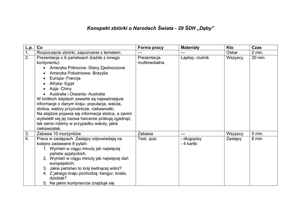 Konspekt zbiórki o Narodach Świata - 29 ŚDH „Dęby” L.p. Co 1. Rozpoczęcie zbiórki, zapoznanie z tematem. 2. Prezentacja o 6 państwach (każde z innego kontynentu)  Ameryka Północna- Stany Zjednoczone  Ameryka Południowa- Brazylia  Europa- Francja  Afryka- Egipt  Azja- Chiny  Australia i Oceania- Australia W krótkich slajdach zawarte są najważniejsze informacje o danym kraju- populacja, waluta, stolica, walory przyrodnicze, ciekawostki. Na slajdzie pojawia się informacja stolica, a zanim wyświetli się jej nazwa harcerze próbują zgadnąć, tak samo robimy w przypadku waluty, jakiś ciekawostek. 3. Zabawa 10 murzynków 4. Praca w zastępach. Zastępy odpowiadają na kolejno zadawane 8 pytań: 1. Wymień w ciągu minuty jak najwięcej państw azjatyckich. 2. Wymień w ciągu minuty jak najwięcej dań europejskich. 3. Jakie państwo to kraj kwitnącej wiśni? 4. Z jakiego kraju pochodzą: kangur, koala, dziobak? 5. Na jakim kontynencie znajduje się Forma pracy --Prezentacja multimedialna Materiały --Laptop, rzutnik Kto Oskar Wszyscy Czas 2 min. 20 min. Zabawa Test, quiz --- długopisy - 4 kartki Wszyscy Zastępy 5 min. 8 min. 5. 6. największa rzeka świata? 6. Na jakim kontynencie znajdują się najwyższe góry świata. 7. Czy Polska leży nad oceanem? 8. W jakim kraju odbędą się Zimowe Igrzyska Olimpijskie w 2018 roku? Po każdym pytaniu czytamy na głos odpowiedzi. Ślimak. W harcówkach rozwieszone są pytania dotyczące narodów świata. Związane są z życiem codziennym ludzi na całym świata, kulturą, zwyczajami, kuchnią. Na środku harcówki stoi stół z planszą, przy której siedzi jedna osoba z zastępu, a reszta szuka pytań. Podsumowanie ślimaka i całej zbiórki. Zakończenie zbiórki. Gra planszowa --- - rozwieszone karteczki z pytaniami - plansza - kostka - prowizoryczne pionki - kartka z pytaniami i odpowiedziami --- Wszyscy Czas do końca zbiórki (ok. 25- 30 min.) Oskar 2 min.