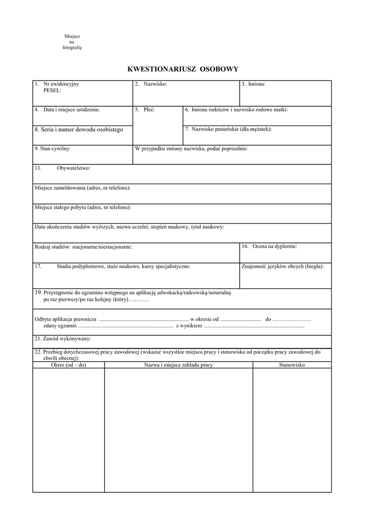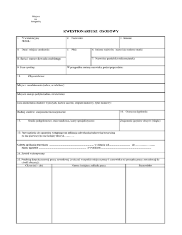 Miejsce na fotografię KWESTIONARIUSZ OSOBOWY 1. Nr ewidencyjny PESEL: 2. Nazwisko: 4. Data i miejsce urodzenia: 5. Płeć: 11. 6. Imiona rodziców i nazwisko rodowe matki: 7. Nazwisko panieńskie (dla mężatek): 8. Seria i numer dowodu osobistego 9. Stan cywilny: 3. Imiona: W przypadku zmiany nazwiska, podać poprzednie: Obywatelstwo: Miejsce zameldowania (adres, nr telefonu): Miejsce stałego pobytu (adres, nr telefonu): Data ukończenia studiów wyższych, nazwa uczelni, stopień naukowy, tytuł naukowy: Rodzaj studiów: stacjonarne/niestacjonarne: 16. Ocena na dyplomie: 17. Znajomość języków obcych (biegła): Studia podyplomowe, staże naukowe, kursy specjalistyczne: 19. Przystąpienie do egzaminu wstępnego na aplikację adwokacką/radcowską/notarialną po raz pierwszy/po raz kolejny (który)…..……. Odbyta aplikacja prawnicza ................................................................. w okresie od .............................. do ………………… zdany egzamin ..................................................................... z wynikiem ......................................................................... 21. Zawód wykonywany: 22. Przebieg dotychczasowej pracy zawodowej (wskazać wszystkie miejsca pracy i stanowiska od początku pracy zawodowej do chwili obecnej): Okres (od – do) Nazwa i miejsce zakładu pracy Stanowisko 23. Dodatkowe zatrudnienie (zajęcie): 24. Karalność (czy był karany, za co, kiedy, na jaką karę i przez jaki sąd): a) sądowa: ....................................................................................................................................................................................... ............................................................................................................................................................................................................. b) dyscyplinarna: ............................................................................................................................................................................ ............................................................................................................................................................................................................. c) czy było prowadzone przeciwko niemu postępowanie karno-sądowe: ...................................................................................... ............................................................................................................................................................................................................. 25. Powszechny obowiązek obrony: a) stosunek do powszechnego obowiązku obrony .......................................................................................................................... b) stopień wojskowy ....................................................................................................................................................................... c) przynależność ewidencyjna do WKU ......................................................................................................................................... d) przydział mobilizacyjny do Sił Zbrojnych RP ............................................................................................................................ Wyrażam zgodę na przetwarzanie oraz przechowywanie moich danych osobowych zawartych w przedstawionym przeze mnie kwestionariuszu dla potrzeb niezbędnych do realizacji procedury rekrutacji zgodnie z ustawą z dnia 29 sierpnia 1997 r. o ochronie danych osobowych (Dz. U. Nr 133 poz. 883 z późn. zm.) .................................................. dnia ................................................. Stwierdzam własnoręcznym podpisem prawdziwość powyższych danych ...............................................................