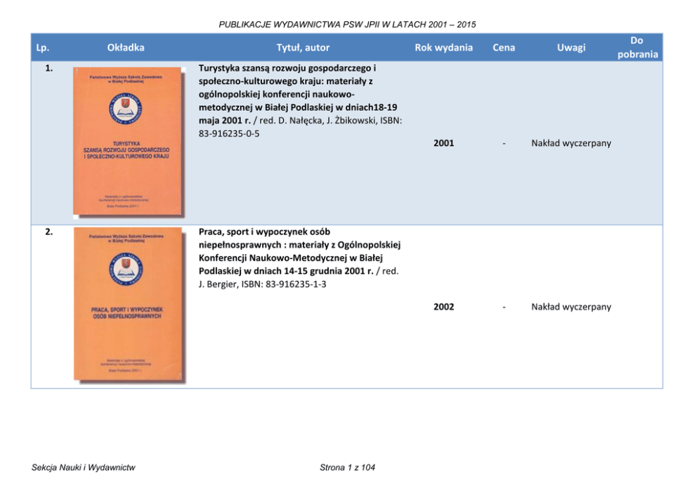 PUBLIKACJE WYDAWNICTWA PSW JPII W LATACH 2001 – 2015 Lp. Okładka 1. 2. Sekcja Nauki i Wydawnictw Tytuł, autor Turystyka szansą rozwoju gospodarczego i społeczno-kulturowego kraju: materiały z ogólnopolskiej konferencji naukowometodycznej w Białej Podlaskiej w dniach18-19 maja 2001 r. / red. D. Nałęcka, J. Żbikowski, ISBN: 83-916235-0-5 Rok wydania Cena Uwagi 2001 - Nakład wyczerpany 2002 - Nakład wyczerpany Praca, sport i wypoczynek osób niepełnosprawnych : materiały z Ogólnopolskiej Konferencji Naukowo-Metodycznej w Białej Podlaskiej w dniach 14-15 grudnia 2001 r. / red. J. Bergier, ISBN: 83-916235-1-3 Strona 1 z 104 Do pobrania PUBLIKACJE WYDAWNICTWA PSW JPII W LATACH 2001 – 2015 Lp. Okładka 3. 4. Sekcja Nauki i Wydawnictw Tytuł, autor Rok wydania Cena Uwagi 2003 - Nakład wyczerpany 2003 40 zł Książka dostępna w sprzedaży Sport powszechny w integracji z niepełnosprawnymi we wspólnej Europie / red. J. Bergier, ISBN: 83-916235-3-X Turystyka a religia / red. J. Bergier, J. Żbikowski, ISBN: 83-916235-2-1 Strona 2 z 104 Do pobrania PUBLIKACJE WYDAWNICTWA PSW JPII W LATACH 2001 – 2015 Lp. Okładka 5. 6. Sekcja Nauki i Wydawnictw Tytuł, autor Rok wydania Cena Uwagi 2004 30 zł Książka dostępna w sprzedaży 2004 25 zł Książka dostępna w sprzedaży Rozwój obszarów przygranicznych w kontekście funkcjonowania Euroregionów / red. M. Adamowicz, J. Bergier, ISBN: 83-916235-5-6 Zapotrzebowania a oferta edukacyjna w lokalnej polityce oświatowej / red. J. Marchel, M. Nowak, ISBN: 83-916235-4-8 Strona 3 z 104 Do pobrania PUBLIKACJE WYDAWNICTWA PSW JPII W LATACH 2001 – 2015 Lp. Okładka 7. 8. Sekcja Nauki i Wydawnictw Tytuł, autor Rok wydania Cena Uwagi 2004 - Nakład wyczerpany 2005 - Nakład wyczerpany Rachunek globalny a przyszłość informatyki / red. J.M. Olchowik, ISBN: 83-916235-6-4 Pedagogiczna inspiracja w nauczaniu Jana Pawła II / red. M. Nowak, C. Kalita, ISBN: 83-916235-7-2 Strona 4 z 104 Do pobrania PUBLIKACJE WYDAWNICTWA PSW JPII W LATACH 2001 – 2015 Lp. Okładka 9. 10. Sekcja Nauki i Wydawnictw Tytuł, autor Rok wydania Cena Uwagi 2005 - Nakład wyczerpany 2005 - Nakład wyczerpany Rekreacja ruchowa w teorii i praktyce / red. Z. Kubińska, B. Bergier, ISBN: 83-923366-0-7 Wybrane zagadnienia z turystyki wiejskiej / red. J. Bergier, B. Sawicki, ISBN: 83-916235-9-9 Strona 5 z 104 Do pobrania PUBLIKACJE WYDAWNICTWA PSW JPII W LATACH 2001 – 2015 Lp. Okładka 11. 12. Sekcja Nauki i Wydawnictw Tytuł, autor Rok wydania Cena Uwagi 2005 - Nakład wyczerpany 2005 20 zł – op. miękka; 25 zł – op. twarda Książka dostępna w sprzedaży Uwarunkowania rozwoju turystyki związanej z obszarami wiejskimi / red. nauk. B. Sawicki, J. Bergier, ISBN: 83-916235-8-0 Krajoznawstwo i turystyka osób niepełnosprawnych / red. F. Midura, J. Żbikowski, ISBN: 83-923366-1-5 Strona 6 z 104 Do pobrania PUBLIKACJE WYDAWNICTWA PSW JPII W LATACH 2001 – 2015 Lp. Okładka 13. 14. Sekcja Nauki i Wydawnictw Tytuł, autor Rok wydania Cena Uwagi 2006 35 zł Książka dostępna w sprzedaży 2006 35 zł Książka dostępna w sprzedaży Kultura i rekreacja ruchowa w integracji osób niepełnosprawnych / red. J. Bergier, Z. Kubińska, ISBN: 83-923366-5-8 Teoria i praktyka rekreacji ruchowej / red. D. Nałęcka, M. Bytniewski, ISBN: 83-923366-6-6 Strona 7 z 104 Do pobrania PUBLIKACJE WYDAWNICTWA PSW JPII W LATACH 2001 – 2015 Lp. Okładka 15. 16. Sekcja Nauki i Wydawnictw Tytuł, autor Rok wydania Cena Uwagi 2006 20 zł Książka dostępna w sprzedaży 2006 30 zł Książka dostępna w sprzedaży Piłka nożna kobiet / red. J. Bergier, ISBN: 83923366-3-1 Rola samorządu w zarządzaniu rozwojem lokalnym i regionalnym / red. M. Adamowicz, ISBN: 83-923366-4-X Strona 8 z 104 Do pobrania PUBLIKACJE WYDAWNICTWA PSW JPII W LATACH 2001 – 2015 Lp. Okładka 17. Tytuł, autor Rok wydania - Książka niedostępna w sprzedaży - Książka niedostępna w sprzedaży Praca, etos, wychowanie / red. nauk. E. Konovaluk, M. Nowak, ISBN: 978-83-923366-9-3 2007 Sekcja Nauki i Wydawnictw Uwagi Bibliografia : publikacje Państwowej Wyższej Szkoły Zawodowej im. Papieża Jana Pawła II w Białej Podlaskiej 2001-2005 / opracowanie: Marzena Dziołak 2006 18. Cena Strona 9 z 104 Do pobrania PUBLIKACJE WYDAWNICTWA PSW JPII W LATACH 2001 – 2015 Lp. Okładka 19. 20. Tytuł, autor Rok wydania Cena Uwagi 2007 20 zł Książka dostępna w sprzedaży - Książka niedostępna w sprzedaży Studenci pogranicza polsko-białoruskiego wobec problemów współczesności / D. Tomczyszyn, W. Romanowicz, ISBN 978-83-923366-8-6 Szlakiem dawnych kultur i religii / Uniwersytet Trzeciego Wieku 2007 Sekcja Nauki i Wydawnictw Strona 10 z 104 Do pobrania PUBLIKACJE WYDAWNICTWA PSW JPII W LATACH 2001 – 2015 Lp. Okładka 21. Tytuł, autor Rok wydania 15 zł Czasopismo dostępne w sprzedaży - Książka niedostępna w sprzedaży Rozwój transgranicznej współpracy gospodarczej w regionie Biała Podlaska - Brześć, T. 1 / red. M. Adamowicz, A. Siedlecka, ISBN: 978-83-61044-048 2007 Sekcja Nauki i Wydawnictw Uwagi Rozprawy Naukowe Tom I / red. nacz. M. Nowak, ISSN 1899-1025 2007 22. Cena Strona 11 z 104 Do pobrania PUBLIKACJE WYDAWNICTWA PSW JPII W LATACH 2001 – 2015 Lp. Okładka 23. 24. Sekcja Nauki i Wydawnictw Tytuł, autor Rok wydania Cena Uwagi 2007 - Książka niedostępna w sprzedaży 2007 20 zł Książka dostępna w sprzedaży Rozwój transgranicznej współpracy edukacyjnej w regionie Biała Podlaska - Brześć, T. 2 / red. M. Adamowicz, A. Siedlecka, ISBN: 978-83-61044-086 Kierunki rozwoju turystyki w województwie lubelskim / red. J. Bergier, M. Stelmach, ISBN: 978-83-61044-24-6 Strona 12 z 104 Do pobrania PUBLIKACJE WYDAWNICTWA PSW JPII W LATACH 2001 – 2015 Lp. Okładka 25. 26. Tytuł, autor Rok wydania Cena Uwagi 2007 20 zł Książka dostępna w sprzedaży - Książka niedostępna w sprzedaży Przetwarzanie informacji w społeczeństwie informacyjnym / red. T. Grudniewski, J.M. Olchowik, ISBN: 978