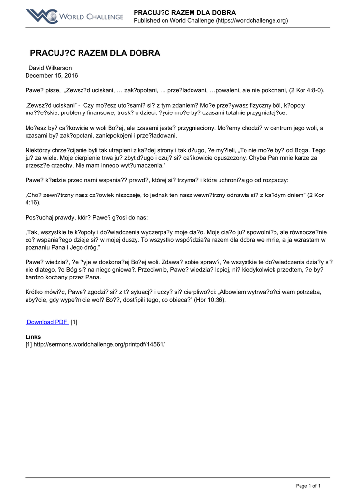 PRACUJ?C RAZEM DLA DOBRA Published on World Challenge (https://worldchallenge.org) PRACUJ?C RAZEM DLA DOBRA David Wilkerson December 15, 2016 Pawe? pisze, „Zewsz?d uciskani, … zak?opotani, … prze?ladowani, …powaleni, ale nie pokonani, (2 Kor 4:8-0). „Zewsz?d uciskani” - Czy mo?esz uto?sami? si? z tym zdaniem? Mo?e prze?ywasz fizyczny ból, k?opoty ma??e?skie, problemy finansowe, trosk? o dzieci. ?ycie mo?e by? czasami totalnie przygniataj?ce. Mo?esz by? ca?kowicie w woli Bo?ej, ale czasami jeste? przygnieciony. Mo?emy chodzi? w centrum jego woli, a czasami by? zak?opotani, zaniepokojeni i prze?ladowani. Niektórzy chrze?cijanie byli tak utrapieni z ka?dej strony i tak d?ugo, ?e my?leli, „To nie mo?e by? od Boga. Tego ju? za wiele. Moje cierpienie trwa ju? zbyt d?ugo i czuj? si? ca?kowicie opuszczony. Chyba Pan mnie karze za przesz?e grzechy. Nie mam innego wyt?umaczenia.” Pawe? k?adzie przed nami wspania?? prawd?, której si? trzyma? i która uchroni?a go od rozpaczy: „Cho? zewn?trzny nasz cz?owiek niszczeje, to jednak ten nasz wewn?trzny odnawia si? z ka?dym dniem” (2 Kor 4:16). Pos?uchaj prawdy, któr? Pawe? g?osi do nas: „Tak, wszystkie te k?opoty i do?wiadczenia wyczerpa?y moje cia?o. Moje cia?o ju? spowolni?o, ale równocze?nie co? wspania?ego dzieje si? w mojej duszy. To wszystko wspó?dzia?a razem dla dobra we mnie, a ja wzrastam w poznaniu Pana i Jego dróg.” Pawe? wiedzia?, ?e ?yje w doskona?ej Bo?ej woli. Zdawa? sobie spraw?, ?e wszystkie te do?wiadczenia dzia?y si? nie dlatego, ?e Bóg si? na niego gniewa?. Przeciwnie, Pawe? wiedzia? lepiej, ni? kiedykolwiek przedtem, ?e by? bardzo kochany przez Pana. Krótko mówi?c, Pawe? zgodzi? si? z t? sytuacj? i uczy? si? cierpliwo?ci: „Albowiem wytrwa?o?ci wam potrzeba, aby?cie, gdy wype?nicie wol? Bo??, dost?pili tego, co obieca?” (Hbr 10:36). Download PDF [1] Links [1] http://sermons.worldchallenge.org/printpdf/14561/ Page 1 of 1