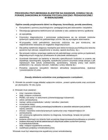 PROCEDURA PRZYJMOWANIA KLIENTÓW NA DIAGNOZĘ, KONSULTACJĘ, PORADĘ ZAWODOWĄ W PORADNI PSYCHOLOGICZNO- PEDAGOGICZNEJ W WIERUSZOWIE Ogólne zasady przyjmowania dzieci na diagnozę, konsultację, poradę zawodową. Korzystanie z pomocy psychologiczno- pedagogicznej jest dobrowolne i bezpłatne. Obowiązują zgłoszenia telefoniczne lub osobiste w celu ustalenia terminu spotkania ze specjalistą. Czynności diagnostyczne i pomocowe podejmowane są na wniosek rodziców (prawnych opiekunów) lub pełnoletniego ucznia. Nie są wymagane skierowania. W przypadku osób pełnoletnich obecność rodziców nie jest konieczna, ale niejednokrotnie wskazana ze względów diagnostycznych. Dla pełnej rzetelności diagnozy niezbędna jest dobra kondycja psychofizyczna dziecka (powinno być zdrowe, zaopatrzone w okulary, aparat słuchowy, itp.). Na wniosek rodzica, prawnego opiekuna lub pełnoletniego ucznia opinie po badaniach diagnostycznych mogą być przekazane do placówek oświatowych. Uczniowie kierowani na badania w kierunku specyficznych trudności w uczeniu się (dysleksja, dysortografia, dysgrafia, dyskalkulia) powinni przynieść swoje zeszyty z jak najniższych klas szkoły podstawowej, sprawdziany, dowody pracy nad swoim problemem ( np. zeszyty ćwiczeń, materiały z pracy własnej itp.) Poradnia zapewnia wszystkim klientom atmosferę bezpieczeństwa, dyskrecji i poszanowania ich praw. Zasady składania wniosków oraz postępowania z wnioskami. 1. Wnioski do poradni mogą składać wyłącznie rodzice , prawni opiekunowie oraz uczniowie po ukończeniu 18 roku życia. 2. Wniosek musi zawierać: imię i nazwisko dziecka; datę i miejsce urodzenia; PESEL lub serię i nr dokumentu potwierdzającego tożsamość; adres zamieszkania; nazwę i adres przedszkola / szkoły / ośrodka / placówki; oznaczenie klasy; w przypadku ucznia szkoły prowadzącej kształcenie w zawodzie wskazane jest podanie nazwy zawodu; imiona i nazwiska rodziców/prawnych opiekunów oraz miejsce/miejsca ich zamieszkania; cel i przyczynę zgłoszenia dziecka na diagnozę, konsultację, terapię lub poradę zawodową; podanie informacji czy dziecko było wcześniej diagnozowane/konsultowane w poradni; podanie informacji na temat zastosowanych dotychczas wobec ucznia form pomocy w przedszkolu/szkole; datę i miejsce wypełnienia wniosku; czytelny(e) podpis(y) wnioskodawcy(ów). Wniosek musi być własnoręcznie wypełniony przez wnioskodawcę. 3. Druk wniosku dostępny jest w sekretariacie poradni lub na stronie internetowej poradni – www.ppp.powiat-wieruszowski.pl. 4. Wnioskodawca dołącza do wniosku dokumentację uzasadniającą wniosek (o ile taka istnieje), w szczególności wydane przez specjalistów opinie, zaświadczenia oraz wyniki obserwacji i badań psychologicznych, pedagogicznych, logopedycznych i lekarskich. 5. Jeżeli do wydania orzeczenia albo opinii jest niezbędna informacja o stanie zdrowia dziecka, wnioskodawca dołącza do wniosku wydane przez lekarza zaświadczenie o stanie zdrowia dziecka. 6. Jeżeli wniosek dotyczy wydania orzeczenia o potrzebie indywidualnego przygotowania przedszkolnego albo orzeczenia o potrzebie indywidualnego nauczania, wnioskodawca dołącza do wniosku zaświadczenie o stanie zdrowia dziecka, w którym lekarz określa: a) okres - nie krótszy jednak niż 30 dni - w którym stan zdrowia dziecka uniemożliwia lub znacznie utrudnia uczęszczanie do przedszkola lub szkoły; b) rozpoznanie choroby lub innej przyczyny powodującej, że stan zdrowia dziecka uniemożliwia lub znacznie utrudnia uczęszczanie do przedszkola lub szkoły; c) zakres, w jakim dziecko, któremu stan zdrowia znacznie utrudnia uczęszczanie do przedszkola, może brać udział w zajęciach, w których realizowana jest podstawa programowa wychowania przedszkolnego, organizowanych z grupą wychowawczą lub indywidualnie w odrębnym pomieszczeniu w przedszkolu; d) zakres, w jakim uczeń, któremu stan zdrowia znacznie utrudnia uczęszczanie do szkoły, może brać udział w obowiązkowych zajęciach edukacyjnych, organizowanych z oddziałem w szkole lub indywidualnie w odrębnym pomieszczeniu w szkole. 7. Druk zaświadczenia lekarskiego dostępny jest w sekretariacie poradni lub na stronie internetowej poradni – www.ppp.powiat-wieruszowski.pl. 8. Wnioski są przyjmowane codziennie w godzinach pracy sekretariatu poradni, to jest od godziny 7.30- 15.30 przez referenta administracyjnego. 9. Wnioski można składać osobiście lub przesłać pocztą. 10. Kolejność badań diagnostycznych ustala dyrektor poradni, kierując się następującymi zasadami: a) w pierwszej kolejności na badania będą przyjmowane dzieci znajdujące się w sytuacjach kryzysowych (przemoc, zachowania aspołeczne, agresywne, depresyjne, lękowe itp.) oraz dzieci, które po raz pierwszy będą diagnozowane w poradni; b) w drugiej kolejności badaniami będą objęte dzieci, których rodzice/prawni opiekunowie złożyli wnioski o wydanie orzeczeń do kształcenia specjalnego, zajęć rewalidacyjno-wychowawczych, nauczania indywidualnego, indywidualnego przygotowania przedszkolnego, wczesnego wspomagania rozwoju dziecka; c) w dalszej kolejności będą diagnozowane dzieci o specjalnych potrzebach edukacyjnych, tj. z zaburzeniami i odchyleniami rozwojowymi lub ze specyficznymi trudnościami w uczeniu się. d) pozostałe dzieci będą diagnozowane w kolejności składania wniosków; e) z zastrzeżeniem wyrażonym w punkcie f), dzieci zgłaszane na badania kontrolne nie będą diagnozowane przed upływem dwóch lat od daty wystawienia ostatniej opinii psychologiczno-pedagogicznej; f) warunkiem przyjęcia na badania kontrolne przed upływem dwóch lat od ostatniej diagnozy jest przedstawienie przez rodzica/ prawnego opiekuna dowodów realizacji zaleceń postdiagnostycznych: materiałów z pracy korekcyjno-kompensacyjnej, dydaktyczno-wyrównawczej, np. zeszytów ćwiczeń, opinii nauczycieli prowadzących dodatkowe zajęcia w szkole, materiałów