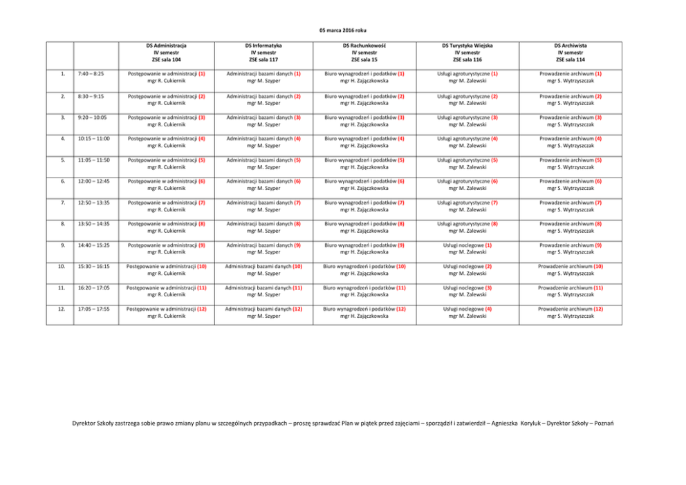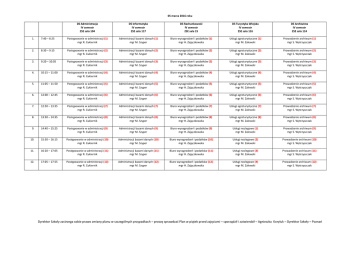 05 marca 2016 roku DS Administracja IV semestr ZSE sala 104 DS Informatyka IV semestr ZSE sala 117 DS Rachunkowość IV semestr ZSE sala 15 DS Turystyka Wiejska IV semestr ZSE sala 116 DS Archiwista IV semestr ZSE sala 114 1. 7:40 – 8:25 Postępowanie w administracji (1) mgr R. Cukiernik Administracji bazami danych (1) mgr M. Szyper Biuro wynagrodzeń i podatków (1) mgr H. Zajączkowska Usługi agroturystyczne (1) mgr M. Zalewski Prowadzenie archiwum (1) mgr S. Wytrzyszczak 2. 8:30 – 9:15 Postępowanie w administracji (2) mgr R. Cukiernik Administracji bazami danych (2) mgr M. Szyper Biuro wynagrodzeń i podatków (2) mgr H. Zajączkowska Usługi agroturystyczne (2) mgr M. Zalewski Prowadzenie archiwum (2) mgr S. Wytrzyszczak 3. 9:20 – 10:05 Postępowanie w administracji (3) mgr R. Cukiernik Administracji bazami danych (3) mgr M. Szyper Biuro wynagrodzeń i podatków (3) mgr H. Zajączkowska Usługi agroturystyczne (3) mgr M. Zalewski Prowadzenie archiwum (3) mgr S. Wytrzyszczak 4. 10:15 – 11:00 Postępowanie w administracji (4) mgr R. Cukiernik Administracji bazami danych (4) mgr M. Szyper Biuro wynagrodzeń i podatków (4) mgr H. Zajączkowska Usługi agroturystyczne (4) mgr M. Zalewski Prowadzenie archiwum (4) mgr S. Wytrzyszczak 5. 11:05 – 11:50 Postępowanie w administracji (5) mgr R. Cukiernik Administracji bazami danych (5) mgr M. Szyper Biuro wynagrodzeń i podatków (5) mgr H. Zajączkowska Usługi agroturystyczne (5) mgr M. Zalewski Prowadzenie archiwum (5) mgr S. Wytrzyszczak 6. 12:00 – 12:45 Postępowanie w administracji (6) mgr R. Cukiernik Administracji bazami danych (6) mgr M. Szyper Biuro wynagrodzeń i podatków (6) mgr H. Zajączkowska Usługi agroturystyczne (6) mgr M. Zalewski Prowadzenie archiwum (6) mgr S. Wytrzyszczak 7. 12:50 – 13:35 Postępowanie w administracji (7) mgr R. Cukiernik Administracji bazami danych (7) mgr M. Szyper Biuro wynagrodzeń i podatków (7) mgr H. Zajączkowska Usługi agroturystyczne (7) mgr M. Zalewski Prowadzenie archiwum (7) mgr S. Wytrzyszczak 8. 13:50 – 14:35 Postępowanie w administracji (8) mgr R. Cukiernik Administracji bazami danych (8) mgr M. Szyper Biuro wynagrodzeń i podatków (8) mgr H. Zajączkowska Usługi agroturystyczne (8) mgr M. Zalewski Prowadzenie archiwum (8) mgr S. Wytrzyszczak 9. 14:40 – 15:25 Postępowanie w administracji (9) mgr R. Cukiernik Administracji bazami danych (9) mgr M. Szyper Biuro wynagrodzeń i podatków (9) mgr H. Zajączkowska Usługi noclegowe (1) mgr M. Zalewski Prowadzenie archiwum (9) mgr S. Wytrzyszczak 10. 15:30 – 16:15 Postępowanie w administracji (10) mgr R. Cukiernik Administracji bazami danych (10) mgr M. Szyper Biuro wynagrodzeń i podatków (10) mgr H. Zajączkowska Usługi noclegowe (2) mgr M. Zalewski Prowadzenie archiwum (10) mgr S. Wytrzyszczak 11. 16:20 – 17:05 Postępowanie w administracji (11) mgr R. Cukiernik Administracji bazami danych (11) mgr M. Szyper Biuro wynagrodzeń i podatków (11) mgr H. Zajączkowska Usługi noclegowe (3) mgr M. Zalewski Prowadzenie archiwum (11) mgr S. Wytrzyszczak 12. 17:05 – 17:55 Postępowanie w administracji (12) mgr R. Cukiernik Administracji bazami danych (12) mgr M. Szyper Biuro wynagrodzeń i podatków (12) mgr H. Zajączkowska Usługi noclegowe (4) mgr M. Zalewski Prowadzenie archiwum (12) mgr S. Wytrzyszczak Dyrektor Szkoły zastrzega sobie prawo zmiany planu w szczególnych przypadkach – proszę sprawdzać Plan w piątek przed zajęciami – sporządził i zatwierdził – Agnieszka Koryluk – Dyrektor Szkoły – Poznań 06 marca 2016 roku DS Administracja IV semestr ZSE sala 015 DS Informatyka IV semestr ZSE sala 117 DS Rachunkowość IV semestr ZSE sala 116 DS Turystyka Wiejska IV semestr ZSE sala 104 1. 7:40 – 8:25 Wykonywanie pracy biurowej (1) mgr M. Stachowiak Programowanie ap internet (1) mgr P. Głowacz Prowadzenie produkcji rolniczej (1) mgr A. Kubczak 2. 8:30 – 9:15 Wykonywanie pracy biurowej (2) mgr M. Stachowiak Programowanie ap internet (2) mgr P. Głowacz Prowadzenie produkcji rolniczej (2) mgr A. Kubczak 3. 9:20 – 10:05 Wykonywanie pracy biurowej (3) mgr M. Stachowiak Programowanie ap internet (3) mgr P. Głowacz Wynagrodzenia i podatki (1) mgr B. Tomczak Prowadzenie produkcji rolniczej (3) mgr A. Kubczak 4. 10:15 – 11:00 Wykonywanie pracy biurowej (4) mgr M. Stachowiak Programowanie ap internet (4) mgr P. Głowacz Wynagrodzenia i podatki (2) mgr B. Tomczak Prowadzenie produkcji rolniczej (4) mgr A. Kubczak 5. 11:05 – 11:50 Wykonywanie pracy biurowej (5) mgr M. Stachowiak Programowanie ap internet (5) mgr P. Głowacz Wynagrodzenia i podatki (3) mgr B. Tomczak Prowadzenie produkcji rolniczej (5) mgr A. Kubczak 6. 12:00 – 12:45 Wykonywanie pracy biurowej (6) mgr M. Stachowiak Programowanie ap internet (6) mgr P. Głowacz Wynagrodzenia i podatki (4) mgr B. Tomczak Prowadzenie produkcji rolniczej (6) mgr A. Kubczak 7. 12:50 – 13:35 Programowanie ap internet (7) mgr P. Głowacz Wynagrodzenia i podatki (5) mgr B. Tomczak Prowadzenie produkcji rolniczej (7) mgr A. Kubczak 8. 13:50 – 14:35 Programowanie ap internet (8) mgr P. Głowacz Wynagrodzenia i podatki (6) mgr B. Tomczak Prowadzenie produkcji rolniczej (8) mgr A. Kubczak 9. 14:40 – 15:25 Programowanie ap internet (9) mgr P. Głowacz Wynagrodzenia i podatki (7) mgr B. Tomczak 10. 15:30 – 16:15 Programowanie ap internet (10) mgr P. Głowacz Wynagrodzenia i podatki (8) mgr B. Tomczak 11. 16:20 – 17:05 Programowanie ap internet (11) mgr P. Głowacz 12. 17:05 – 17:55 Programowanie ap internet (12) mgr P. Głowacz DS Archiwista IV semestr ZSE sala Dyrektor Szkoły zastrzega sobie prawo zmiany planu w szczególnych przypadkach – proszę sprawdzać Plan w piątek przed zajęciami – sporządził i zatwierdził – Agnieszka Koryluk – Dyrektor Szkoły – Poznań 12 marca 2016 roku DS Administracja IV semestr ZSE sala 104 DS Informatyka IV semestr ZSE sala 117 DS Rachunkowość IV semestr ZSE sala DS Turystyka Wiejska IV semestr