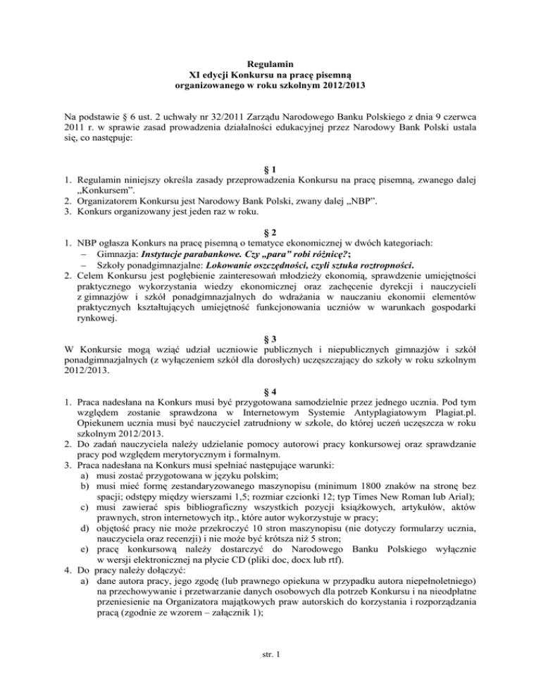 Regulamin XI edycji Konkursu na pracę pisemną organizowanego w roku szkolnym 2012/2013 Na podstawie § 6 ust. 2 uchwały nr 32/2011 Zarządu Narodowego Banku Polskiego z dnia 9 czerwca 2011 r. w sprawie zasad prowadzenia działalności edukacyjnej przez Narodowy Bank Polski ustala się, co następuje: §1 1. Regulamin niniejszy określa zasady przeprowadzenia Konkursu na pracę pisemną, zwanego dalej „Konkursem”. 2. Organizatorem Konkursu jest Narodowy Bank Polski, zwany dalej „NBP”. 3. Konkurs organizowany jest jeden raz w roku. §2 1. NBP ogłasza Konkurs na pracę pisemną o tematyce ekonomicznej w dwóch kategoriach: Gimnazja: Instytucje parabankowe. Czy „para” robi różnicę?; Szkoły ponadgimnazjalne: Lokowanie oszczędności, czyli sztuka roztropności. 2. Celem Konkursu jest pogłębienie zainteresowań młodzieży ekonomią, sprawdzenie umiejętności praktycznego wykorzystania wiedzy ekonomicznej oraz zachęcenie dyrekcji i nauczycieli z gimnazjów i szkół ponadgimnazjalnych do wdrażania w nauczaniu ekonomii elementów praktycznych kształtujących umiejętność funkcjonowania uczniów w warunkach gospodarki rynkowej. §3 W Konkursie mogą wziąć udział uczniowie publicznych i niepublicznych gimnazjów i szkół ponadgimnazjalnych (z wyłączeniem szkół dla dorosłych) uczęszczający do szkoły w roku szkolnym 2012/2013. §4 1. Praca nadesłana na Konkurs musi być przygotowana samodzielnie przez jednego ucznia. Pod tym względem zostanie sprawdzona w Internetowym Systemie Antyplagiatowym Plagiat.pl. Opiekunem ucznia musi być nauczyciel zatrudniony w szkole, do której uczeń uczęszcza w roku szkolnym 2012/2013. 2. Do zadań nauczyciela należy udzielanie pomocy autorowi pracy konkursowej oraz sprawdzanie pracy pod względem merytorycznym i formalnym. 3. Praca nadesłana na Konkurs musi spełniać następujące warunki: a) musi zostać przygotowana w języku polskim; b) musi mieć formę zestandaryzowanego maszynopisu (minimum 1800 znaków na stronę bez spacji; odstępy między wierszami 1,5; rozmiar czcionki 12; typ Times New Roman lub Arial); c) musi zawierać spis bibliograficzny wszystkich pozycji książkowych, artykułów, aktów prawnych, stron internetowych itp., które autor wykorzystuje w pracy; d) objętość pracy nie może przekroczyć 10 stron maszynopisu (nie dotyczy formularzy ucznia, nauczyciela oraz recenzji) i nie może być krótsza niż 5 stron; e) pracę konkursową należy dostarczyć do Narodowego Banku Polskiego wyłącznie w wersji elektronicznej na płycie CD (pliki doc, docx lub rtf). 4. Do pracy należy dołączyć: a) dane autora pracy, jego zgodę (lub prawnego opiekuna w przypadku autora niepełnoletniego) na przechowywanie i przetwarzanie danych osobowych dla potrzeb Konkursu i na nieodpłatne przeniesienie na Organizatora majątkowych praw autorskich do korzystania i rozporządzania pracą (zgodnie ze wzorem – załącznik 1); str. 1 b) dane nauczyciela opiekuna ucznia, jego zgodę na przechowywanie i przetwarzanie danych osobowych dla potrzeb Konkursu oraz nie krótszą niż pół strony napisaną przez nauczyciela recenzję pracy konkursowej (zgodnie ze wzorem – załącznik 2). 5. Prace, które nie spełnią wymogów formalnych określonych niniejszym regulaminem i takie, które uzyskają pozytywny wynik plagiatowy zostaną odrzucone na etapie weryfikacji formalnej dokonywanej przez pracownika Departamentu Edukacji i Wydawnictw. §5 1. Kapituła Konkursu, zwana dalej „Kapitułą” dokonuje wyboru najlepszych prac w kategoriach określonych w § 2 ust. 1. Jej członków, zgodnie z § 6 ust. 3 uchwały nr 32/2011 Zarządu Narodowego Banku Polskiego, powołuje Prezes NBP. 2. Kapituła pracuje zgodnie z Regulaminem prac Kapituły powołanej na potrzeby XI edycji Konkursu na pracę pisemną organizowanego w roku szkolnym 2012/2013 zatwierdzonym przez Dyrektora Departamentu Edukacji i Wydawnictw. 3. Kapituła, oceniając prace, zwraca uwagę na umiejętność praktycznego wykorzystania posiadanej przez autora wiedzy ekonomicznej i rozumienie podstawowych zagadnień mikro i makroekonomii. W szczególności Kapituła bierze pod uwagę następujące kryteria: a) zgodność z tematyką konkursu, b) zawartość merytoryczną pracy, c) pomysłowość autora, d) styl i język pracy. 4. Kapituła otrzymuje do oceny prace zakodowane. 5. Decyzje Kapituły są wiążące, ostateczne i nie podlegają zmianom. §6 1. Autorom najlepszych prac Kapituła przyznaje nagrody w dwóch kategoriach określonych w § 2 ust. 1: a) za zajęcie pierwszego miejsca: nagrodę pieniężną w wysokości 3700 zł brutto; b) za zajęcie drugiego miejsca: nagrodę pieniężną w wysokości 3200 zł brutto; c) za zajęcie trzeciego miejsca: nagrodę pieniężną w wysokości 2700 zł brutto; d) trzy wyróżnienia: nagrodę pieniężną w wysokości po 1100 zł brutto. 2. Co najmniej 80% kwoty nagrody pieniężnej określonej w ust. 1 musi zostać przeznaczone na zakup sprzętu komputerowego (dopuszcza się zakup monitora, drukarki, skanera, oprogramowania i innego niezbędnego wyposażenia komputera) lub sprzętu RTV (m.in. odtwarzacz MP3/MP4, głośniki, dyktafon) oraz opłat za uczestnictwo w kursach językowych. Dokonanie zakupu innych pomocy i narzędzi edukacyjnych możliwe jest tylko za zgodą NBP wyrażoną na piśmie. 3. Na potwierdzenie dokonania takiego zakupu opiekun prawny laureata Konkursu lub sam laureat Konkursu, jeżeli ukończył 18 lat, złoży pisemne oświadczenie stanowiące załącznik 3 do regulaminu oraz niezwłocznie przedstawi NBP kserokopie faktur. 4. Zgodnie z art. 30 ust. 1 pkt 2 ustawy z dnia 26 lipca 1991 r. o podatku dochodowym od osób fizycznych (t.j. Dz. U. z 2012, poz. 361 ze zm.), od kwot określonych w ust. 1 zostanie pobrany zryczałtowany podatek w wysokości 10%, który zostanie przekazany na rachunek odpowiedniego urzędu skarbowego. 5. Kapituła przyznaje świadczenia pieniężne nauczycielom opiekunom mery