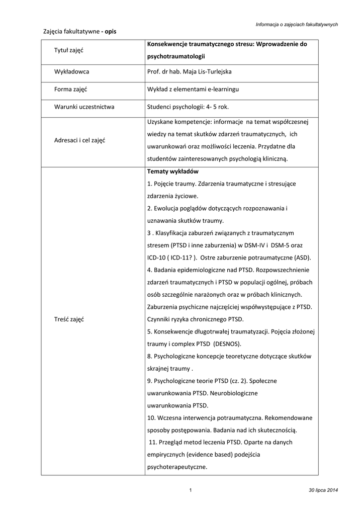 Informacja o zajęciach fakultatywnych Zajęcia fakultatywne - opis Tytuł zajęć Konsekwencje traumatycznego stresu: Wprowadzenie do psychotraumatologii Wykładowca Prof. dr hab. Maja Lis-Turlejska Forma zajęć Wykład z elementami e-learningu Warunki uczestnictwa Studenci psychologii: 4- 5 rok. Uzyskane kompetencje: informacje na temat współczesnej Adresaci i cel zajęć wiedzy na temat skutków zdarzeń traumatycznych, ich uwarunkowań oraz możliwości leczenia. Przydatne dla studentów zainteresowanych psychologią kliniczną. Tematy wykładów 1. Pojęcie traumy. Zdarzenia traumatyczne i stresujące zdarzenia życiowe. 2. Ewolucja poglądów dotyczących rozpoznawania i uznawania skutków traumy. 3 . Klasyfikacja zaburzeń związanych z traumatycznym stresem (PTSD i inne zaburzenia) w DSM-IV i DSM-5 oraz ICD-10 ( ICD-11? ). Ostre zaburzenie potraumatyczne (ASD). 4. Badania epidemiologiczne nad PTSD. Rozpowszechnienie zdarzeń traumatycznych i PTSD w populacji ogólnej, próbach osób szczególnie narażonych oraz w próbach klinicznych. Zaburzenia psychiczne najczęściej współwystępujące z PTSD. Treść zajęć Czynniki ryzyka chronicznego PTSD. 5. Konsekwencje długotrwałej traumatyzacji. Pojęcia złożonej traumy i complex PTSD (DESNOS). 8. Psychologiczne koncepcje teoretyczne dotyczące skutków skrajnej traumy . 9. Psychologiczne teorie PTSD (cz. 2). Społeczne uwarunkowania PTSD. Neurobiologiczne uwarunkowania PTSD. 10. Wczesna interwencja potraumatyczna. Rekomendowane sposoby postępowania. Badania nad ich skutecznością. 11. Przegląd metod leczenia PTSD. Oparte na danych empirycznych (evidence based) podejścia psychoterapeutyczne. 1 30 lipca 2014 Informacja o zajęciach fakultatywnych 12. Metody leczenia PTSD (cz. 2 ). Nowe obszary badawcze: Ryzyko i podatność. Rezyliencja (resilience) i potraumatyczny rozwój (posttraumatic growth). 1. Herman, J. L. (1998). Przemoc: uraz psychiczny i powrót do równowagi. Gdańsk. GWP. 2. Foa, E. B., Hambree, E. A., Rothabaum Olasov, B. (2013). Odzyskaj życie po traumie. Przedłużona ekspozycja w terapii PTSD. Poradnik pacjenta. Gdańskie Wydawnictwo Psychologiczne. Literatura 3. Lis-Turlejska, M. (2005). Traumatyczne zdarzenia i ich skutki psychiczne. Warszawa: Wydawnictwo Instytutu Psychologii PAN. 4. Lis-Turlejska (2012). Zdarzenia traumatyczne związane z przemocą – konsekwencje psychiczne. W: H. Grzegołowska-Klarkowska (red.). Agresja, socjalizacja, edukacja: Refleksje i inspiracje.(s. 45-57). Warszawa: Wydawnictwo Akademii Pedagogiki Specjalnej. Forma zaliczenia i kryteria oceny Standardowy test wielokrotnego wyboru obejmujący podstawowe treści wykładu. Prof. Maja Lis-Turlejska jest profesorem w SWPS . Współautorka i redaktorka książek: Nowe kierunki w psychoterapii (1979), Nowe zjawiska w psychoterapii (1991). Autorka książek: Traumatyczny stres: Koncepcje i badania (1998); Stres traumatyczny: Występowanie, następstwa, terapia (2002) i Traumatyczne zdarzenia i ich skutki psychiczne Biogram (2005). Problematyką traumatycznego stresu zajmuje się od ponad 20 lat, Jej badania w tym obszarze dotyczyły m. in. radzenia sobie ze skutkami skrajnej traumy przez byłych więźniów hitlerowskich obozów koncentracyjnych oraz rozpowszechnienia zdarzeń traumatycznych i objawów PTSD wśród studentów. Jest V-ce Przewodniczącą Polskiego Towarzystwa Badań nad Stresem Traumatycznym. W latach 20072013 była członkiem Zarządu Europejskiego 2 30 lipca 2014 Informacja o zajęciach fakultatywnych Towarzystwa Badań nad Stresem Traumatycznym ( ESTSS). 3 30 lipca 2014