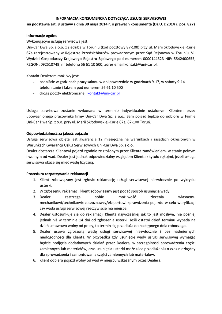 INFORMACJA KONSUMENCKA DOTYCZĄCA USŁUGI SERWISOWEJ na podstawie art. 8 ustawy z dnia 30 maja 2014 r. o prawach konsumenta (Dz.U. z 2014 r. poz. 827) Informacje ogólne Wykonującym usługę serwisową jest: Uni-Car Dwa Sp. z o.o. z siedzibą w Toruniu (kod pocztowy 87-100) przy ul. Marii Skłodowskiej-Curie 67a zarejestrowany w Rejestrze Przedsiębiorców prowadzonym przez Sąd Rejonowy w Toruniu, VII Wydział Gospodarczy Krajowego Rejestru Sądowego pod numerem 0000144523 NIP: 5542400655, REGON: 092510749, nr telefonu 56 61 10 500, adres email [email protected]. Kontakt Dealerem możliwy jest: - osobiście w godzinach pracy salonu w dni powszednie w godzinach 9-17, w soboty 9-14 - telefonicznie i faksem pod numerem 56 61 10 500 - drogą poczty elektronicznej: [email protected] Usługa serwisowa zostanie wykonana w terminie indywidualnie ustalonym Klientem przez upoważnionego pracownika firmy Uni-Car Dwa Sp. z o.o., Sam pojazd będzie do odbioru w Firmie Uni-Car Dwa Sp. z o.o. przy ul. Marii Skłodowskiej-Curie 67a, 87-100 Toruń. Odpowiedzialność za jakość pojazdu Usługa serwisowa objęta jest gwarancją 12 miesięczną na warunkach i zasadach określonych w Warunkach Gwarancji Usług Serwisowych Uni-Car Dwa Sp. z o.o. Dealer dostarcza Klientowi pojazd zgodnie ze złożonym przez Klienta zamówieniem, w stanie pełnym i wolnym od wad. Dealer jest jednak odpowiedzialny względem Klienta z tytułu rękojmi, jeżeli usługa serwisowa okaże się mieć wadę fizyczną. Procedura rozpatrywania reklamacji 1. Klient zobowiązany jest zgłosić reklamację usługi serwisowej niezwłocznie po wykryciu usterki. 2. W zgłoszeniu reklamacji klient zobowiązany jest podać sposób usunięcia wady. 3. Dealer zastrzega sobie możliwość zlecenia własnemu mechanikowi/technikowi/rzeczoznawcy/ekspertowi sprawdzenia pojazdu w celu weryfikacji czy wada usługi serwisowej rzeczywiście ma miejsce. 4. Dealer ustosunkuje się do reklamacji Klienta najwcześniej jak to jest możliwe, nie później jednak niż w terminie 14 dni od zgłoszenia usterki. Jeśli ostatni dzień terminu wypada na dzień ustawowo wolny od pracy, to termin się przedłuża do następnego dnia roboczego. 5. Dealer usuwa zgłoszoną wadę usługi serwisowej niezwłocznie i bez nadmiernych niedogodności dla Klienta. W przypadku gdy usunięcie wady usługi serwisowej wymagać będzie podjęcia dodatkowych działań przez Dealera, w szczególności sprowadzenia części zamiennych lub materiałów, czas usunięcia usterki może ulec przedłużeniu o czas niezbędny dla sprowadzenia i zamontowania części zamiennych lub materiałów. 6. Klient odbiera pojazd wolny od wad w miejscu wskazanym przez Dealera.