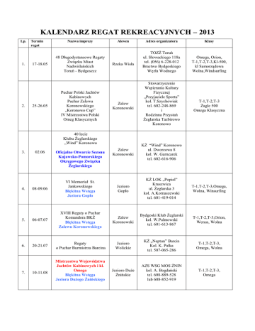 KALENDARZ REGAT REKREACYJNYCH – 2013 Lp. 1. 2. Termin regat 17-18.05 25-26.05 Nazwa imprezy 48 Długodystansowe Regaty Związku Miast Nadwiślańskich Toruń - Bydgoszcz Puchar Polski Jachtów Kabinowych Puchar Zalewu Koronowskiego „Koronowo Cup” IV Mistrzostwa Polski Omeg Klasycznych Akwen Rzeka Wisła Zalew Koronowski 40 lecie Klubu Żeglarskiego „Wind” Koronowo Adres organizatora Klasy TOZŻ Toruń ul. Słowackiego 118a tel. (056) 6-228-012 Bractwo Bydgoskiego Węzła Wodnego Omega, Orion, T-1,T-2,T-3,Kl-500, kl Samorządowa Wolna,Windsurfing Stowarzyszenie Wspierania Kultury Fizycznej „Przyjaciele Sportu” kol. T.Szychowiak tel. 602-248-869 i Rodzinna Przystań Żeglarska Tazbirowo Koronowo T-1,T-2,T-3 Żagle 500 Omega Klasyczna Zalew Koronowski KŻ “Wind” Koronowo ul. Dworcowa 8 kol. W. Garncarek tel. 602-616-906 08-09.06 VI Memoriał St. Jankowskiego Błękitna Wstęga Jeziora Gopło Jezioro Gopło KŻ LOK „Popiel” Kruszwica ul. Żeglarska 3 kol. A.Kornaszewski tel. 601-419-014 T-1,T-2,T-3,Omega, Wolna, Winsurfing 5. 06-07.07 XVIII Regaty o Puchar Komandora BKŻ Błękitna Wstęga Zalewu Koronowskiego Zalew Koronowski Bydgoski Klub Żeglarski kol. W.Palmowski tel. 601-613-867 T-1,T-2,T-3,Orion, Wenus, Wolna 6. 20-21.07 Regaty o Puchar Burmistrza Barcina Jezioro Wolickie KŻ „Neptun” Barcin Kol. K. Pałka tel. 507-065-286 T-1,T-2,T-3, Omega, Wolna Jezioro Duże Żnińskie AZS WSG MOS ŻNIN kol. A. Bogdański tel. 608-889-528 lub 608-852-919 T-1,T-2,T-3, Omega 3. 4. 7. 02.06 10-11.08 Oficjalne Otwarcie Sezonu Kujawsko-Pomorskiego Okręgowego Związku Żeglarskiego Mistrzostwa Województwa Jachtów Kabinowych i kl. Omega Błękitna Wstęga Jeziora Dużego Żnińskiego 15.08 Regaty Młodzieżowe z okazji Dnia Wojska Polskiego Zalew Koronowski WKŻ „Pasat” oddział PTTK przy POW Bydgoszcz ul. Sułkowskiego 52 kol. K.Laskowski tel. 501-306-345 17-18.08 Kujawsko-Pałucka Operacja Żagiel Błękitna Wstęga Jeziora Mielno Jezioro Mielno YKP Inowrocław ul. Wikińskiego 35 kol. J.Byner tel. 602-251-190 10. 24-25.08 Regaty Janikowo 2013 Błękitna Wstęga Jeziora Pakoskiego Jezioro Pakoskie 11. 17.08 Regaty o Puchar Burmistrza Koronowa Zalew Koronowski 12. 14-15.09 „Pałuki Omega Cup” Finał Pucharu Polski Jezioro Duże Żnińskie 13. 15.09 Regaty Pamięci Zalew Koronowski 8. 9. KŻ „Kormoran” Janikowo ul. Przemysłowa 6 kol. Z.Klimczak tel. 691-378-744 KŻ “Wind” Koronowo ul. Dworcowa 8 kol. W. Garncarek tel. 602-616-906 AZS WSG MOS ŻNIN kol. A. Bogdański tel. 608-889-528 lub 608-852-919 WKŻ „Pasat” oddział PTTK przy POW Bydgoszcz ul. Sułkowskiego 52 kol. K.Laskowski tel. 501-306-345 T-1,T-2,T-3, Omega, Orion,Wenus,Wolna T-1,T-2,T-3, Omega, T-1,T-2,T-3, Omega, Wolna, T-1,T-2,T-3,Omega, Orion,Venus Omega Sport i Standard T-1,T-2,T-3,Orion, Wenus, Wolna, Omega
