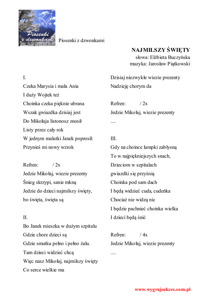 Piosenki z dzwonkami NAJMILSZY ŚWIĘTY słowa: Elżbieta Buczyńska muzyka: Jarosław Piątkowski I. Dzisiaj niezwykłe wiezie prezenty Czeka Marysia i mała Ania Nadzieję chorym da I duży Wojtek też Choinka czeka pięknie ubrana Refren: Wszak gwiazdka dzisiaj jest Jedzie Mikołaj, wiezie prezenty Do Mikołaja listonosz znosił .... / 2x Listy przez cały rok W jednym malutki Janek poprosił: III. Przynieś mi nowy wzrok Gdy na choince lampki zabłysną To w najpiękniejszych snach, Refren: / 2x Dzieciom w szpitalach Jedzie Mikołaj, wiezie prezenty gwiazdki się przyśnią Śnieg skrzypi, sanie mkną Choinka pod sam dach Jedzie do dzieci najmilszy święty, I będą widzieć cuda, cudeńka bo święta, święta są Chociaż nie widzą nic I będzie pachnieć choinka wielka II. I dzieci będą śnić Bo Janek mieszka w dużym szpitalu Gdzie chore dzieci są Refren: Gdzie smutku pełno i pełno żalu. Jedzie Mikołaj, wiezie prezenty Tam dzieci widzieć chcą .... / 4x Więc nasz Mikołaj, najmilszy święty Co serce wielkie ma www.wygrajsukces.com.pl