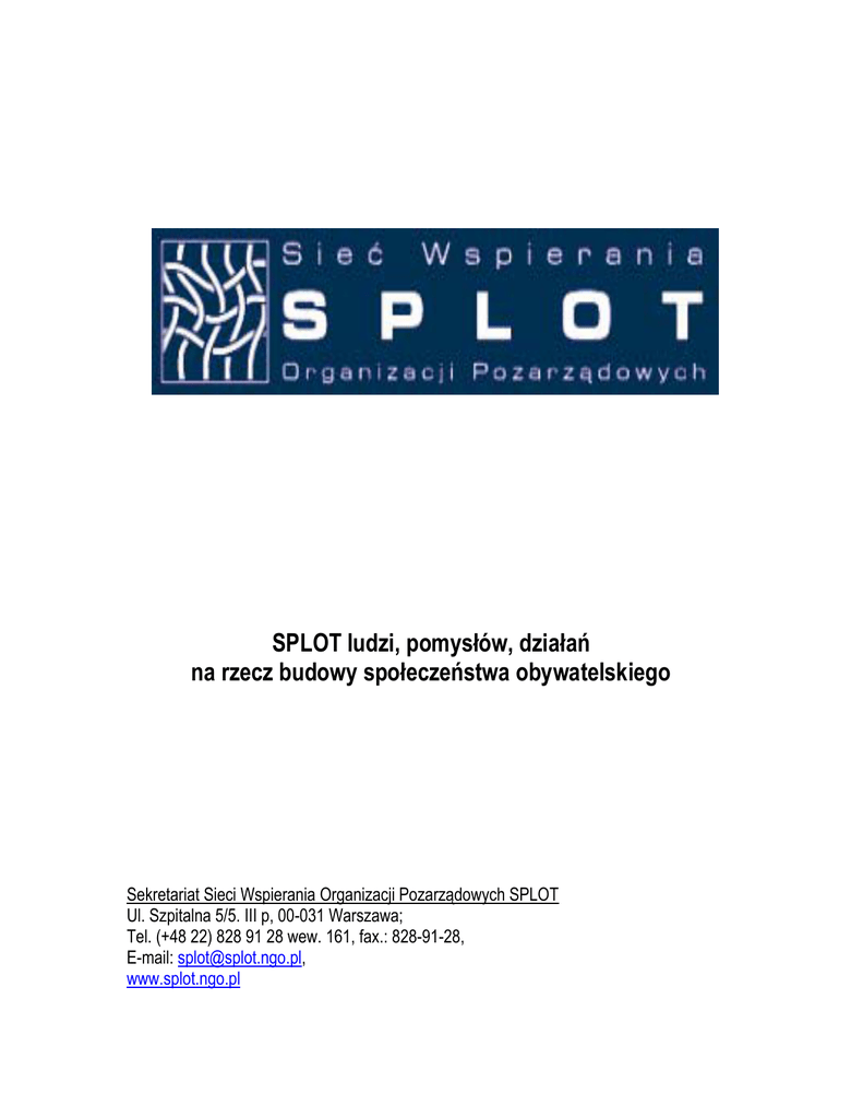 SPLOT ludzi, pomysłów, działań na rzecz budowy społeczeństwa obywatelskiego Sekretariat Sieci Wspierania Organizacji Pozarządowych SPLOT Ul. Szpitalna 5/5. III p, 00-031 Warszawa; Tel. (+48 22) 828 91 28 wew. 161, fax.: 828-91-28, E-mail: [email protected], www.splot.ngo.pl Sieć Wspierania Organizacji Pozarządowych „SPLOT” została założona przez sześć organizacji w 1996 r, na podstawie umowy o współdziałaniu. Od stycznia 2003 sieć jest sądownie zarejestrowanym związkiem stowarzyszeń. Naszą misją jest wspieranie budowy społeczeństwa obywatelskiego, którego integralnym elementem są organizacje pozarządowe i inne inicjatywy obywatelskie. Naszym celem jest zwiększanie umiejętności zarządzania i długofalowego działania organizacji pozarządowych, rozwój współpracy pomiędzy instytucjami państwowymi, samorządowymi i pozarządowymi, propagowanie wiedzy o organizacji pozarządowych. Ośrodki prowadzą swoje działania przede wszystkim na obszarze swoich regionów. To właśnie lokalne społeczności są miejscem, gdzie Sieć SPLOT poprzez organizacje w niej zrzeszone, aktywnie wspiera inicjatywy obywatelskie. Podstawą naszego działania jest edukacja, dzięki wypracowaniu spójnego systemu dopełniających się form pomocy - gromadzenia i dystrybucji informacji, prowadzenie poradnictwa i konsultacji, organizowania szkoleń - efektywnie kształcimy osoby angażujące się w życie społeczne. Naszych standardowych usług udzielamy także w terenie. Nasze biura Białymstoku, Elblągu, Gdańsku, Jeleniej Górze, Katowicach, Koszalinie, Lesznie, Lublinie, Łodzi, Rzeszowie, Słupsku, Wałbrzychu, Warszawie, Wrocławiu wyposażone są komputery i stałe łącza internetowe. Prowadzimy biblioteczki, których gromadzimy publikacje dotyczące sektora pozarządowego. Dysponujemy przygotowaną i doświadczoną kadrą zarówno poradników jak i trenerów. Z wszystkich tych zasobów korzystają nieodpłatnie zgłaszające się po pomoc organizacje. Od początku istnienia Sieć Wspierania Organizacji Pozarządowych SPLOT, jeszcze jako nie zarejestrowane sądownie porozumienie organizacji, realizowała wspólne, ponadregionalne programy. Dotyczyły one przede wszystkim tworzenia lokalnych sieci dystrybucji informacji, zwiększania umiejętności zarządzania w organizacjach pozarządowych, integracji sektora pozarządowego, inicjowania powstawania federacji organizacji o charakterze branżowym jak i regionalnym, inicjowania i wprowadzenia w życie zasad współpracy organizacji pozarządowych z samorządem lokalnym, prowadzenia badania i analizy sektora pozarządowego, włączania sektora organizacji pozarządowych w proces integracji z Unią Europejską. Od początku powstania ośrodki Sieci SPLOT inicjowały i wspierały rozwój innych ważnych dla sektora pozarządowego organizacji i sieci organizacji jak. np. Centra Wolontariatu, Fundusze Lokalne (wspólnie z Akademią Rozwoju Filantropii), Biura Porad Obywatelskich (wspólnie ze Związkiem Biur Porad Obywatelskich) oraz Centra Aktywności Lokalnej. Struktura Najwyższym organem Sieci SPLOT jest Walne Zgromadzenie Członków. W jego skład wchodzi po dwóch przedstawicieli każdego z Ośrodków. Na jego czele stoi Przewodniczący wybierany spośród członków Walnego Zgromadzenia. Obecnie funkcję tą pełni Jerzy Boczoń. Organem wspierającym działania Walnego Zgromadzenia Członków jest Zarząd. Nad przestrzeganiem istniejących standardów Sieci SPLOT czuwa Komisja Standaryzacyjna. Ciałem wspierającym bieżące działania jest warszawskie biuro sieci zwane Sekretariatem Sieci SPLOT, którym kieruje dyrektor (obecnie Łukasz Domagała). Od stycznia 2003 roku Sieć SPLOT obsługa wspólnych projektów jest realizowana przez nowy podmiot prawny - związek stowarzyszeń w oparciu istniejące wyżej wymienione struktury. Sieć tworzą następujące organizacje: 1. Centrum Promocji i Rozwoju Inicjatyw Obywatelskich OPUS, Łodź 2. Centrum Wspierania Organizacji Pozarządowych CeWOP, Rzeszów 3. Słupskie Centrum Wspomagania Organizacji Pozarządowych, Słupsk 4. Biuro Obsługi Ruchu Inicjatyw Społecznych BORIS, Warszawa 5. Stowarzyszenie Klon/Jawor, Warszawa 6. Ośrodek Wspierania Organizacji Pozarządowych, Białystok 7. Elbląskie Stowarzyszenie Wspierania Inicjatyw Pozarządowych, Elbląg 8. Fundacja Regionalne Centrum Informacji i Wspomagania Organizacji Pozarządowych, Gdańsk 9. Regionalne Centrum Wspierania Inicjatyw Pozarządowych, Wałbrzych 10. Lubelski Ośrodek Samopomocy LOS, Lublin 11. Koszalińskie Centrum Wspierania Organizacji Pozarządowych w Koszalinie 12. Centrum Promocji i Rozwoju Inicjatyw Obywatelskich PISOP w Lesznie Główne dokonania Sieci SPLOT w latach 2001-2002 r. 1. 10 ośrodków tworzących Sieć SPLOT udzieliło ponad 4000 bezpłatnych porad i konsultacji przedstawicielom organizacji pozarządowych, instytucji publicznych, osobom prywatnym i innym zainteresowanym; udzielono także ponad 32 000 informacji bezpośrednio lub poprzez pocztę, pocztę elektroniczną i Internet. 2. We współpracy ze Stowarzyszeniem KLON/JAWOR jako administratorem programu Towarzystwa Wzajemnej Informacji (www.ngo.pl), inne ośrodki Sieci SPLOT uruchomiły 6 portali regionalnych tematycznie skierowanych do organizacji pozarządowych z poszczególnych województw: www.dolnyslask.ngo.pl www.lodzkie.ngo.pl www.pomorskie.ngo.pl www.slask.ngo.pl www.warminsko-mazurskie.ngo.pl 3. Przy współpracy Sieci SPLOT z Stowarzyszeniem Młodzi Młodym z Koszalina oraz Fundacji Odzew Leszna powstały dwa nowe ośrodki wspierania w kolejnych województwach: zachodniopomorskim i wielkopolskim. 4. Ośrodki tworzące Sieć SPLOT zorganizowały ok. 150 sesji szkoleniowych, w których uczestniczyło ponad 190 osób z organizacji pozarządowych i administracji publicznej. 5. Integracja sektora pozarządowego jest jednym z priorytetów w działalności ośrodków Sieci SPLOT, od co najmniej 4 lat. W roku 2002 Sieć SPLOT: u
