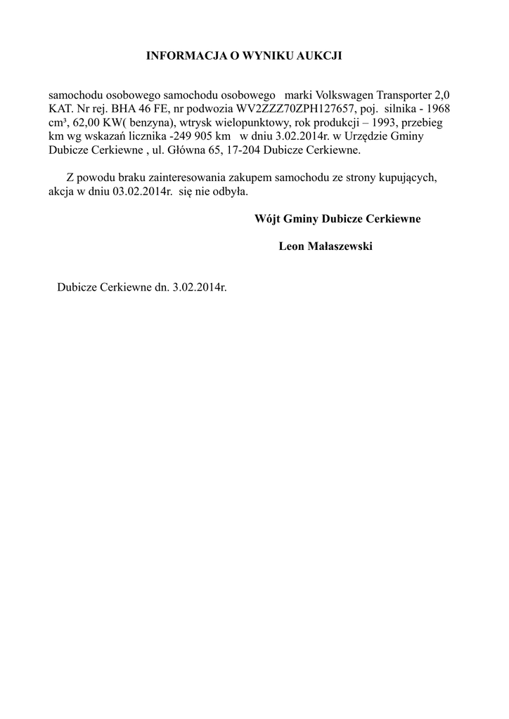 INFORMACJA O WYNIKU AUKCJI samochodu osobowego samochodu osobowego marki Volkswagen Transporter 2,0 KAT. Nr rej. BHA 46 FE, nr podwozia WV2ZZZ70ZPH127657, poj. silnika - 1968 cm³, 62,00 KW( benzyna), wtrysk wielopunktowy, rok produkcji – 1993, przebieg km wg wskazań licznika -249 905 km w dniu 3.02.2014r. w Urzędzie Gminy Dubicze Cerkiewne , ul. Główna 65, 17-204 Dubicze Cerkiewne. Z powodu braku zainteresowania zakupem samochodu ze strony kupujących, akcja w dniu 03.02.2014r. się nie odbyła. Wójt Gminy Dubicze Cerkiewne Leon Małaszewski Dubicze Cerkiewne dn. 3.02.2014r.
