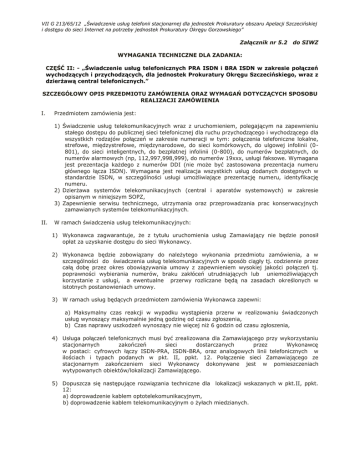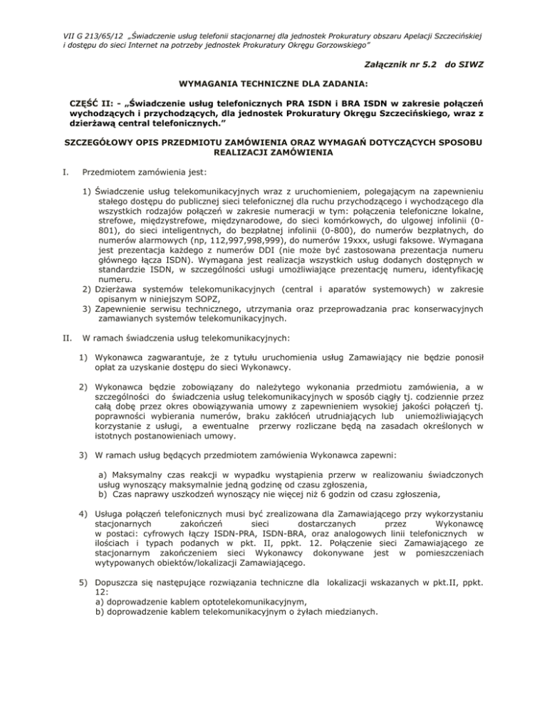 VII G 213/65/12 „Świadczenie usług telefonii stacjonarnej dla jednostek Prokuratury obszaru Apelacji Szczecińskiej i dostępu do sieci Internet na potrzeby jednostek Prokuratury Okręgu Gorzowskiego” Załącznik nr 5.2 do SIWZ WYMAGANIA TECHNICZNE DLA ZADANIA: CZĘŚĆ II: - „Świadczenie usług telefonicznych PRA ISDN i BRA ISDN w zakresie połączeń wychodzących i przychodzących, dla jednostek Prokuratury Okręgu Szczecińskiego, wraz z dzierżawą central telefonicznych.” SZCZEGÓŁOWY OPIS PRZEDMIOTU ZAMÓWIENIA ORAZ WYMAGAŃ DOTYCZĄCYCH SPOSOBU REALIZACJI ZAMÓWIENIA I. Przedmiotem zamówienia jest: 1) Świadczenie usług telekomunikacyjnych wraz z uruchomieniem, polegającym na zapewnieniu stałego dostępu do publicznej sieci telefonicznej dla ruchu przychodzącego i wychodzącego dla wszystkich rodzajów połączeń w zakresie numeracji w tym: połączenia telefoniczne lokalne, strefowe, międzystrefowe, międzynarodowe, do sieci komórkowych, do ulgowej infolinii (0801), do sieci inteligentnych, do bezpłatnej infolinii (0-800), do numerów bezpłatnych, do numerów alarmowych (np, 112,997,998,999), do numerów 19xxx, usługi faksowe. Wymagana jest prezentacja każdego z numerów DDI (nie może być zastosowana prezentacja numeru głównego łącza ISDN). Wymagana jest realizacja wszystkich usług dodanych dostępnych w standardzie ISDN, w szczególności usługi umożliwiające prezentację numeru, identyfikację numeru. 2) Dzierżawa systemów telekomunikacyjnych (central i aparatów systemowych) w zakresie opisanym w niniejszym SOPZ, 3) Zapewnienie serwisu technicznego, utrzymania oraz przeprowadzania prac konserwacyjnych zamawianych systemów telekomunikacyjnych. II. W ramach świadczenia usług telekomunikacyjnych: 1) Wykonawca zagwarantuje, że z tytułu uruchomienia usług Zamawiający nie będzie ponosił opłat za uzyskanie dostępu do sieci Wykonawcy. 2) Wykonawca będzie zobowiązany do należytego wykonania przedmiotu zamówienia, a w szczególności do świadczenia usług telekomunikacyjnych w sposób ciągły tj. codziennie przez całą dobę przez okres obowiązywania umowy z zapewnieniem wysokiej jakości połączeń tj. poprawności wybierania numerów, braku zakłóceń utrudniających lub uniemożliwiających korzystanie z usługi, a ewentualne przerwy rozliczane będą na zasadach określonych w istotnych postanowieniach umowy. 3) W ramach usług będących przedmiotem zamówienia Wykonawca zapewni: a) Maksymalny czas reakcji w wypadku wystąpienia przerw w realizowaniu świadczonych usług wynoszący maksymalnie jedną godzinę od czasu zgłoszenia, b) Czas naprawy uszkodzeń wynoszący nie więcej niż 6 godzin od czasu zgłoszenia, 4) Usługa połączeń telefonicznych musi być zrealizowana dla Zamawiającego przy wykorzystaniu stacjonarnych zakończeń sieci dostarczanych przez Wykonawcę w postaci: cyfrowych łączy ISDN-PRA, ISDN-BRA, oraz analogowych linii telefonicznych w ilościach i typach podanych w pkt. II, ppkt. 12. Połączenie sieci Zamawiającego ze stacjonarnym zakończeniem sieci Wykonawcy dokonywane jest w pomieszczeniach wytypowanych obiektów/lokalizacji Zamawiającego. 5) Dopuszcza się następujące rozwiązania techniczne dla lokalizacji wskazanych w pkt.II, ppkt. 12: a) doprowadzenie kablem optotelekomunikacyjnym, b) doprowadzenie kablem telekomunikacyjnym o żyłach miedzianych. VII G 213/65/12 „Świadczenie usług telefonii stacjonarnej dla jednostek Prokuratury obszaru Apelacji Szczecińskiej i dostępu do sieci Internet na potrzeby jednostek Prokuratury Okręgu Gorzowskiego” 6) Zamawiający wymaga zapewnienia pełnej prezentacji numeru dla wszystkich połączeń przychodzących i wychodzących. 7) Zamawiający zastrzega sobie, iż usługa nie może być świadczona z użyciem technologii alternatywnych, tj. bramki GSM, numery dostępowe, VoIP. 8) Zamawiający nie dopuszcza żadnych opłat za inicjację połączeń. 9) Wykonawca zapewni sekundowe naliczanie opłat za połączenie telefoniczne i będzie naliczał koszty połączeń wg stawek z formularza ofertowego. 10) Połączenia telefoniczne i nielimitowane. między lokalizacjami Zamawiającego będą bezpłatne 11) Wymaga się od Wykonawcy dostarczania w cyklach miesięcznych pełnego zestawienia bilingowego, tzn. wykazu zrealizowanych połączeń zawierających informację: o numerze DDI z jakiego wykonano połączenie, datę, godzinę, czas trwania połączenia wraz z kosztami. Dopuszcza się możliwość dostarczania powyższych danych pocztą elektroniczną lub na nośniku CD w terminie do 14 dni roboczych od zakończenia cyklu rozliczeniowego. 12) Wykonawca zapewni instalację wraz z uruchomieniem lub zachowanie typu świadczonej usługi telekomunikacyjnej wykazanej w tabeli poniżej, a także zapewni uruchomienie i utrzymanie numeracji o formacie AB SPQMXXX: l.p. 1. 2. 3. 4. 5. 6. 7. Miejsce instalacji (Adres) Prokuratura Okręgowa w Szczecinie Ul. Stoisława 6 70-952 Szczecin Prokuratura Okręgowa w Szczecinie Ul. Stoisława 6 70-952 Szczecin Prokuratura Okręgowa w Szczecinie Ul. Stoisława 6 70-952 Szczecin Prokuratura Rejonowa w Gryfinie Ul. Grunwaldzka 2 74-100 Gryfino Prokuratura Rejonowa w Gryfinie Ul. Grunwaldzka 2 74-100 Gryfino Prokuratura Rejonowa w Goleniowie Ul. Dworcowa 2 72-100 Goleniów Prokuratura Rejonowa w Goleniowie Ul. Dworcowa 2 72-100 Goleniów Aktualny numer / Przeznaczenie zakres numeracyjny 914849600Dostęp do 914849699 centrali 914416700telefonicznej 914416799 914489700Dostęp do 914489729 centrali 914416600telefonicznej 914416669 914489323 Linia 914330992 telefoniczna 914336003 914336005 Dostęp do centrali telefonicznej 914168030914168049 Linia telefoniczna 914162368 Dostęp do centrali telefonicznej 914073320914073339 Linia telefoniczna 914182549 Dostęp Typ dostępu Liczba zamawianych numerów DDI / MSN ISDN 30B+D 200 ISDN 30B+D 100 ISDN 4 x 2B+D 4 ISDN 2 x 2B+D 20 Analogowy Analogowy ISDN 2 x 2B+D Analogowy Analogowy 1 2