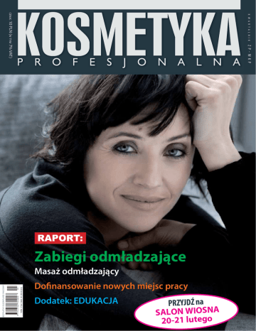 Z P-W K P 10 PLN (W TYM 7% VAT) K W A R T A L N I K CENA: RAPORT: Zabiegi odmładzające 25 ISSN 1734-7440 01/2010 (25) BEZPŁATNY EGZEMPLARZ OKAZOWY Masaż odmładzający Dofinansowanie nowych miejsc pracy Dodatek: EDUKACJA PRZYJDŹ na SALON WIOSNA 20-21 lutego Czekolada i L-karnityna aktualności l Zabieg przeznaczony do pielęgnacji ciała dotkniętego problemem cellulitu i nadmiernie nagromadzonej tkanki tłuszczowej. Dostarcza skórze zastrzyku energetycznego, wzmacnia ją i relaksuje. Wykorzystuje właściwości aromaterapeutyczne, wyszczuplające i odżywcze czekolady, wygładza skórę oraz dostarcza jej składników pielęgnacyjnych. Dodatkowo aromat czekolady wyzwala β-endorfiny (hormony szczęścia), zmniejszając zmęczenie i poprawiając nastrój. Producent: Bielenda. Ocean Spa Krem pod oczy i w okolice ust Bogata receptura kremu zawiera wygładzający lipopeptyd, który stymulując procesy syntezy kolagenu, poprawia elastyczność skóry i zmniejsza widoczność zmarszczek. Przywraca napięcie delikatnej skórze wokół oczu, czyniąc ją odporniejszą na powstawanie zmarszczek, dzięki obecności kwasu gammalinolenowego zawartego w oleju z ogórecznika lekarskiego. W swej recepturze zawiera kompleks EyelissTM, który reguluje mikrokrążenie, skutecznie zmniejszając cienie i obrzęki pod oczami. Zapewnia optymalne nawilżenie skóry i zapobiega jej przedwczesnemu starzeniu się, dzięki obecności witaminy E i kwasu hialuronowego. Producent: Oceanic. Seria kosmetyków antycellulitowych Abacosun o relaksującym zapachu. Produkty wygładzają skórkę pomarańczową, działają ujędrniająco, wyszczuplająco i odmładzająco. Bezpośrednio po zastosowaniu skóra staje się jedwabiście gładka i miękka. Kosmetyki Ocean Spa zawierają naturalne składniki morskie, takie jak: algi, kawior, olejek z alg, czy puder perłowy. Dostępne są: peeling z solą morską, maska, serum oraz balsam do ciała. Cattier dla mężczyzn AFP Business International, przedstawiciel Cattier, proponuje serię dla mężczyzn Gamme Homme. To propozycja dla panów żyjących w zgodzie z naturą. 100% naturalne biokosmetyki o delikatnej, świeżej nucie zapachowej pieprzowej mięty i wyjątkowych właściwościach pikantnego kakaowca, olejku arganowego, olejku z eukaliptusa i wyciągu z białej herbaty i oczaru wirgilijskiego. W zestawie znajduje się: krem do każdego typu skóry, kremowa pianka do golenia, łagodzący balsam po goleniu, żel do mycia twarzy, żel do ciała, dezodorant. Wszystkie produkty posiadają ECOCERT i Bio-certyfikat. Wyciąg z pereł Ultimate Luxury Pearl to innowacyjna seria kosmetyków z wartościowym wyciągiem z pereł słodkowodnych - szlachetnym źródłem silnie regenerujących i odżywiających substancji czynnych, z proteinami z jedwabiu oraz nawilżającym Aquafill® z kwasem hialuronowym i wyciągiem z jęczmienia. Wyjątkowa kompozycja luksusowych składników zapewni skórze kompleksową, ekskluzywną pielęgnację, w pełni likwidując objawy starzenia się i nadając cerze młody, piękny wygląd na długi czas. Regeneracja skóry Odżywcza i regenerująca kuracja dla skóry o zmniejszonych energetycznych rezerwach ATP, z problemem starzenia, wymagającej intensywnego odżywienia. Zalecana także w podtrzymującej kuracji po zabiegach dermoestetycznych/złuszczających, mezoterapii bezigłowej, mikrodermabrazji itp. Preparaty zawierają intensywne składniki aktywne przeciwzmarszczkowe i odmładzające: stymulator ATP, niskocząsteczkowy kwas hialuronowy, retinol błękitny, kompleks peptydowy, ekstrakt ze złotego korzenia, kompleks ekstraktów roślinnych w synergii z żelem aloesowym, olej avocado, witaminy E i A, masło kawowe i shea. Aplikacja preparatów gabinetowych i pielęgnacji domowej daje efekt wyraźnego odmłodzenia i witalizacji, skóra jest bardziej wygładzona, nawilżona i sprężysta, lepiej odżywiona, o wyrównanym i zdrowym kolorycie. W linii dostępny jest szeroki wybór preparatów: mleczko, tonik, ampułki żelowe do wmasowania i sonoforezy, maska emulsyjna, kremy w pielęgnacji dziennej i nocnej. Dystrybutor: Chantarelle. Maski oparte na glukozie Firma Janssen Cosmeceutical wprowadza do sprzedaży maski typu pell-off - to nowa generacja popularnych masek proszkowych. Innowacyjna receptura oparta jest na cennej substancji - glukozie. Cukier (glukoza) w swojej najczystszej postaci zapewnia nawilżenie i jego utrzymanie, czyli podstawę zdrowej i receptywnej skóry. Dzięki konsystencji podobnej do żelu, dodatkowy alginian tej maski, pozyskany z brunatnic, zapewnia szczególnie miękką i elastyczną teksturę, która będzie łatwiej i wygodniej aplikowana, a także zdejmowana ze skóry klientki. Dzięki zwiększonemu nawilżeniu skóry, substancje aktywne zawarte w ampułce i odpowiednia maska peel-off są w stanie łatwiej penetrować i intensywniej odżywiać skórę w bardzo krótkim czasie. Maski konfekcjonowane są w saszetki 50 g. l aktualności Kuracja dla skóry mieszanej Kuracja normalizująca z kwasem migdałowym i z aktywnymi składnikami regulującymi wydzielanie sebum i poziom nawilżenia dla skóry mieszanej, zaliczanej do jednej z trudniejszych w prawidłowej pielęgnacji. Strefa T z nasilonym wydzielaniem sebum oraz partie skóry suchej, podrażnionej, napiętej, nawet łuszczącej się, to stały dyskomfort zdrowotny i estetyczny. Normacell to kompleksowa kuracja regulująca poziom wydzielania sebum w partiach tłustych i silnie nawilżająca w partiach suchych. Składniki aktywne w preparatach to: naturalne saponiny, kwas migdałowy, działający przeciwzapalnie, antybakteryjnie oraz jednocześnie normalizujący wydzielanie sebum i nawilżający, fermentowane proteiny mleczne normalizujące wydzielanie sebum, silnie nawilżające kserofity, ekstrakty z wielu roślin i ziół silnie odbudowujące TEWL i TEUL Salicornia Herbacea, jemioła, rokitnik, chmiel, melisa, koper, rumianek, krwawnik i lekki olej z kwiatów m