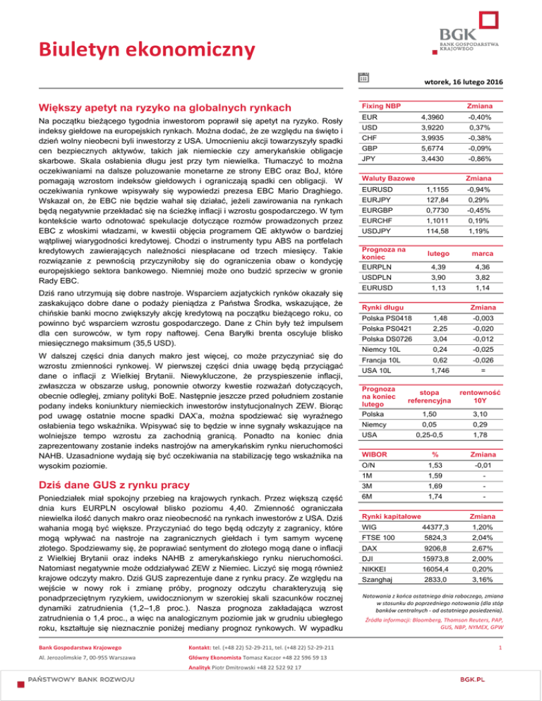 Biuletyn ekonomiczny wtorek, 16 lutego 2016 Większy apetyt na ryzyko na globalnych rynkach Fixing NBP Na początku bieżącego tygodnia inwestorom poprawił się apetyt na ryzyko. Rosły indeksy giełdowe na europejskich rynkach. Można dodać, że ze względu na święto i dzień wolny nieobecni byli inwestorzy z USA. Umocnieniu akcji towarzyszyły spadki cen bezpiecznych aktywów, takich jak niemieckie czy amerykańskie obligacje skarbowe. Skala osłabienia długu jest przy tym niewielka. Tłumaczyć to można oczekiwaniami na dalsze poluzowanie monetarne ze strony EBC oraz BoJ, które pomagają wzrostom indeksów giełdowych i ograniczają spadki cen obligacji. W oczekiwania rynkowe wpisywały się wypowiedzi prezesa EBC Mario Draghiego. Wskazał on, że EBC nie będzie wahał się działać, jeżeli zawirowania na rynkach będą negatywnie przekładać się na ścieżkę inflacji i wzrostu gospodarczego. W tym kontekście warto odnotować spekulacje dotyczące rozmów prowadzonych przez EBC z włoskimi władzami, w kwestii objęcia programem QE aktywów o bardziej wątpliwej wiarygodności kredytowej. Chodzi o instrumenty typu ABS na portfelach kredytowych zawierających należności niespłacane od trzech miesięcy. Takie rozwiązanie z pewnością przyczyniłoby się do ograniczenia obaw o kondycję europejskiego sektora bankowego. Niemniej może ono budzić sprzeciw w gronie Rady EBC. EUR 4,3960 USD 3,9220 0,37% CHF 3,9935 -0,38% GBP 5,6774 -0,09% JPY 3,4430 -0,86% Dziś rano utrzymują się dobre nastroje. Wsparciem azjatyckich rynków okazały się zaskakująco dobre dane o podaży pieniądza z Państwa Środka, wskazujące, że chińskie banki mocno zwiększyły akcję kredytową na początku bieżącego roku, co powinno być wsparciem wzrostu gospodarczego. Dane z Chin były też impulsem dla cen surowców, w tym ropy naftowej. Cena Baryłki brenta oscyluje blisko miesięcznego maksimum (35,5 USD). W dalszej części dnia danych makro jest więcej, co może przyczyniać się do wzrostu zmienności rynkowej. W pierwszej części dnia uwagę będą przyciągać dane o inflacji z Wielkiej Brytanii. Niewykluczone, że przyspieszenie inflacji, zwłaszcza w obszarze usług, ponownie otworzy kwestie rozważań dotyczących, obecnie odległej, zmiany polityki BoE. Następnie jeszcze przed południem zostanie podany indeks koniunktury niemieckich inwestorów instytucjonalnych ZEW. Biorąc pod uwagę ostatnie mocne spadki DAX’a, można spodziewać się wyraźnego osłabienia tego wskaźnika. Wpisywać się to będzie w inne sygnały wskazujące na wolniejsze tempo wzrostu za zachodnią granicą. Ponadto na koniec dnia zaprezentowany zostanie indeks nastrojów na amerykańskim rynku nieruchomości NAHB. Uzasadnione wydają się być oczekiwania na stabilizację tego wskaźnika na wysokim poziomie. Dziś dane GUS z rynku pracy Poniedziałek miał spokojny przebieg na krajowych rynkach. Przez większą część dnia kurs EURPLN oscylował blisko poziomu 4,40. Zmienność ograniczała niewielka ilość danych makro oraz nieobecność na rynkach inwestorów z USA. Dziś wahania mogą być większe. Przyczyniać do tego będą odczyty z zagranicy, które mogą wpływać na nastroje na zagranicznych giełdach i tym samym wycenę złotego. Spodziewamy się, że poprawiać sentyment do złotego mogą dane o inflacji z Wielkiej Brytanii oraz indeks NAHB z amerykańskiego rynku nieruchomości. Natomiast negatywnie może oddziaływać ZEW z Niemiec. Liczyć się mogą również krajowe odczyty makro. Dziś GUS zaprezentuje dane z rynku pracy. Ze względu na wejście w nowy rok i zmianę próby, prognozy odczytu charakteryzują się ponadprzeciętnym ryzykiem, uwidocznionym w szerokiej skali szacunków rocznej dynamiki zatrudnienia (1,2–1,8 proc.). Nasza prognoza zakładająca wzrost zatrudnienia o 1,4 proc., a więc na analogicznym poziomie jak w grudniu ubiegłego roku, kształtuje się nieznacznie poniżej mediany prognoz rynkowych. W wypadku Bank Gospodarstwa Krajowego Kontakt: tel. (+48 22) 52-29-211, tel. (+48 22) 52-29-211 Al. Jerozolimskie 7, 00-955 Warszawa Główny Ekonomista Tomasz Kaczor +48 22 596 59 13 Analityk Piotr Dmitrowski +48 22 522 92 17 Zmiana Waluty Bazowe -0,40% Zmiana EURUSD 1,1155 EURJPY 127,84 0,29% EURGBP 0,7730 -0,45% EURCHF 1,1011 0,19% USDJPY 114,58 1,19% Prognoza na koniec EURPLN -0,94% lutego marca 4,39 4,36 USDPLN 3,90 3,82 EURUSD 1,13 1,14 Rynki długu Zmiana Polska PS0418 1,48 -0,003 Polska PS0421 2,25 -0,020 Polska DS0726 3,04 -0,012 Niemcy 10L 0,24 -0,025 Francja 10L 0,62 -0,026 USA 10L 1,746 = Prognoza na koniec lutego Polska stopa referencyjna rentowność 10Y 1,50 3,10 0,05 0,29 0,25-0,5 1,78 Niemcy USA WIBOR % Zmiana O/N 1,53 -0,01 1M 1,59 - 3M 1,69 - 6M 1,74 - Rynki kapitałowe Zmiana WIG 44377,3 1,20% FTSE 100 5824,3 2,04% DAX 9206,8 2,67% DJI 15973,8 2,00% NIKKEI 16054,4 0,20% Szanghaj 2833,0 3,16% Notowania z końca ostatniego dnia roboczego, zmiana w stosunku do poprzedniego notowania (dla stóp banków centralnych - od ostatniego posiedzenia). Źródła informacji: Bloomberg, Thomson Reuters, PAP, GUS, NBP, NYMEX, GPW 1 Biuletyn ekonomiczny wtorek, 16 lutego 2016 poziomie 1,29 proc. Odnotować można wysoki popyt na papiery, przekraczający 5,35 mld PLN. W efekcie MF zdecydowało się zorganizować przetarg uzupełniający, na którym uplasowano papiery o wartości 400 mln PLN. dynamiki wynagrodzeń również prognozujemy nieco niższy niż mediana poziom (2,9 proc. rdr vs 3,4 proc. rdr). Niemniej uważamy, że realizacja naszych prognoz zostanie pozytywnie odebrana przez rynek i będzie korzystnie oddziaływać na wartość złotego. Będzie ona i tak potwierdzać solidne fundamenty krajowego wzrostu wyrażone we wciąż wysokim, choć nieco niższym niż zakłada konsensus, przyroście realnego funduszu płac. Spodziewamy się, że kurs EURPLN będzie oscylować w przedziale 4,375-4,41. Dziś oczekujemy, że utrzymywać się będzie niewielka wr