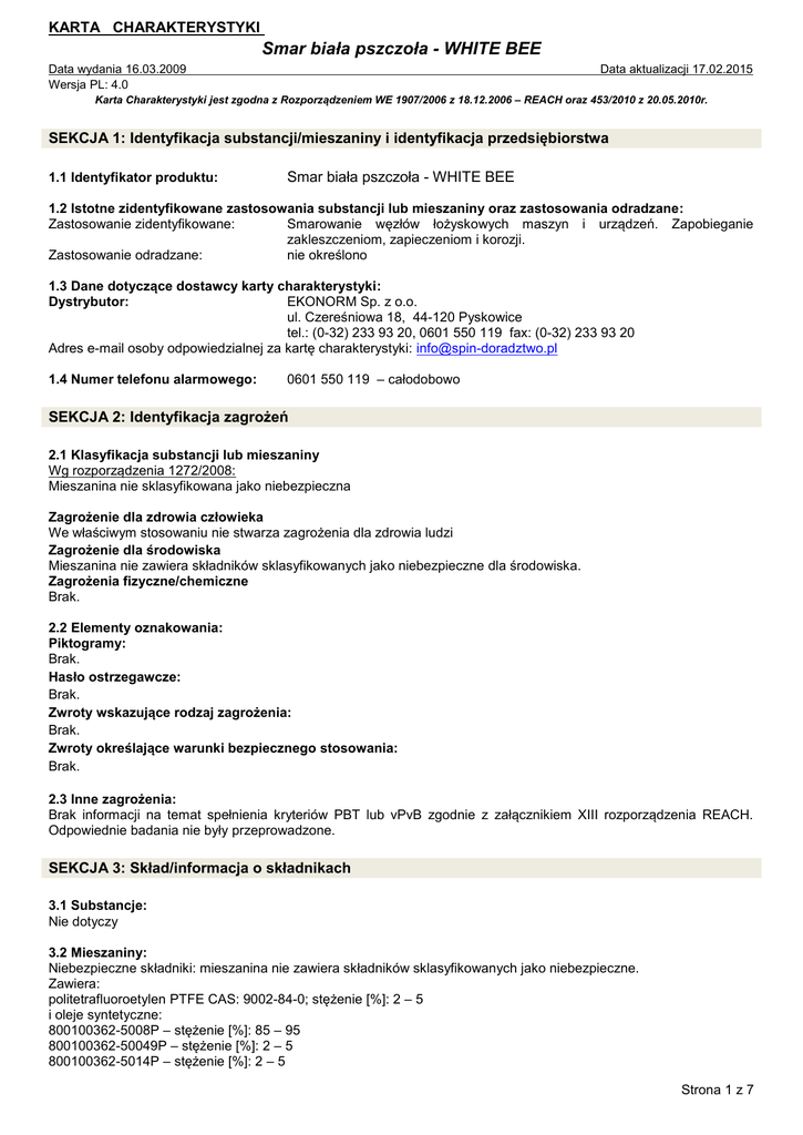 KARTA CHARAKTERYSTYKI Smar biała pszczoła - WHITE BEE Data wydania 16.03.2009 Wersja PL: 4.0 Data aktualizacji 17.02.2015 Karta Charakterystyki jest zgodna z Rozporządzeniem WE 1907/2006 z 18.12.2006 – REACH oraz 453/2010 z 20.05.2010r. SEKCJA 1: Identyfikacja substancji/mieszaniny i identyfikacja przedsiębiorstwa 1.1 Identyfikator produktu: Smar biała pszczoła - WHITE BEE 1.2 Istotne zidentyfikowane zastosowania substancji lub mieszaniny oraz zastosowania odradzane: Zastosowanie zidentyfikowane: Smarowanie węzłów łożyskowych maszyn i urządzeń. Zapobieganie zakleszczeniom, zapieczeniom i korozji. Zastosowanie odradzane: nie określono 1.3 Dane dotyczące dostawcy karty charakterystyki: Dystrybutor: EKONORM Sp. z o.o. ul. Czereśniowa 18, 44-120 Pyskowice tel.: (0-32) 233 93 20, 0601 550 119 fax: (0-32) 233 93 20 Adres e-mail osoby odpowiedzialnej za kartę charakterystyki: [email protected] 1.4 Numer telefonu alarmowego: 0601 550 119 – całodobowo SEKCJA 2: Identyfikacja zagrożeń 2.1 Klasyfikacja substancji lub mieszaniny Wg rozporządzenia 1272/2008: Mieszanina nie sklasyfikowana jako niebezpieczna Zagrożenie dla zdrowia człowieka We właściwym stosowaniu nie stwarza zagrożenia dla zdrowia ludzi Zagrożenie dla środowiska Mieszanina nie zawiera składników sklasyfikowanych jako niebezpieczne dla środowiska. Zagrożenia fizyczne/chemiczne Brak. 2.2 Elementy oznakowania: Piktogramy: Brak. Hasło ostrzegawcze: Brak. Zwroty wskazujące rodzaj zagrożenia: Brak. Zwroty określające warunki bezpiecznego stosowania: Brak. 2.3 Inne zagrożenia: Brak informacji na temat spełnienia kryteriów PBT lub vPvB zgodnie z załącznikiem XIII rozporządzenia REACH. Odpowiednie badania nie były przeprowadzone. SEKCJA 3: Skład/informacja o składnikach 3.1 Substancje: Nie dotyczy 3.2 Mieszaniny: Niebezpieczne składniki: mieszanina nie zawiera składników sklasyfikowanych jako niebezpieczne. Zawiera: politetrafluoroetylen PTFE CAS: 9002-84-0; stężenie [%]: 2 – 5 i oleje syntetyczne: 800100362-5008P – stężenie [%]: 85 – 95 800100362-50049P – stężenie [%]: 2 – 5 800100362-5014P – stężenie [%]: 2 – 5 Strona 1 z 7 KARTA CHARAKTERYSTYKI Smar biała pszczoła - WHITE BEE Data wydania 16.03.2009 Wersja PL: 4.0 Data aktualizacji 17.02.2015 Karta Charakterystyki jest zgodna z Rozporządzeniem WE 1907/2006 z 18.12.2006 – REACH oraz 453/2010 z 20.05.2010r. 800100362-5049P – stężenie [%]: 0,1 – 0,5 SEKCJA 4: Środki pierwszej pomocy 4.1 Opis środków pierwszej pomocy W przypadku kontaktu ze skórą: Zdjąć zanieczyszczoną odzież, umyć zabrudzoną skórę wodą z mydłem, spłukać dokładnie wodą, w przypadku pojawienia się podrażnienia, skontaktować się z lekarzem. W przypadku kontaktu z oczami: Przepłukać oczy przez kilkanaście minut (ok. 15) dużą ilością wody, trzymając powieki szeroko rozwarte. Unikać silnego strumienia, ze względu na niebezpieczeństwo uszkodzenia rogówki. W przypadku wystąpienia podrażnień natychmiast skontaktować się z lekarzem. Narażenie inhalacyjne: W razie zawrotów głowy lub nudności wyprowadzić poszkodowanego na świeże powietrze, w razie braku szybkiej poprawy natychmiast zasięgnąć porady lekarza. W przypadku połknięcia: Nie wywoływać wymiotów. Wypłukać usta dużą ilością wody, podać do wypicia dużą ilość wody, skontaktować się z lekarzem. 4.2 Najważniejsze ostre i opóźnione objawy oraz skutki narażenia: Układ oddechowy. Pary teflonu mogą powodować podrażnienia układu oddechowego. Przewód pokarmowy. Spożycie może wywoływać podrażnienia chemiczne jamy ustnej, gardła i dalszych odcinków przewodu pokarmowego. Po wchłonięciu mogą wystąpić objawy zatrucia pokarmowego, ból brzucha, zawroty głowy, nudności i wymioty. Kontakt z oczami. Może powodować podrażnienia w przypadku bezpośredniego kontaktu. Kontakt ze skórą. Może powodować delikatne podrażnienia, przy długim, powtarzającym się bezpośrednim kontakcie. 4.3 Wskazania dotyczące wszelkiej natychmiastowej pomocy lekarskiej i szczególnego postępowania z poszkodowanym: Decyzję o sposobie postępowania podejmuje lekarz po ocenie stanu poszkodowanego. SEKCJA 5: Postępowanie w przypadku pożaru 5.1 Środki gaśnicze: Odpowiednie środki gaśnicze: piana alkoholoodporna lub suche proszki gaśnicze (A,B,C), dwutlenek węgla (gaśnica śniegowa), piasek lub ziemia, mgła wodna. Stosować metody gaśnicze odpowiednie do warunków otoczenia. Niewłaściwe środki gaśnicze: Silny strumień wody. 5.2 Szczególne zagrożenia związane z substancją lub mieszaniną: W trakcie pożaru w wyniku rozkładu termicznego mogą uwalniać szkodliwe gazy, pary i dymy. 5.3 Informacje dla straży pożarnej: Pojemniki znajdujące się w strefie pożaru chłodzić rozproszonym strumieniem wody, o ile jest to możliwe usunąć ze strefy zagrożenia. W przypadku pożaru w zamkniętym pomieszczeniu należy stosować odzież ochronną i aparat oddechowy na sprężone powietrze . Nie dopuszczać do przedostania się wody gaśniczej do wód powierzchniowych, gruntowych i kanalizacji. SEKCJA 6: Postępowanie w przypadku niezamierzonego uwolnienia do środowiska 6.1 Indywidualne środki ostrożności, wyposażenie ochronne i procedury w sytuacjach awaryjnych Dla osób nienależących do personelu udzielającego pomocy: zawiadomić o awarii odpowiednie służby. Usunąć z obszaru zagrożenia osoby niebiorące udziału w likwidacji awarii. Usunąć potencjalne źródła zapłonu. Dla osób udzielających pomocy: Zadbać o odpowiednią wentylację, stosować indywidualne środki ochrony. 6.2 Środki ostrożności w zakresie ochrony środowiska: Zapobiegać rozprzestrzenianiu się oraz przedostaniu do kanalizacji i zbiorników wodnych. 6.3 Metody i materiały zapobiegające rozprzestrzenianiu się skażenia i służące do usuwania skażenia: Zapobiegać rozprzestrzenianiu się i usuwać poprzez zebranie mechaniczne, a zanieczys
