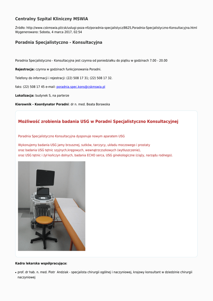 Centralny Szpital Kliniczny MSWiA Źródło: http://www.cskmswia.pl/csk/uslugi-poza-nfz/poradnia-specjalistycz/8625,Poradnia-Specjalistyczno-Konsultacyjna.html Wygenerowano: Sobota, 4 marca 2017, 02:54 Poradnia Specjalistyczno - Konsultacyjna Poradnia Specjalistyczno - Konsultacyjna jest czynna od poniedziałku do piątku w godzinach 7.00 - 20.00 Rejestracja: czynna w godzinach funkcjonowania Poradni. Telefony do informacji i rejestracji: (22) 508 17 31; (22) 508 17 32. faks: (22) 508 17 45 e-mail: [email protected] Lokalizacja: budynek S, na parterze Kierownik - Koordynator Poradni: dr n. med. Beata Borawska Możliwość zrobienia badania USG w Poradni Specjalistyczno Konsultacyjnej Poradnia Specjalistyczno Konsultacyjna dysponuje nowym aparatem USG Wykonujemy badania USG jamy brzusznej, sutków, tarczycy, układu moczowego i prostaty oraz badania USG tętnic szyjnych,kręgowych, wewnątrzczszkowych (wytłuszczenie), oraz USG tętnic i żył kończyn dolnych, badania ECHO serca, USG ginekologiczne (ciąży, narządu rodnego). Kadra lekarska wspólpracująca: ● prof. dr hab. n. med. Piotr Andziak - specjalista chirurgii ogólnej i naczyniowej, krajowy konsultant w dziedzinie chirurgii naczyniowej ● prof. dr hab. n.med. Robert Gil – specjalista chorób wewnętrznych, kardiolog ● prof. dr hab. n. med. Artur Jakimiuk - specjalista ginekolog-położnik, specjalista ginekologii onkologicznej ● prof. dr hab. n. med. Józef Jethon - specjalista chirurgii plastycznej ● prof. dr hab. n. med. Ireneusz Kotela - specjalista ortopedii traumatologii ● prof. dr hab. n. med. Michał Powolny - specjalista ginekolog-położnik, specjalista anestezjologii i intensywnej terapii ● prof. dr hab. n. med. Grażyna Rydzewska – specjalista chorób wewnętrznych i gastroenterologii ● prof.dr hab. n. med. Andrzej Rydzewski - specjalista chorób wewnętrznych, nefrolog, transplantolog kliniczny ● prof. dr hab. n. med. Małgorzata Wisłowska - specjalista w dziedzinie hipertensjologii, reumatologii, chorób wewnętrznych, rehabilitacji medycznej ● dr n. med. Anna Barańska - starszy asystent, specjalista chorób wewnętrznych, specjalista kardiolog ● dr n. med. Zbigniew Biejat - specjalista chirurgii naczyniowej ● lek. med. Ewa Bogusławska - Strój - specjalista w dziedzinie chorób wewnętrznych i chemioterapii nowotworów ● dr n. med. Tadeusz Budlewski - specjalista chorób wewnętrznych, medycyny nuklearnej i endokrynologii ● dr. n. med. Joanna Ciołek - specjalista w dziedzinie chorób wewnętrznych i endokrynologi ● dr n. med. Małgorzata Chodakowska-Żebrowska - specjalista neurolog ● dr n.med. Paweł Dobrzyński - specjalista otoloaryngolog ● dr n. med. Małgorzata Dorobek – specjalista neurolog ● dr n. med. Andrzej Gietka - specjalista chorób wewnętrznych, chorób zakaźnych, reumatologii ● dr n. med. Mariusz Głowacki - specjalista neurochirurgii ● dr n. med. Mariusz Janczarski - specjalista w dziedzinie chorób wewnętrznych i hematologii ● dr hab. n. med. Dariusz A. Kosior - specjalista chorób wewnętrznych, kardiolog ● dr n. med. Bogusław Kostkiewicz - specjalista neurochirurg i neurotraumatolog ● dr n. med. Tomasz Krzymiński - starszy asystent, specjalista neurochirurgii i neurotraumatologii ● dr n. med. Jerzy Mieszkowski - specjalista neurolog ● dr n. med. Andrzej Perzanowski - starszy asystent, specjalista chorób wewnętrznych ● dr n. med. Anna Pfeffer-Baczuk - specjalista neurolog ● dr n. med. Elżbieta Radzikowska, specjalista chirurgii plastycznej, specjalista chirurgii ogólnej ● dr n. med. Elwira Stasiakowska - Badura - specjalista chorób wewnętrznych, kardiolog, hipertensjolog ● dr n. med. Michał Śpiegowski - starszy asystent, specjalista chirurgii ogólnej ● dr n. med. Lucyna Zaremba-Fabijańska - starszy asystent, specjalista chorób wewnętrznych, specjalista mikrobiologii, specjalista medycyny nuklearnej ● dr n. med. Piotr Żbikowski - starszy asystent, specjalista ortopeda traumatolog ● mgr Anna Holak - Puczyńska - młodszy asystent, psycholog ● mgr Katarzyna Kosałka - dietetyk kliniczny ● mgr Angelika Maciejewska - młodszy asystent, psycholog ● lek. med. Dorota Baczewska- Mazurkiewicz – specjalista chorób wewnętrznych i gastroenterologii ● lek. med. Tomasz Chełchowski – specjalista chirurgii ogólnej ● lek. med. Ewa Klimczak- starszy asystent, specjalista chorób wewnętrznych, specjalista reumatologii ● lek. med. Karolina Kolasińska - specjalista w dziedzinie chorób wewnętrznych i endokrynologi ● lek. med. Przemysław Kołakowski - starszy asystent, specjalista ortopedii i traumatologii ● lek. med. Bożena Kowalska - Sordyl - starszy asystent, specjalista chorób płuc ● lek. med. Agnieszka Krawczyńska - specjalista chorób wewnętrznych i gastroenterologii ● lek. med. Robert Leśniewski - starszy asystent, specjalista chorób wewnętrznych ● lek. med. Marta Matejak - Górska – specjalista chirurgii ogólnej, specjalista transplantologii klinicznej ● lek. med. Edward Mroczkowski - starszy asystent, specjalista otolaryngologii, specjalista alergologii ● lek. med. Tomasz Niemirka - specjalista chorób wewnętrznych, kardiolog ● lek. med. Magdalena Pawlik – specjalista chorób wewnętrznych i gastroenterologii ● lek. med. Joanna Podgórska - starszy asystent, specjalista chorób wewnętrznych, chorób zakaźnych i reumatologii ● lek. med. Cezary Rajtar - otolaryngolog ● lek. med. Andrzej Ruszczak - specjalista II stopnia w dziedzinie ortopedii i traumatologii ● lek. med. Dariusz Sadlik – specjalista dermatolog-wenerolog ● lek. med. Agnieszka Serwacka – specjalista chorób wewnętrznych, nefrolog ● lek. med. Elżbieta Tiomkin - Jarska - asystent, specjalista chorób wewnętrznych ● lek. med. Ewa Wasilewska - starszy asystent, specjalista położnictwa i ginekologii ● lek. med. Anna Wojewódzka - starszy asystent, specjalista chorób wewnętrznych, s