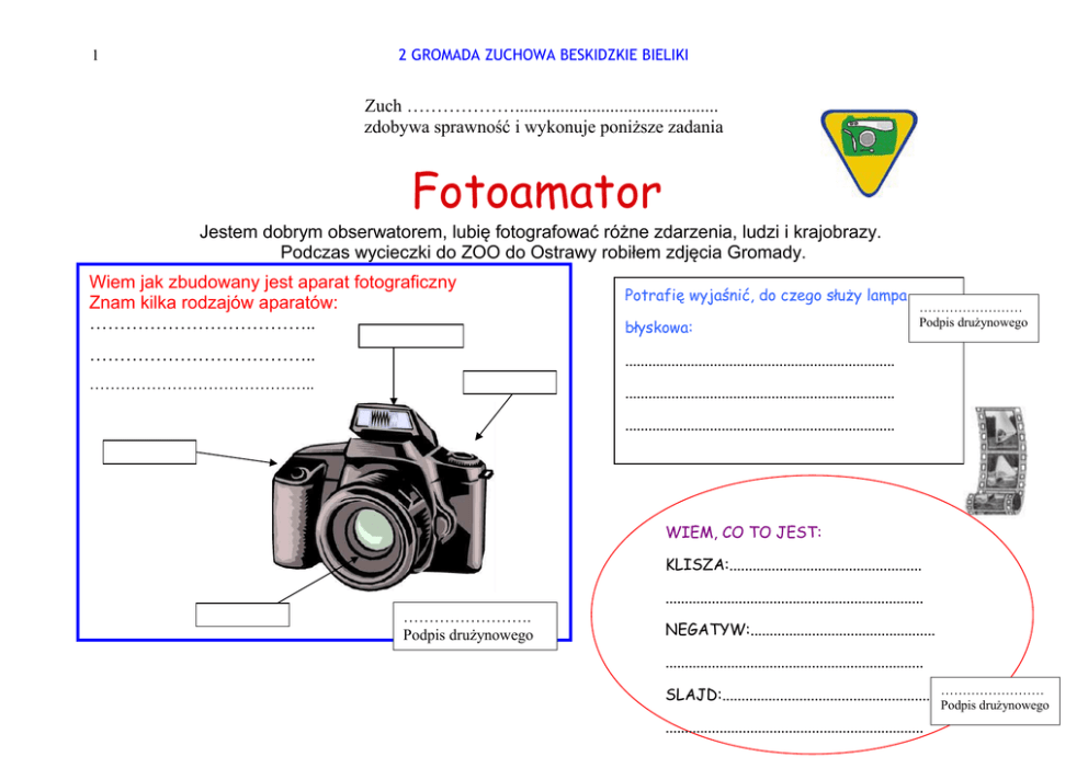 2 GROMADA ZUCHOWA BESKIDZKIE BIELIKI 1 Zuch ………………............................................. zdobywa sprawność i wykonuje poniższe zadania Fotoamator Jestem dobrym obserwatorem, lubię fotografować różne zdarzenia, ludzi i krajobrazy. Podczas wycieczki do ZOO do Ostrawy robiłem zdjęcia Gromady. Wiem jak zbudowany jest aparat fotograficzny Znam kilka rodzajów aparatów: ……………………………….. Potrafię wyjaśnić, do czego służy lampa błyskowa: ……………………………….. ...................................................................... …………………………………….. ...................................................................... …………………… Podpis drużynowego ...................................................................... ....................................................................... WIEM, CO TO JEST: KLISZA:.................................................. ................................................................... ……………………. Podpis drużynowego NEGATYW:................................................ ................................................................... SLAJD:....................................................... …………………… Podpis drużynowego ................................................................... 2 2 GROMADA ZUCHOWA BESKIDZKIE BIELIKI Zdjęcia z wycieczki do ZOO wywołałem i przekazałem do kroniki lub wysłałem drużynowemu do wstawienia na stronę gromady. ……………………. Podpis drużynowego Zrobiłem zdjęcie artystyczne w ZOO w Ostrawie i pokazałem go innym zuchom. ……………………. Podpis drużynowego